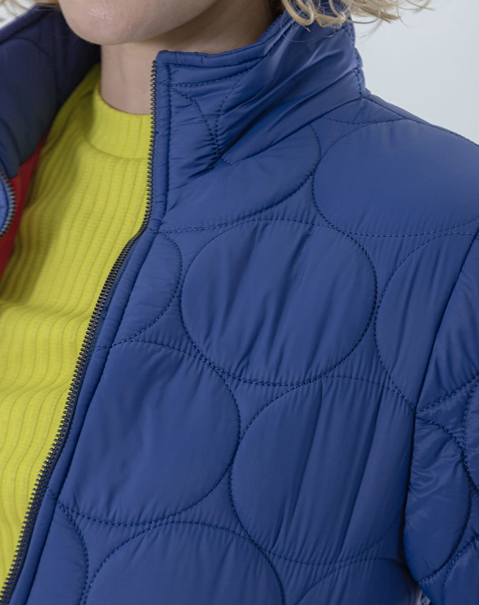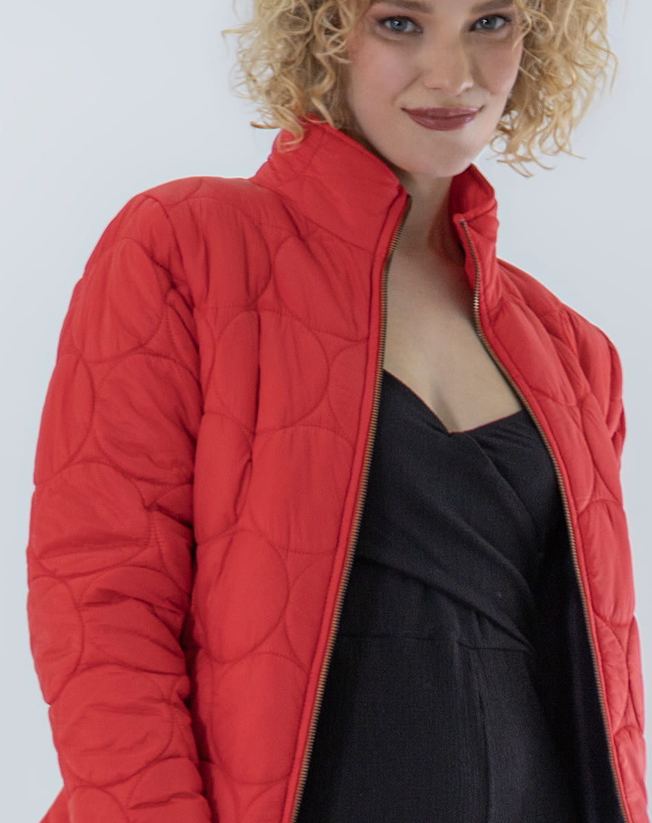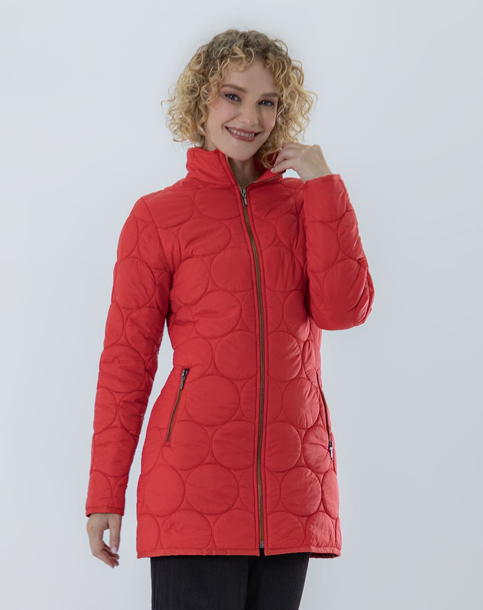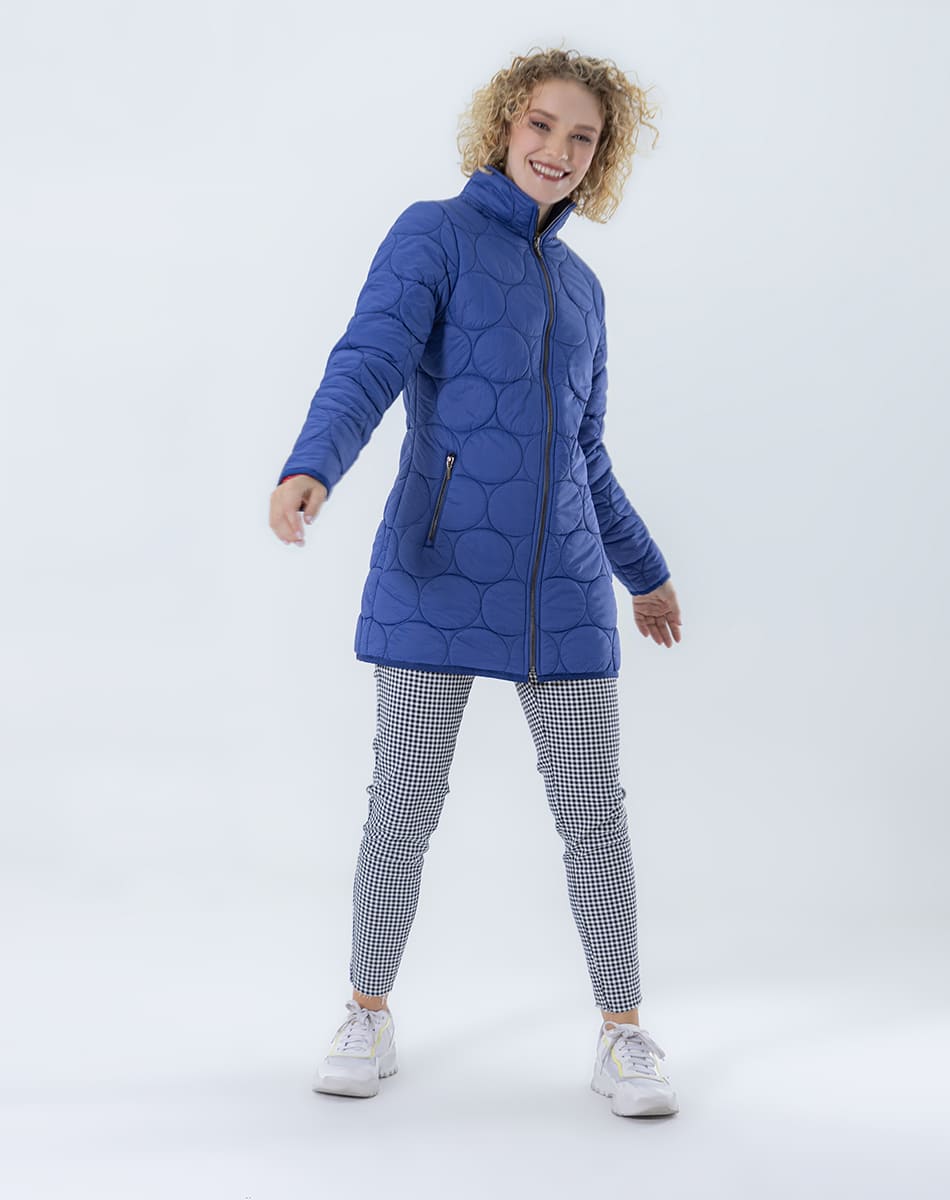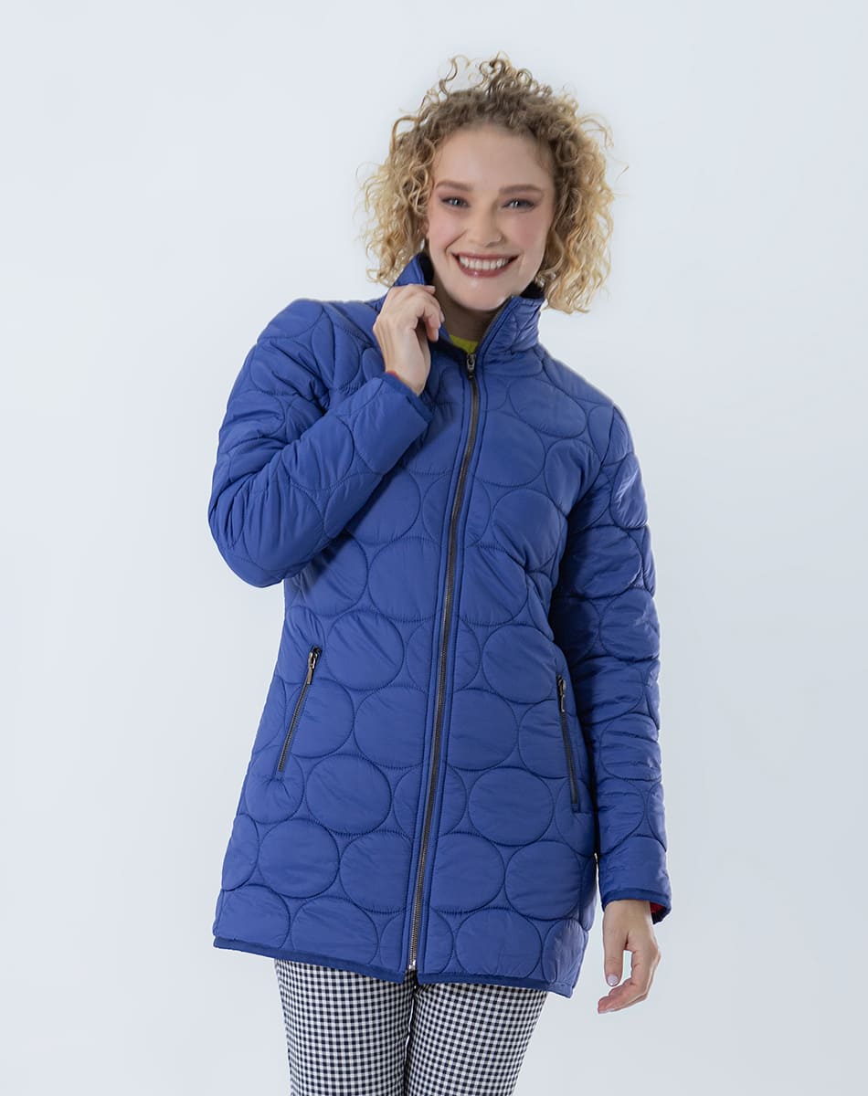 Tela capitonado.Cuello alto.Con cierre al frente.Cierre en bolsas.Composición 100% poliester.