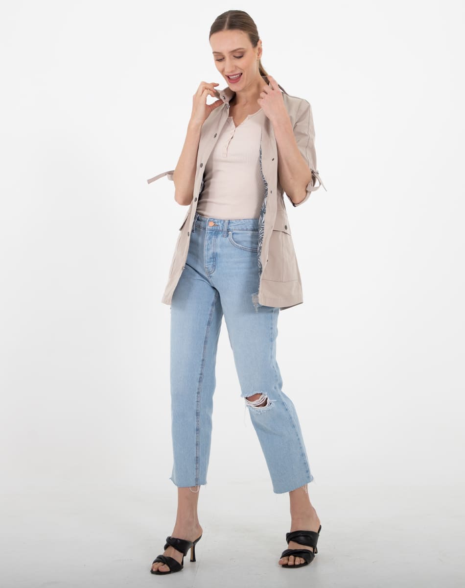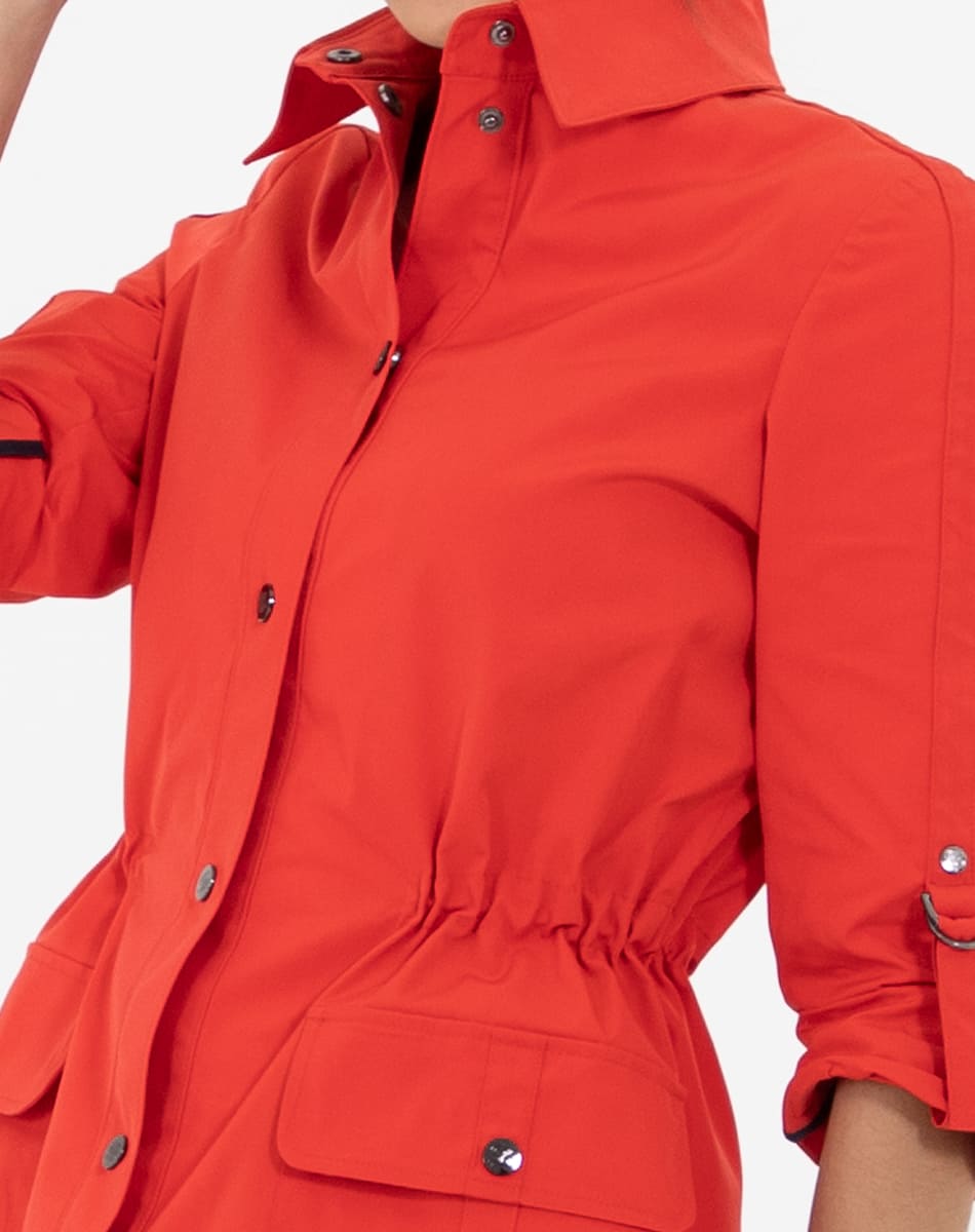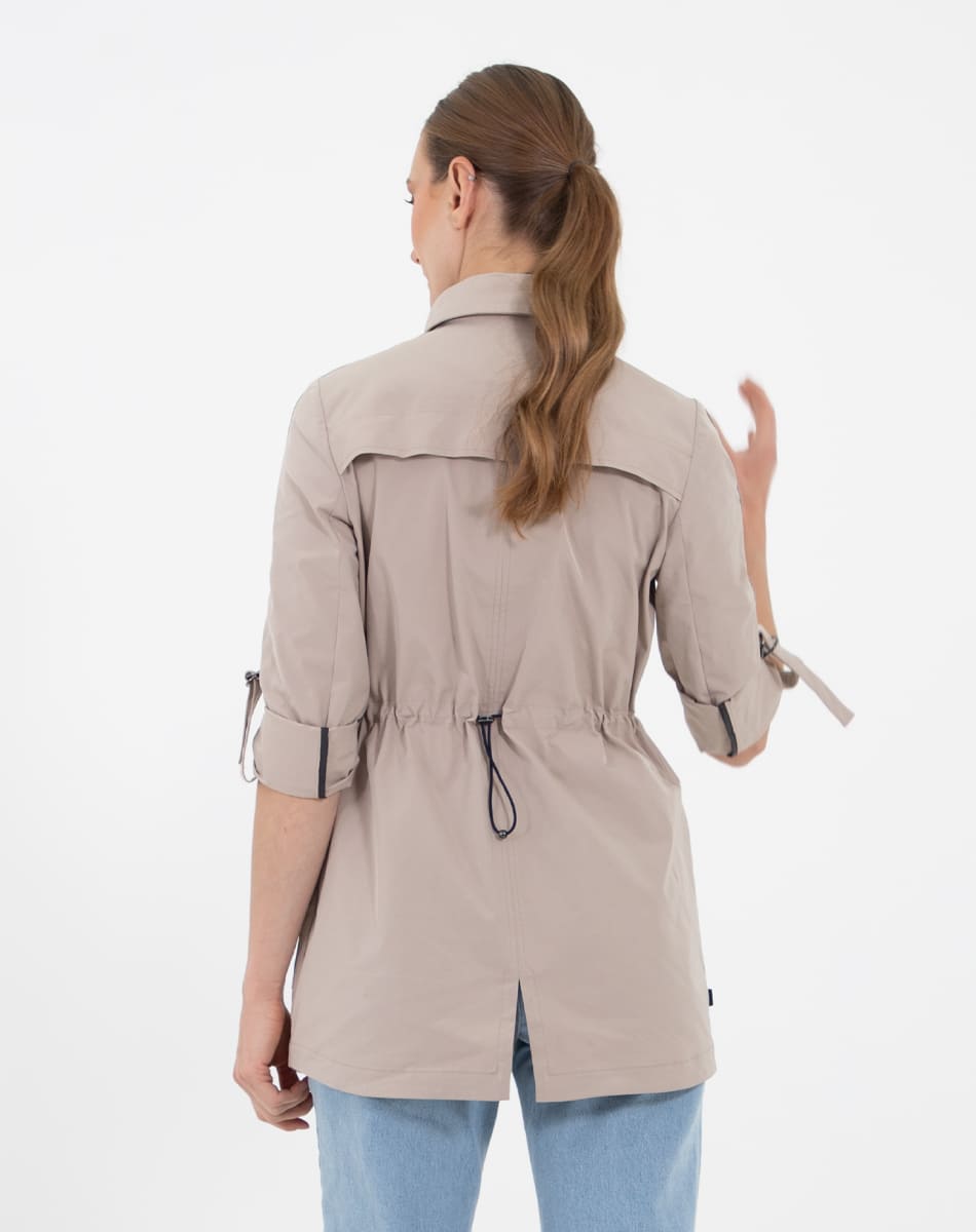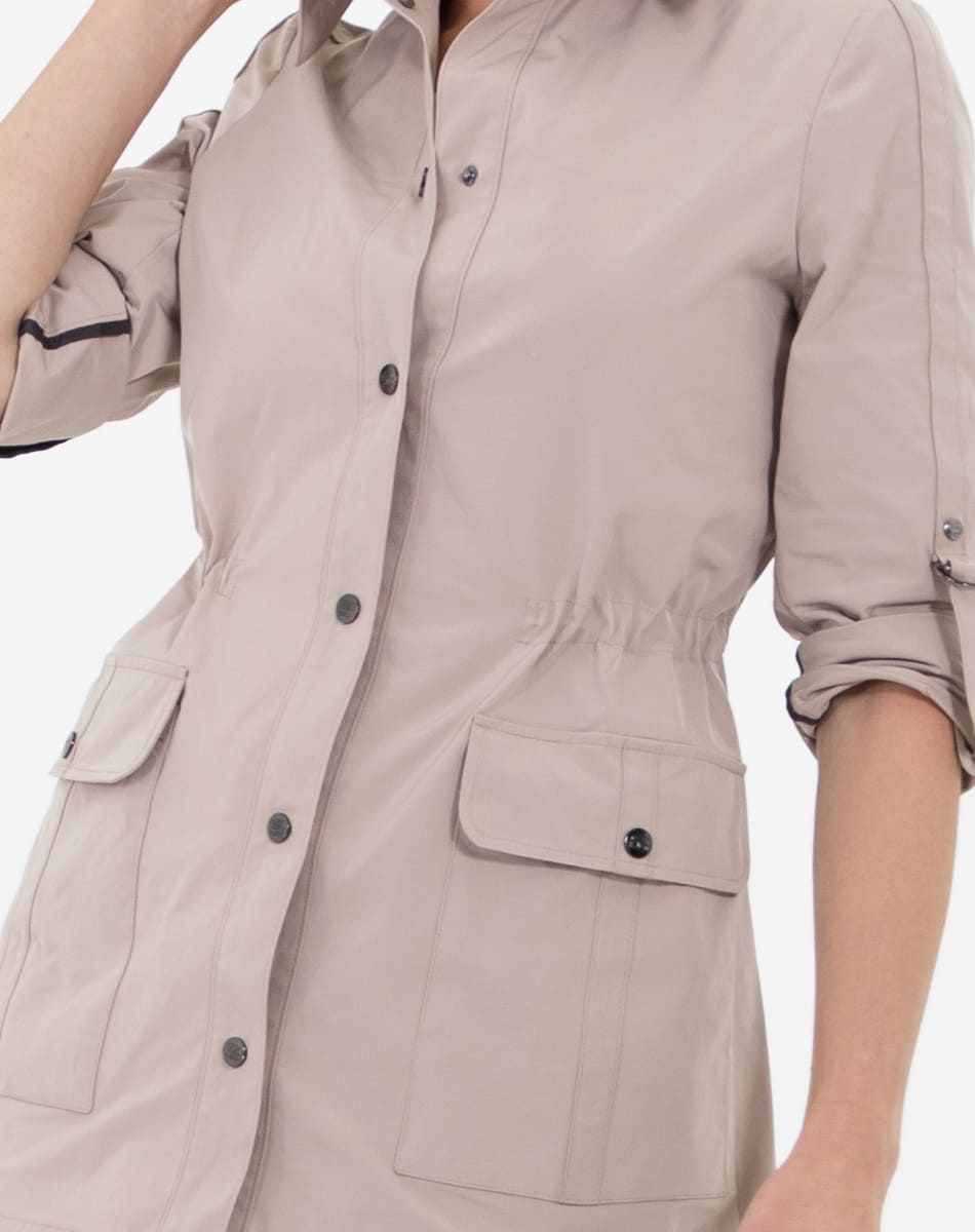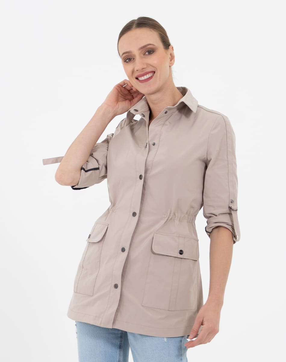 Esta Gabardina Larga casual es fácil de combinar con cualquier atuendo gracias su diseño con cuello y broches al frente.
