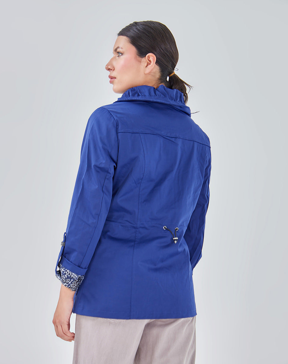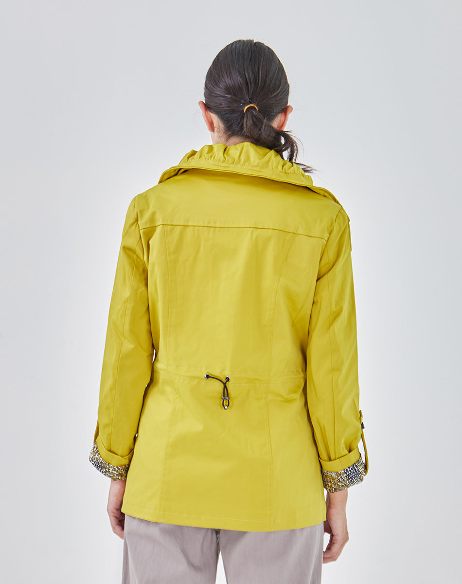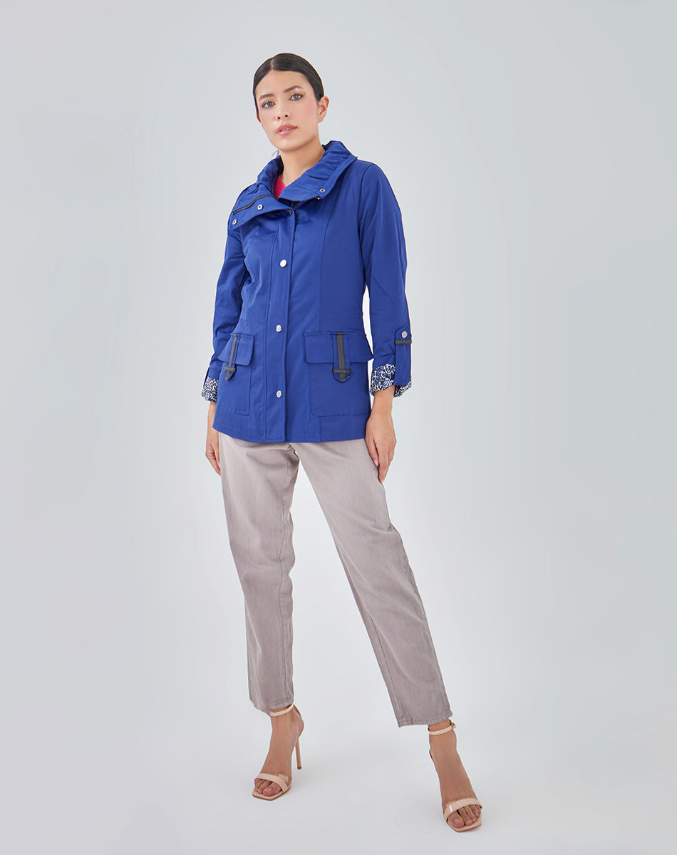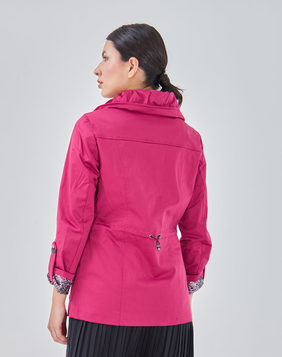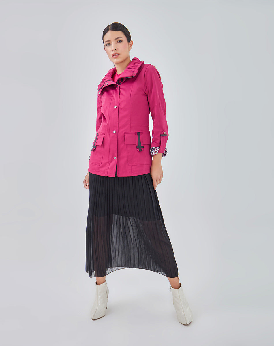 Completa tu look con estilo y sofisticación con nuestra gabardina con cuello plisado. Con broches elegantes en la parte frontal y una jareta ajustable en la cintura, esta gabardina te ofrece un ajuste personalizado y favorecedor.