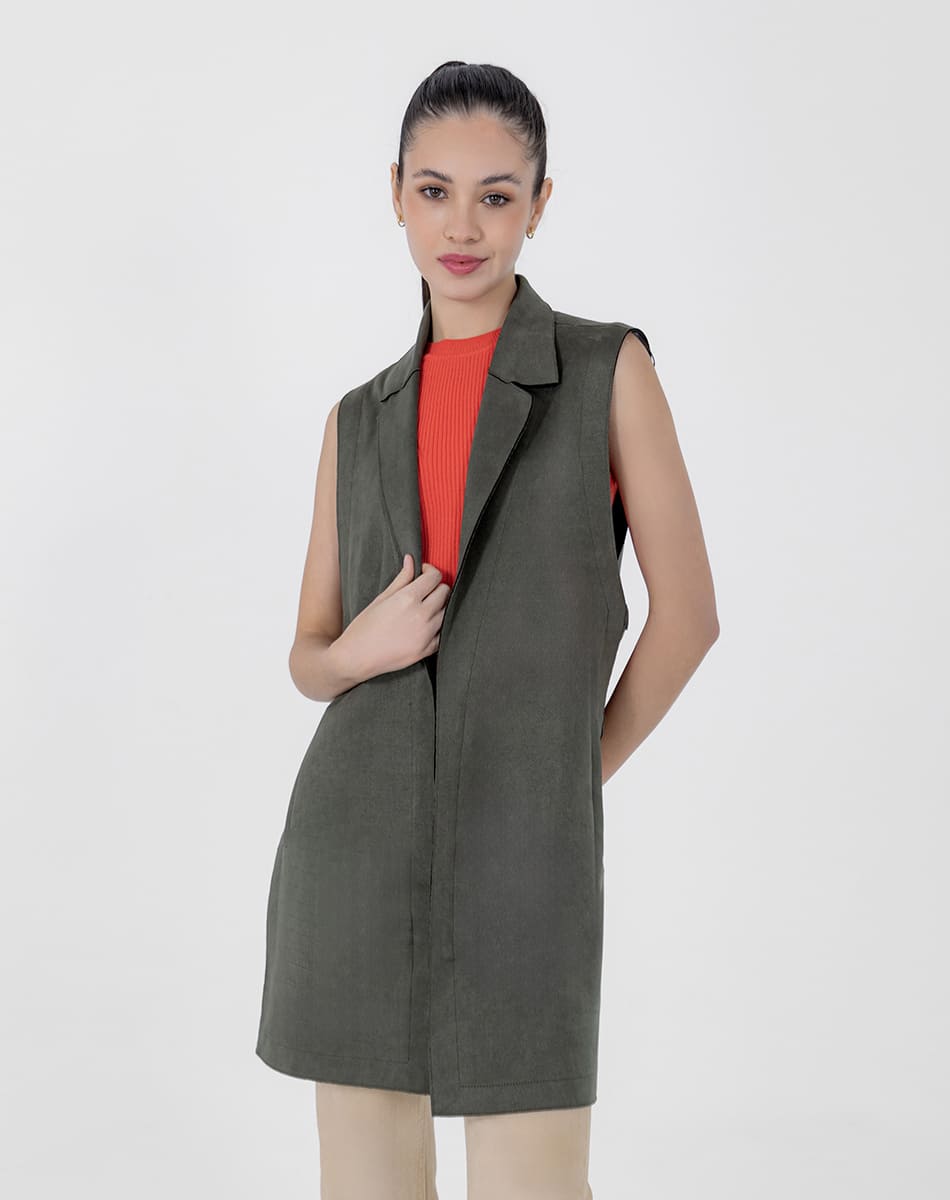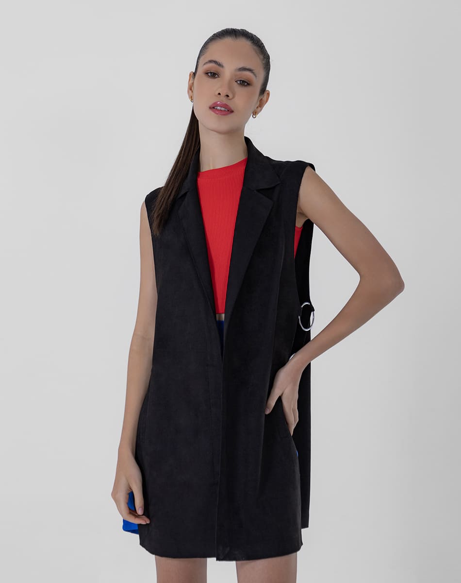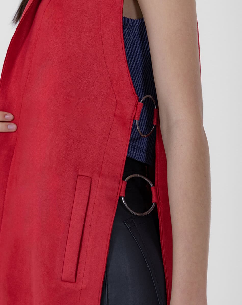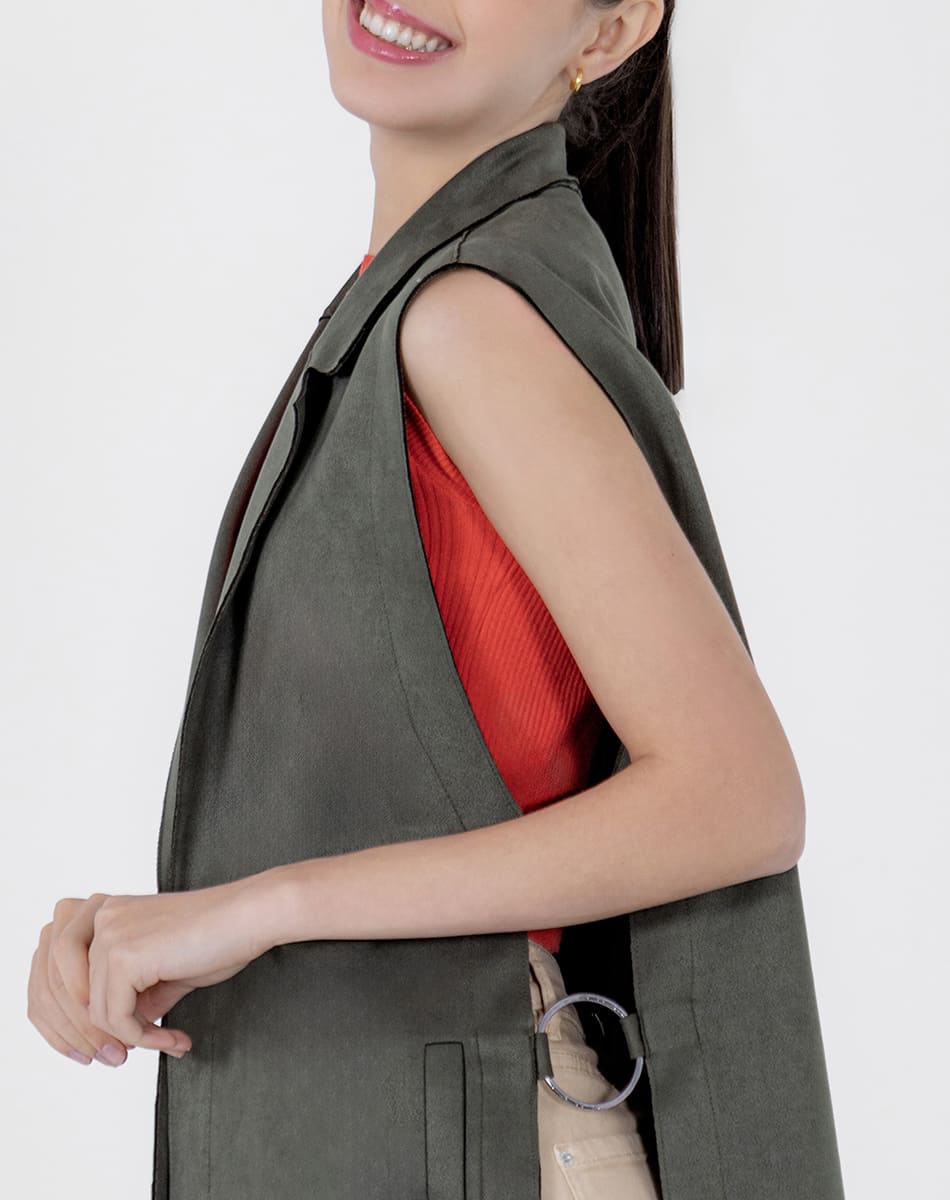 Confeccionado en suave suede, este chaleco presenta un diseño sin mangas y una silueta alargada que cae fluidamente sobre el cuerpo, brindando una sensación de elegancia y comodidad.