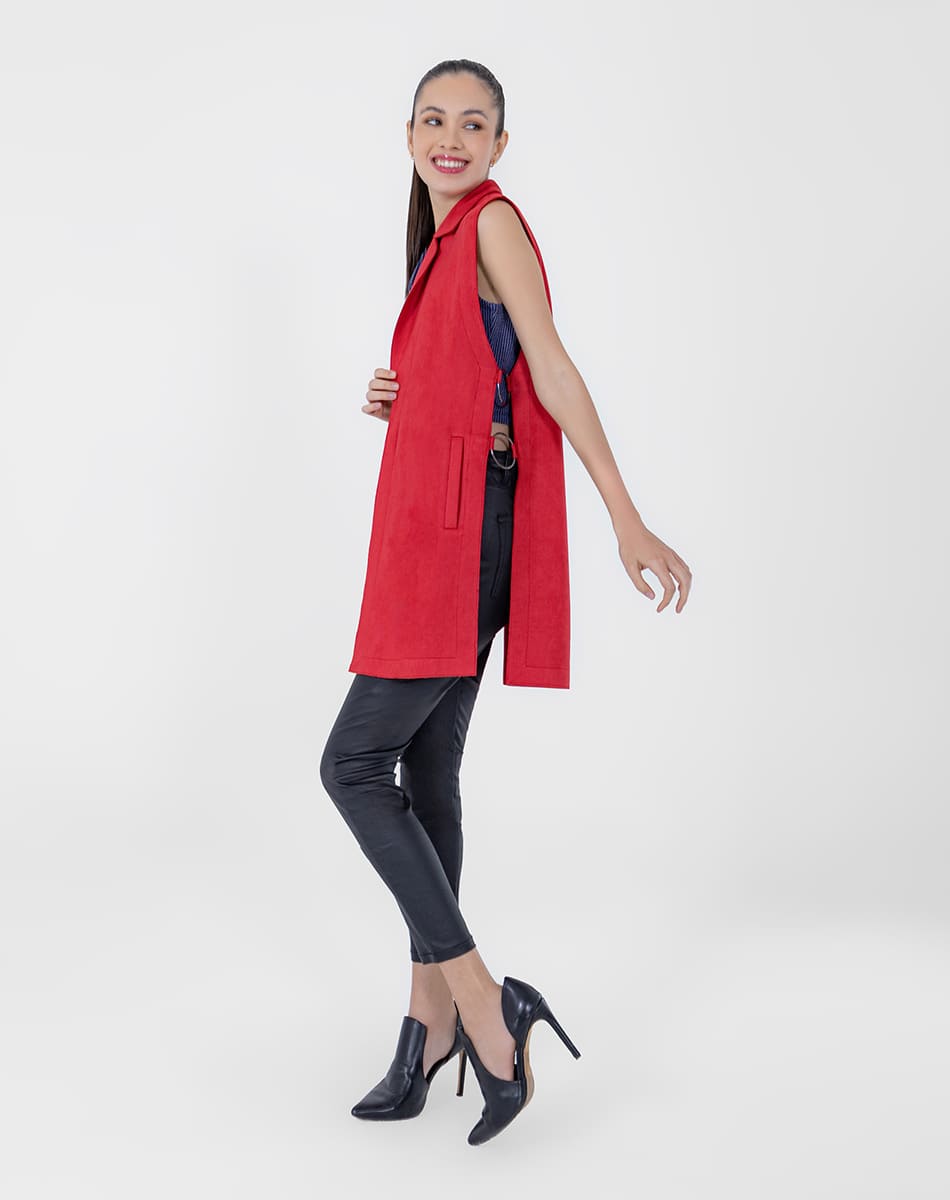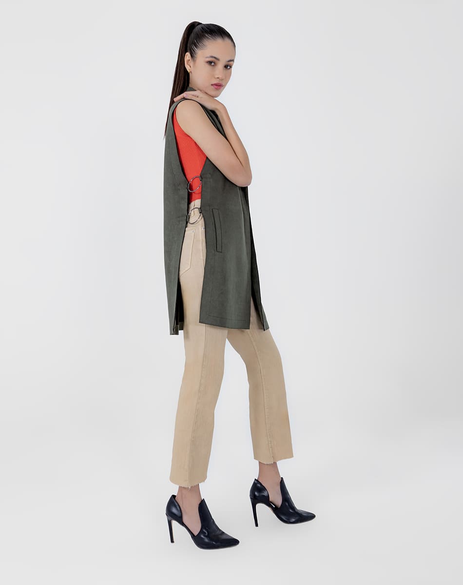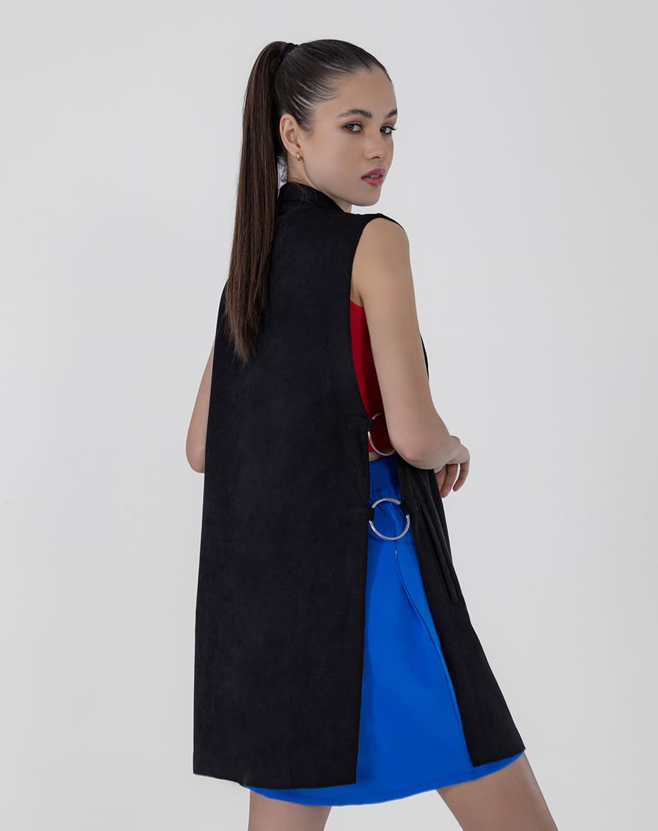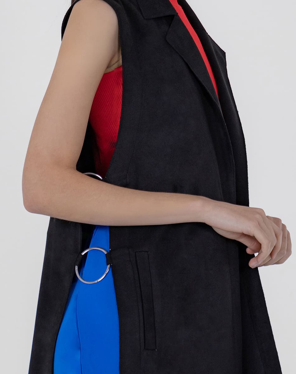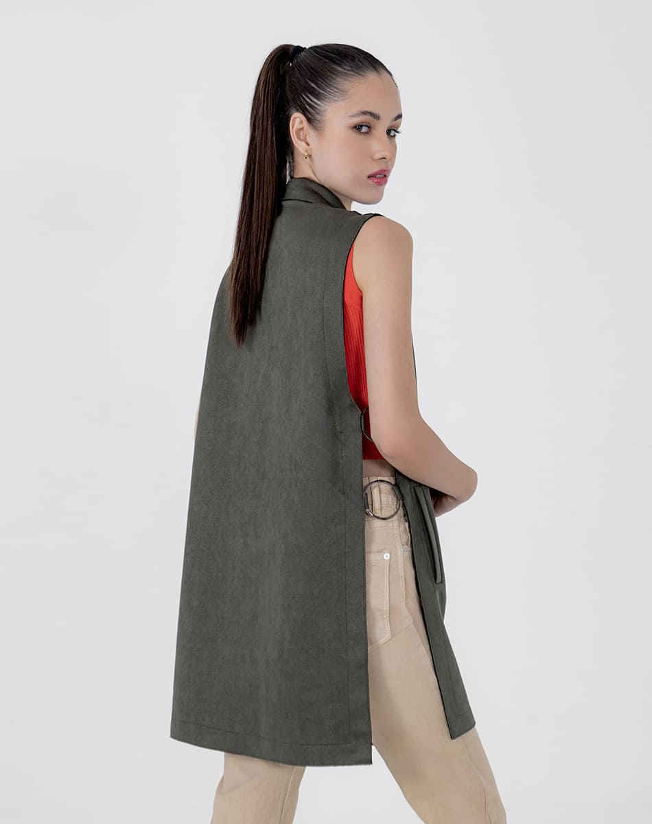 Confeccionado en suave suede, este chaleco presenta un diseño sin mangas y una silueta alargada que cae fluidamente sobre el cuerpo, brindando una sensación de elegancia y comodidad.