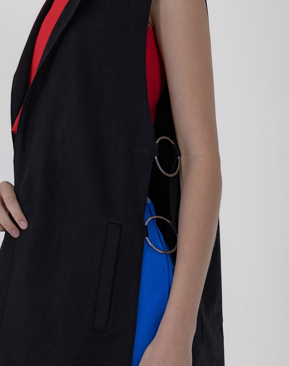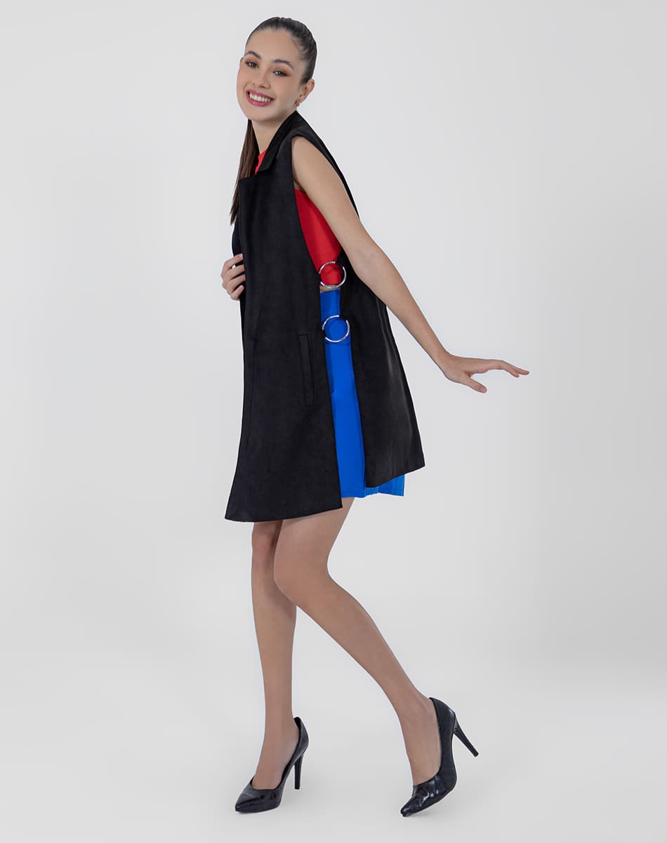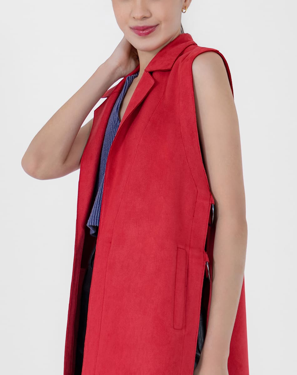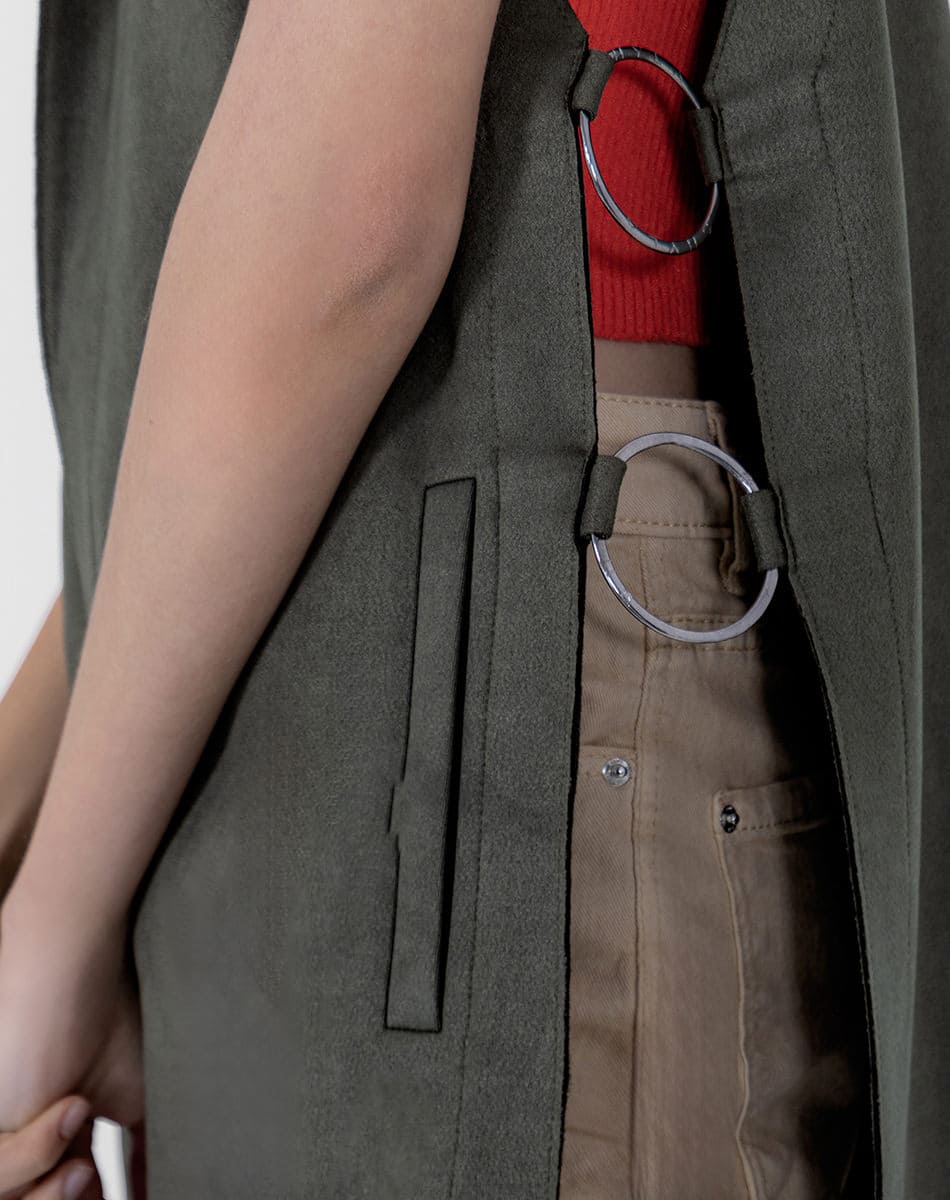 Confeccionado en suave suede, este chaleco presenta un diseño sin mangas y una silueta alargada que cae fluidamente sobre el cuerpo, brindando una sensación de elegancia y comodidad.