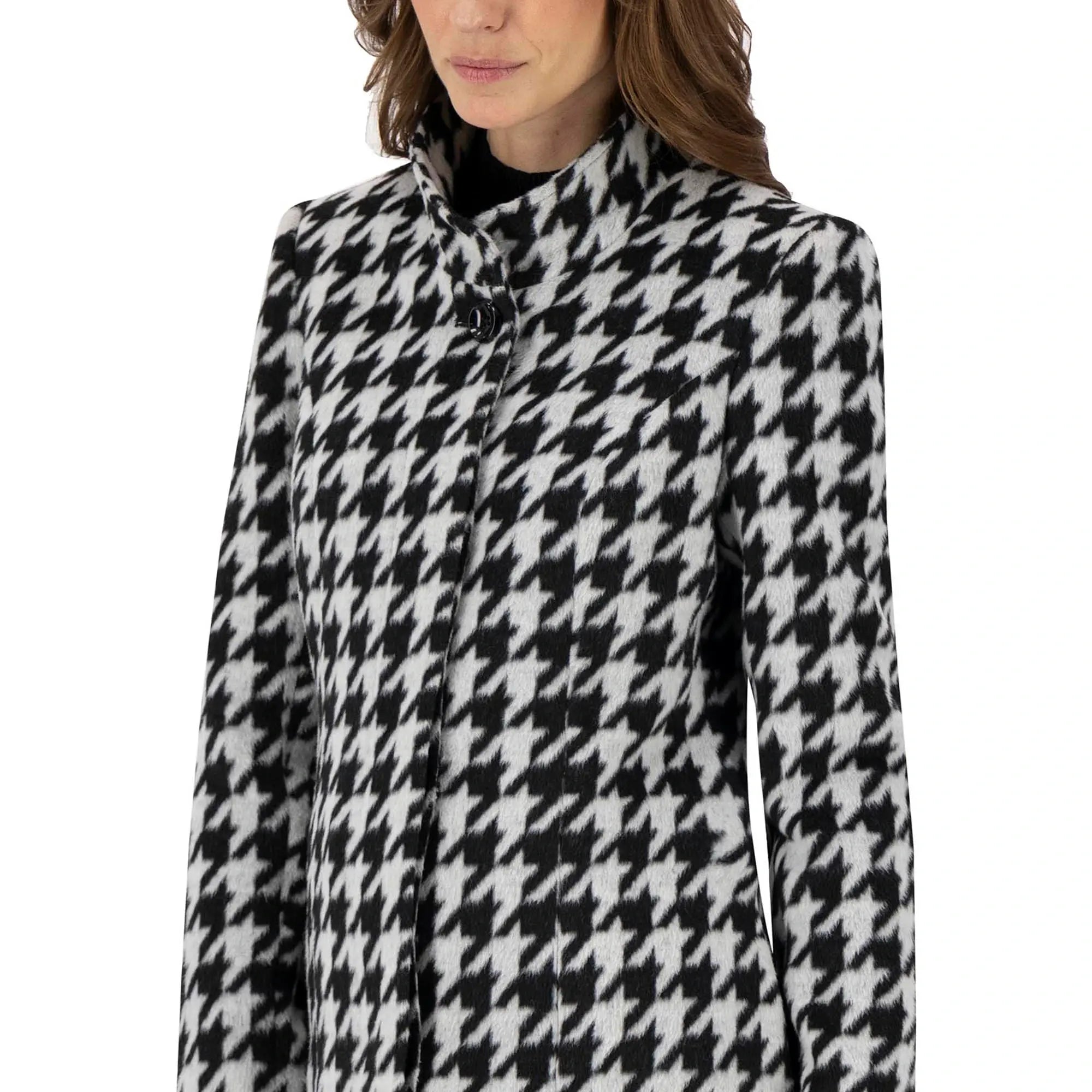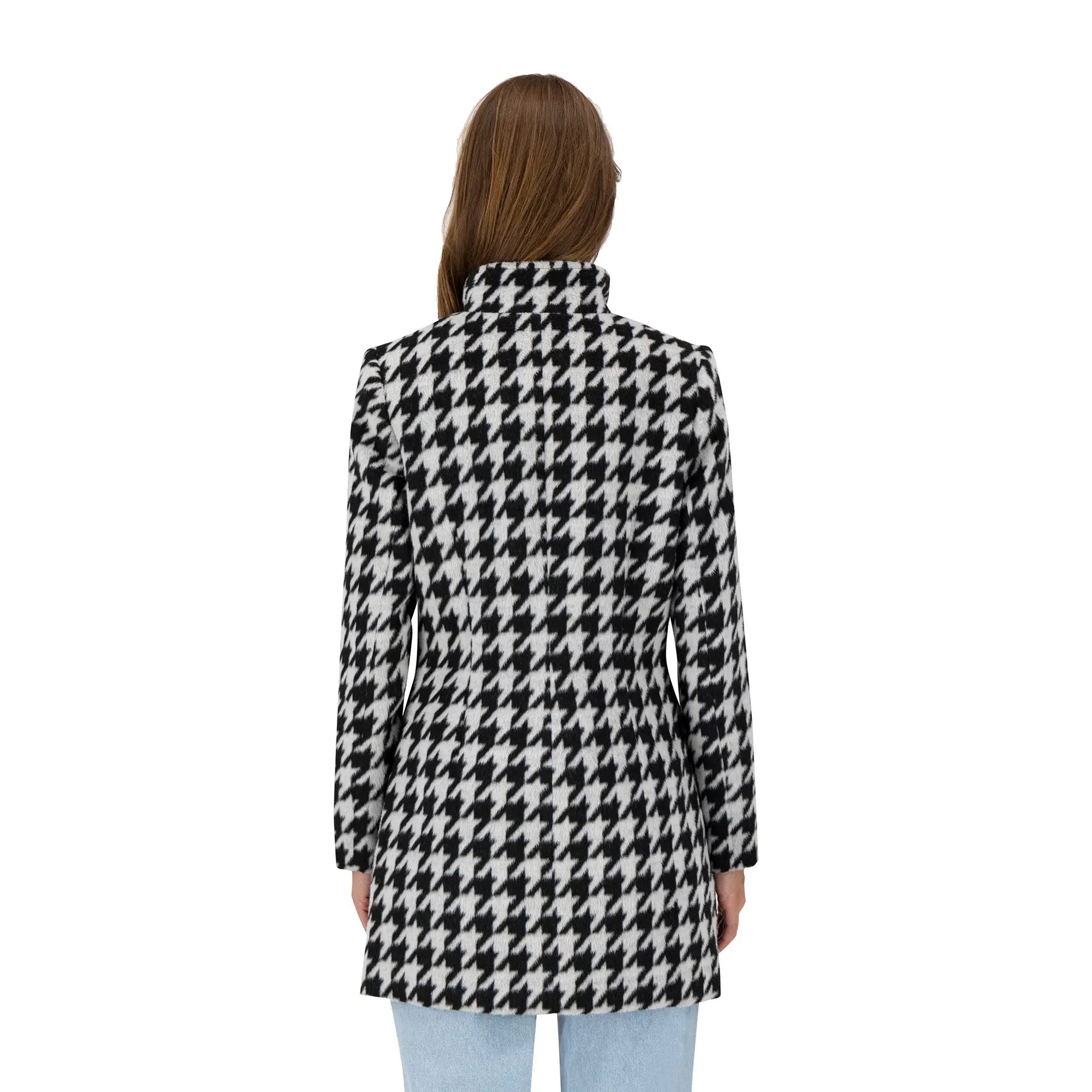 Este abrigo largo con patrón pata de gallo es una pieza atemporal que añade distinción a cualquier guardarropa. Su diseño incluye un cuello alto y botones ocultos que aportan un aire elegante, mientras que su corte recto favorece la figura. Ideal para realzar tus conjuntos de invierno con un toque sofisticado, ya sea en eventos formales o para dar un aire chic a tus looks cotidianos.