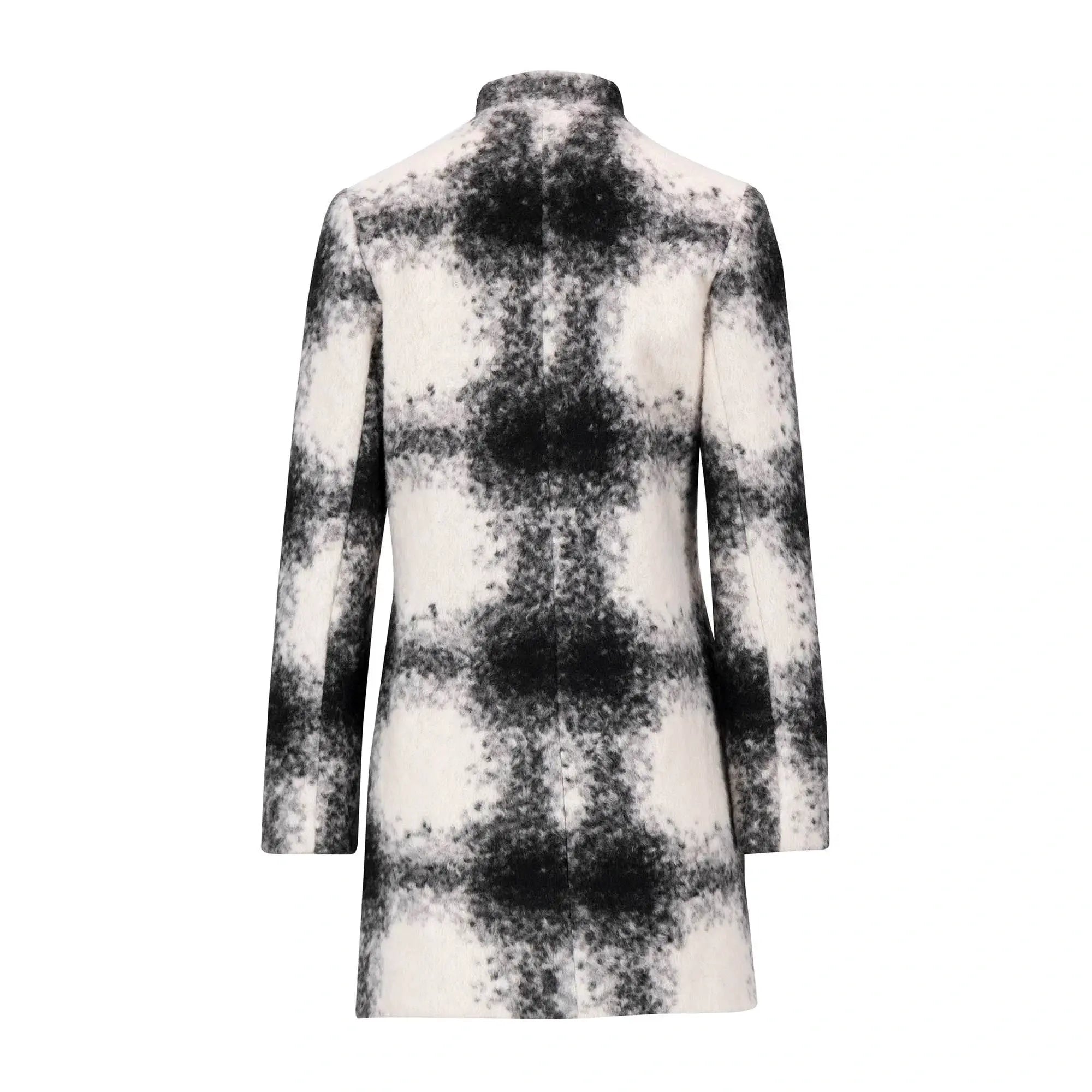 Este abrigo para mujer se caracteriza por su exclusivo patrón de cuadros difuminados en blanco y negro, que ofrece un estilo contemporáneo y elegante. Su corte recto y el cuello mao realzan la figura, mientras que los bolsillos laterales combinan practicidad con sofisticación. Perfecto para quienes desean un atuendo moderno y con carácter en los días fríos.
