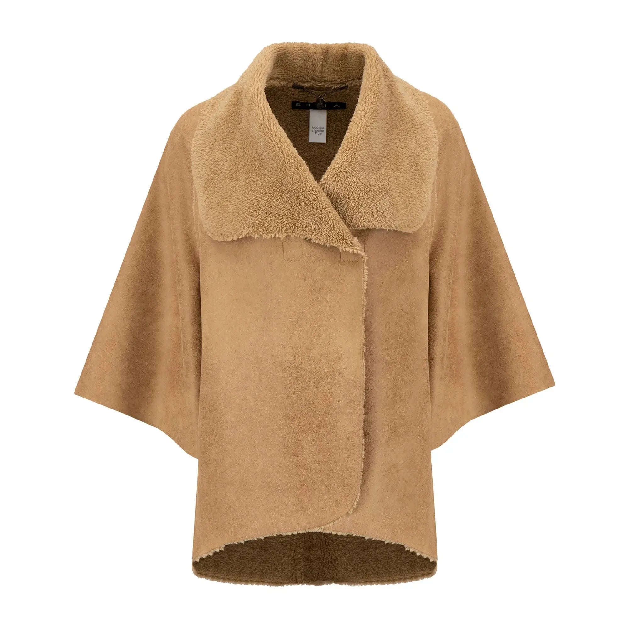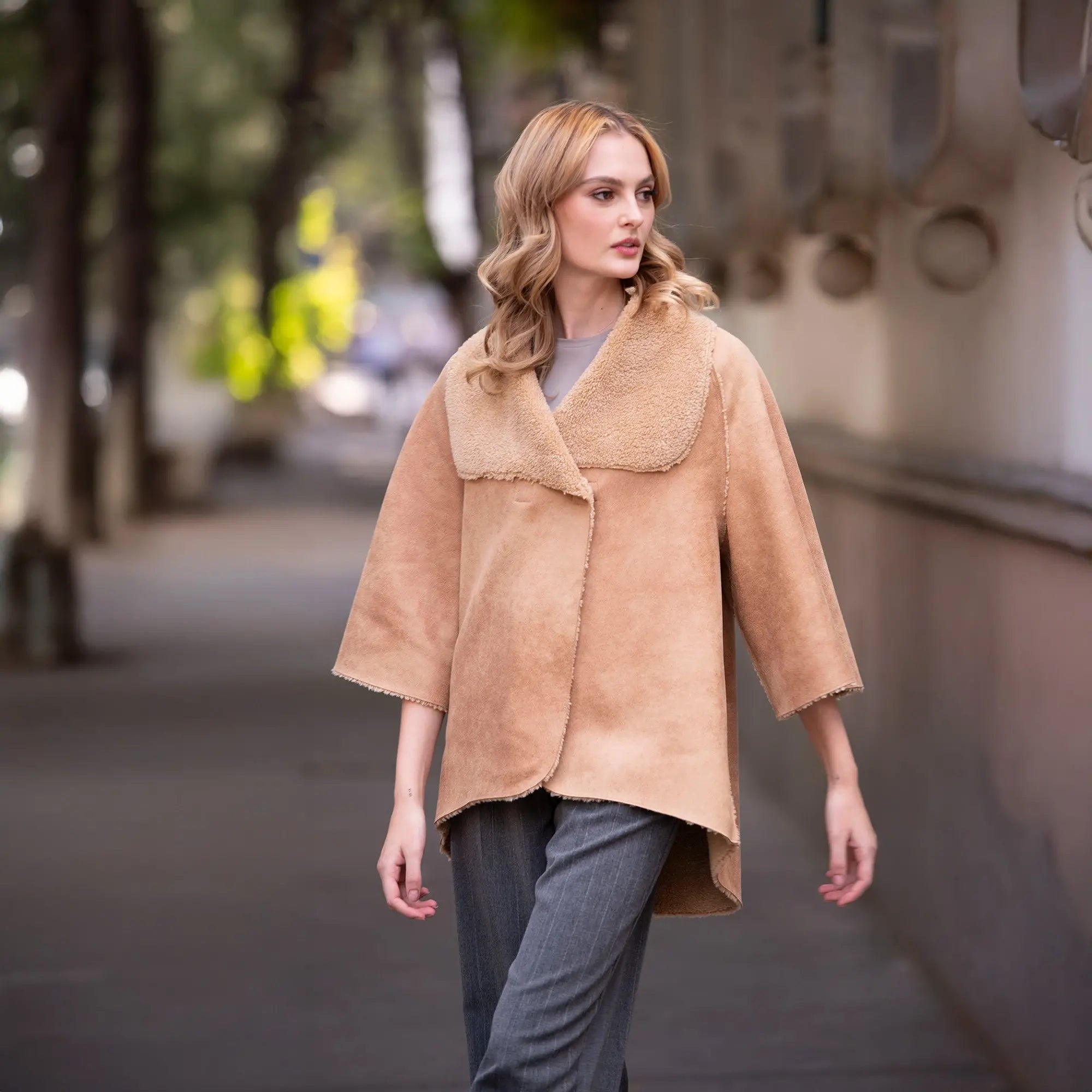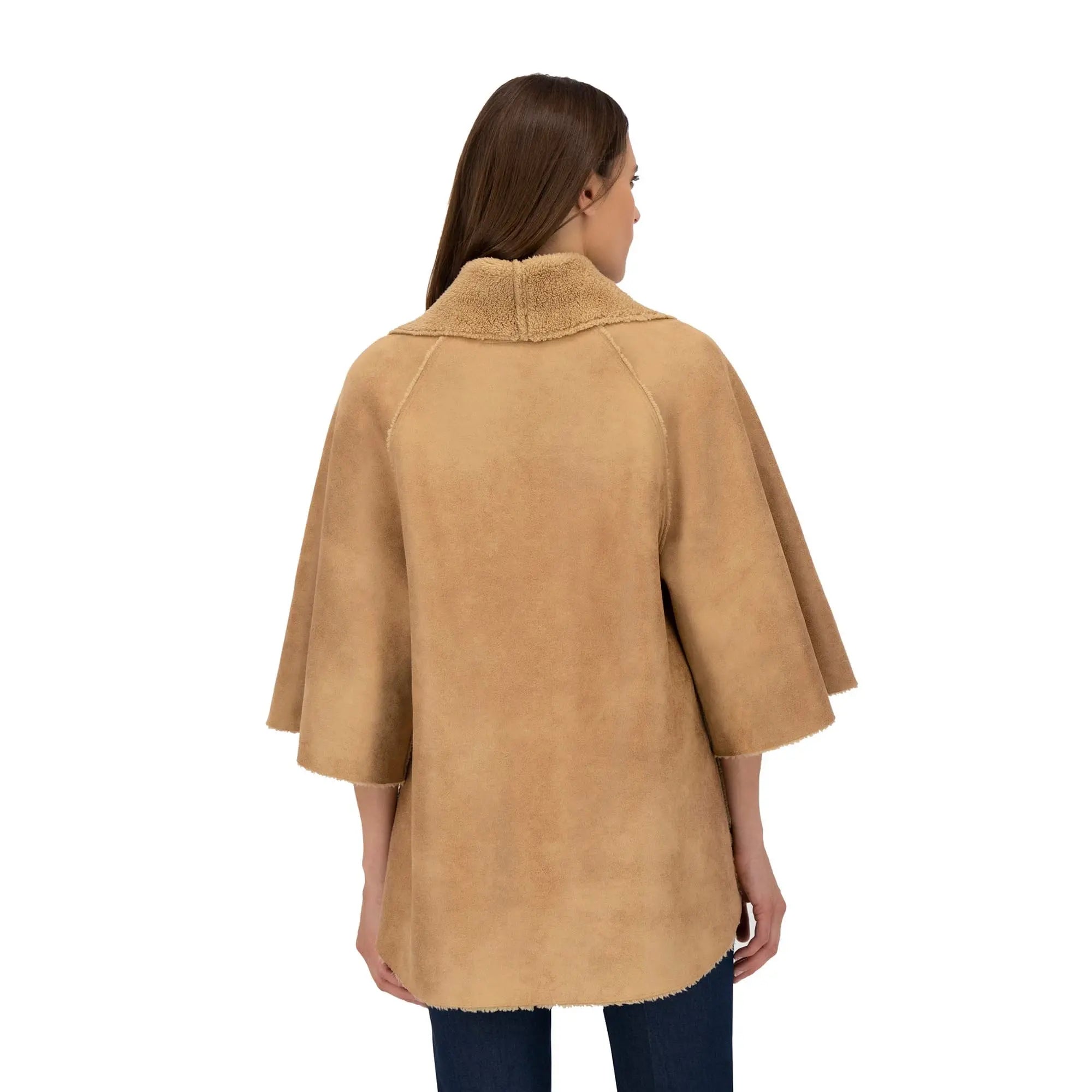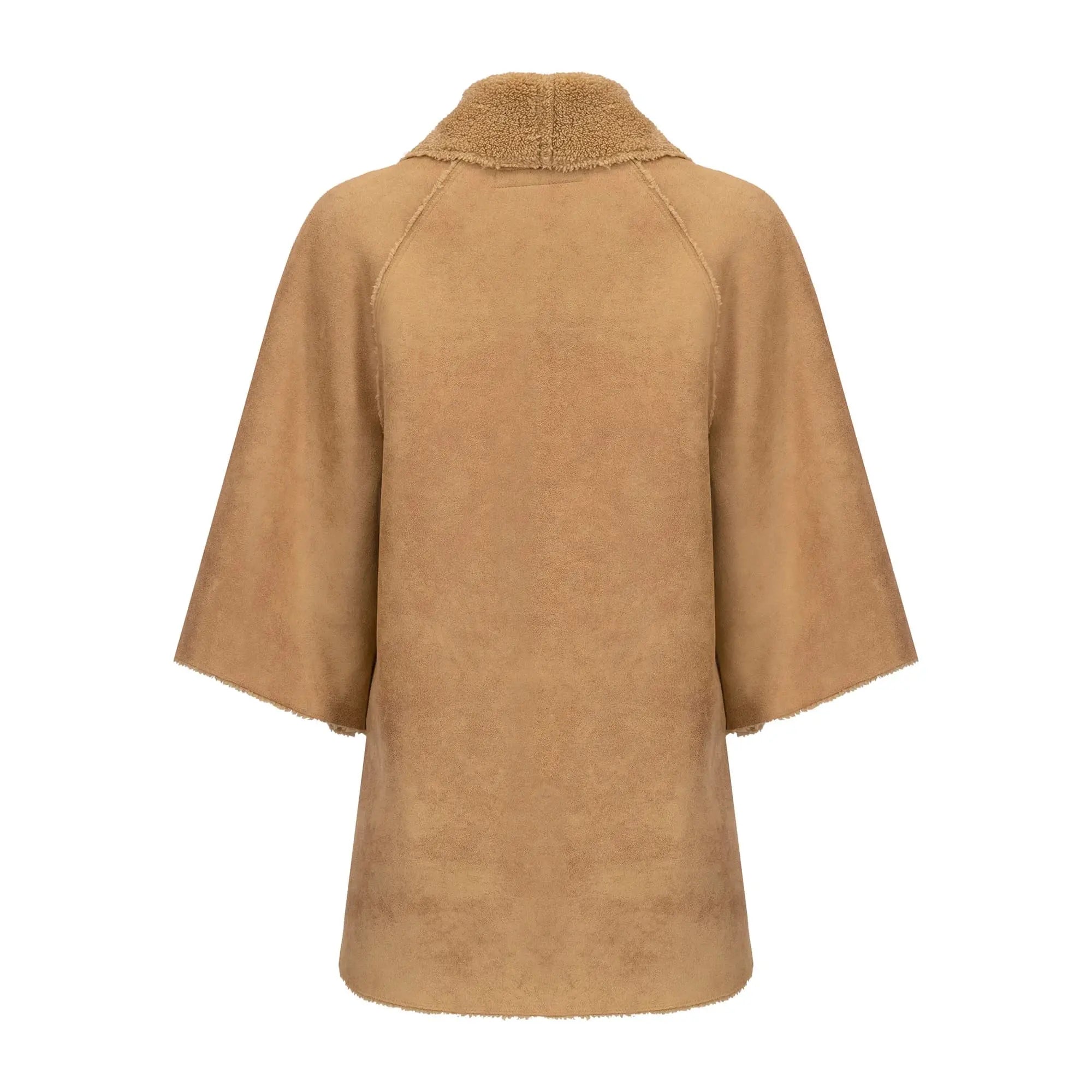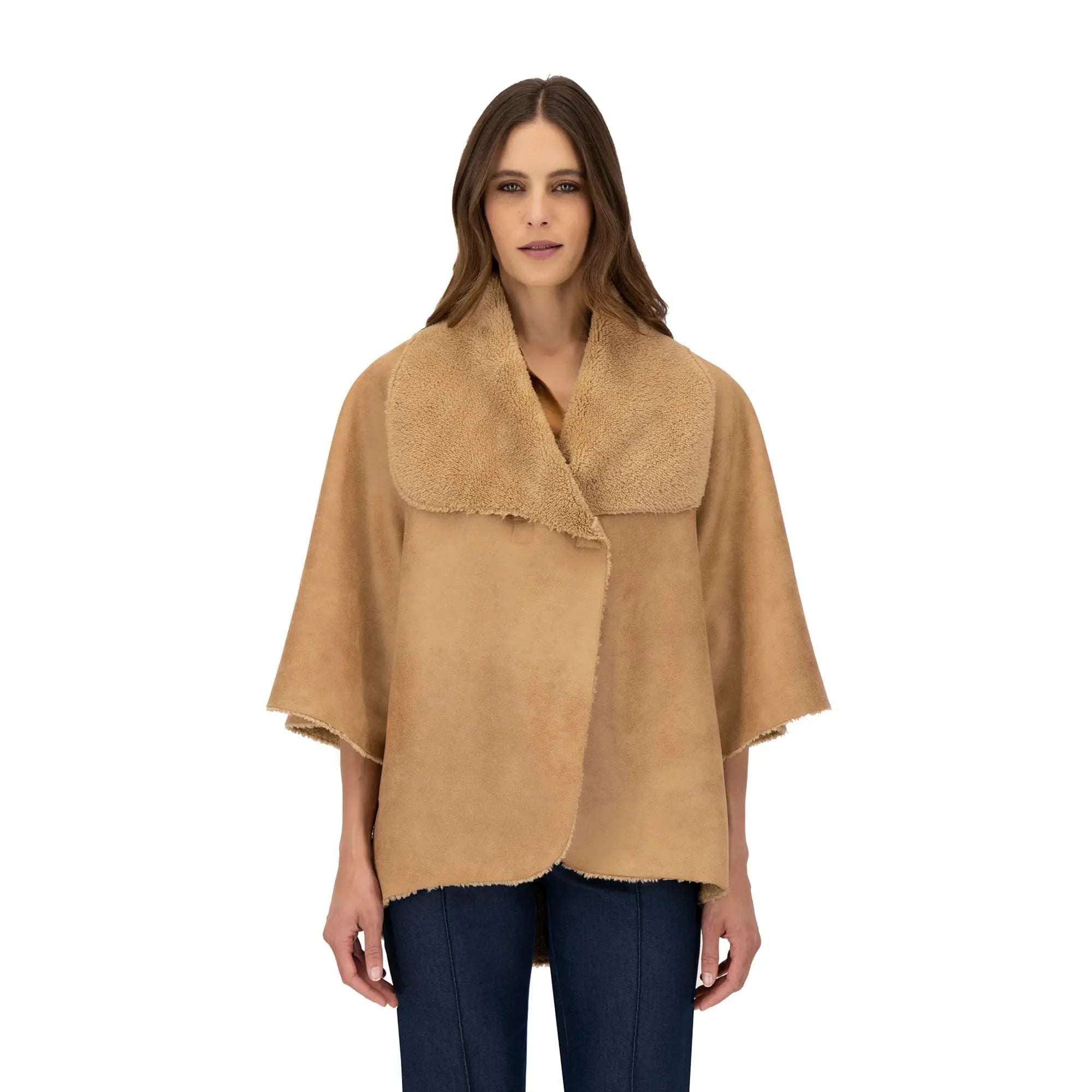 Esta capa presenta un diseño clásico y sofisticado, complementado con un cuello amplio estilo borrego que aporta calidez y confort. Su corte abierto y su caída ligera garantizan libertad de movimiento y comodidad, mientras que su textura suave mantiene un estilo elegante. Perfecta para combinar en outfit casuales o más formales durante los días frescos.