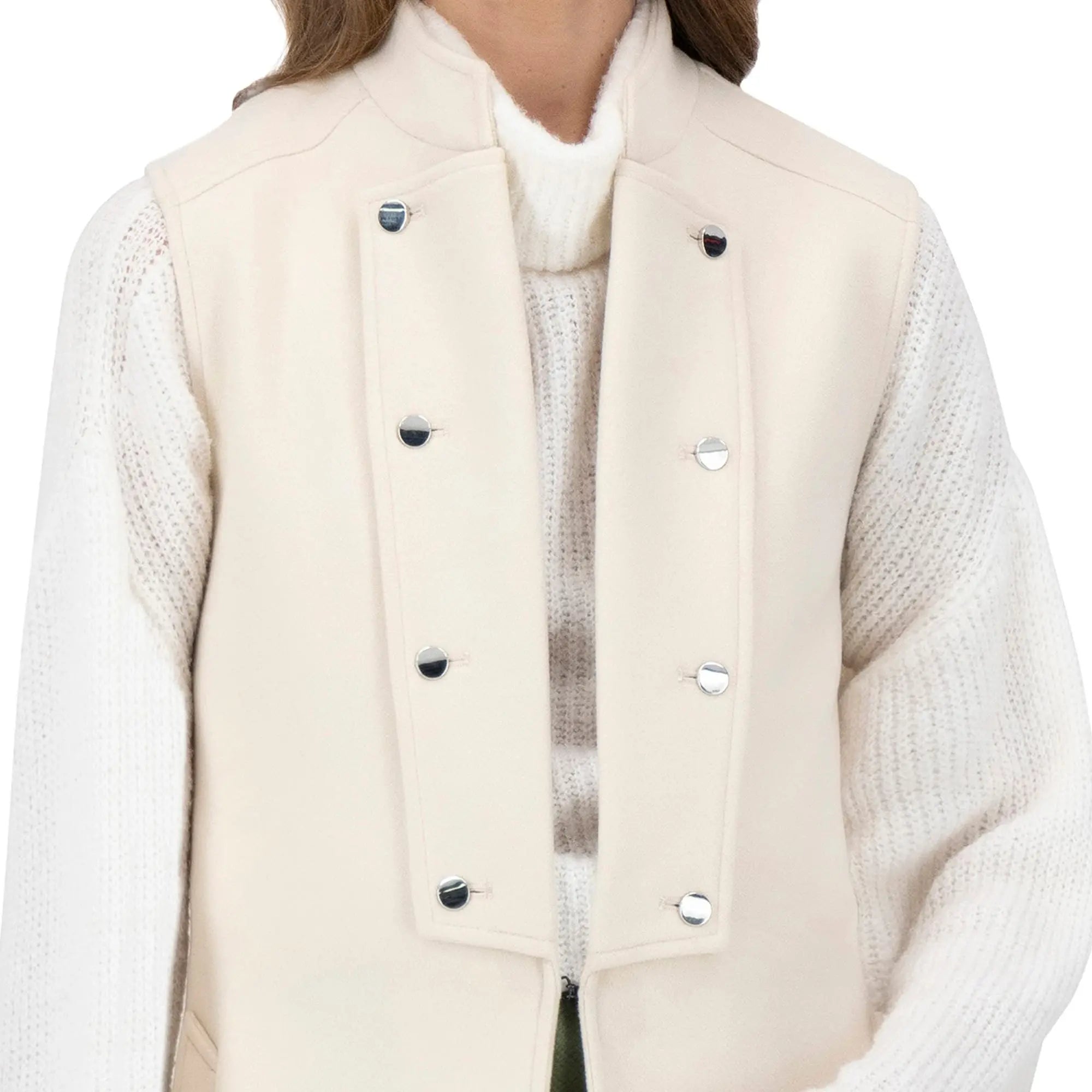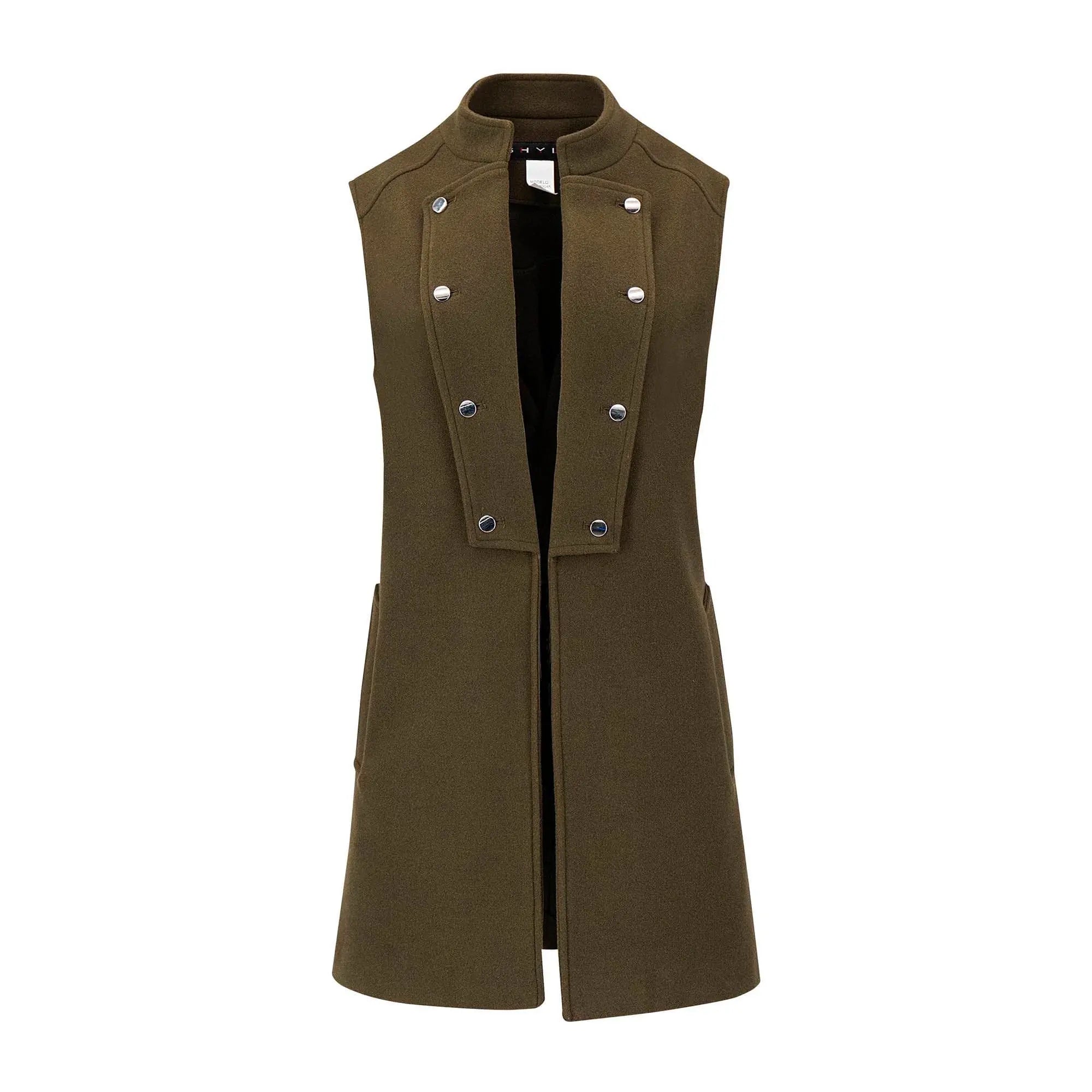 Chaleco largo con cuello mao y botones metálicos al frente. Su diseño moderno y aporta un estilo sofisticado y versátil.