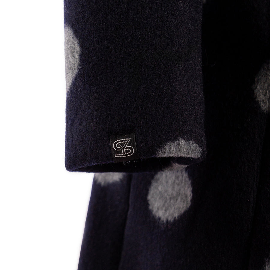 El abrigo presenta un diseño de puntos en contraste sobre una base en color azul marino, aportando un toque divertido y elegante a cualquier conjunto.DETALLES