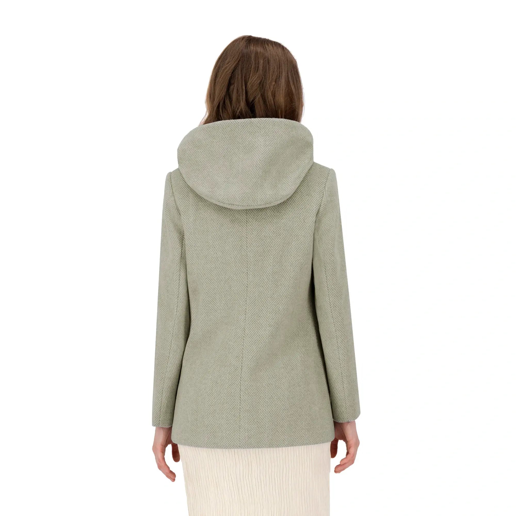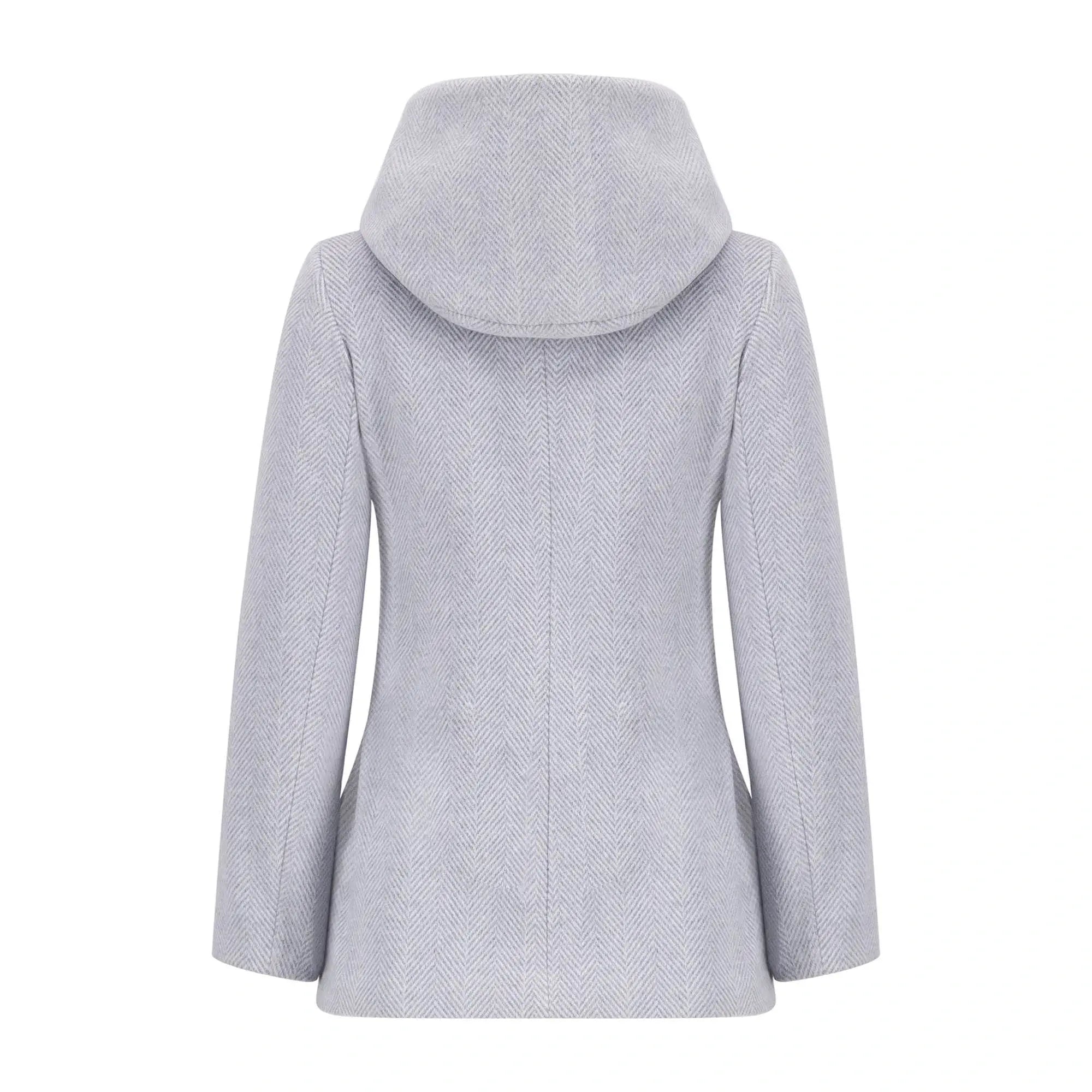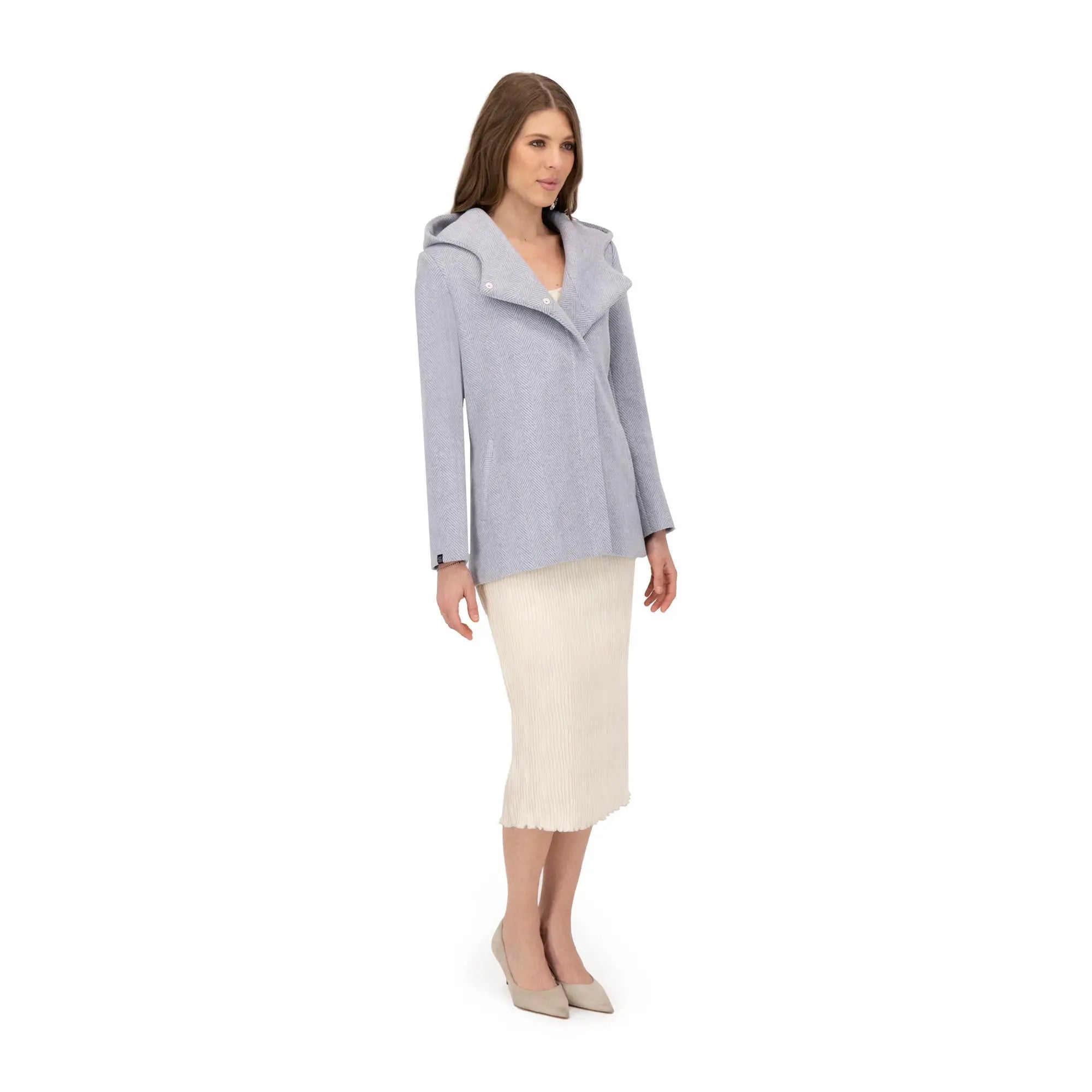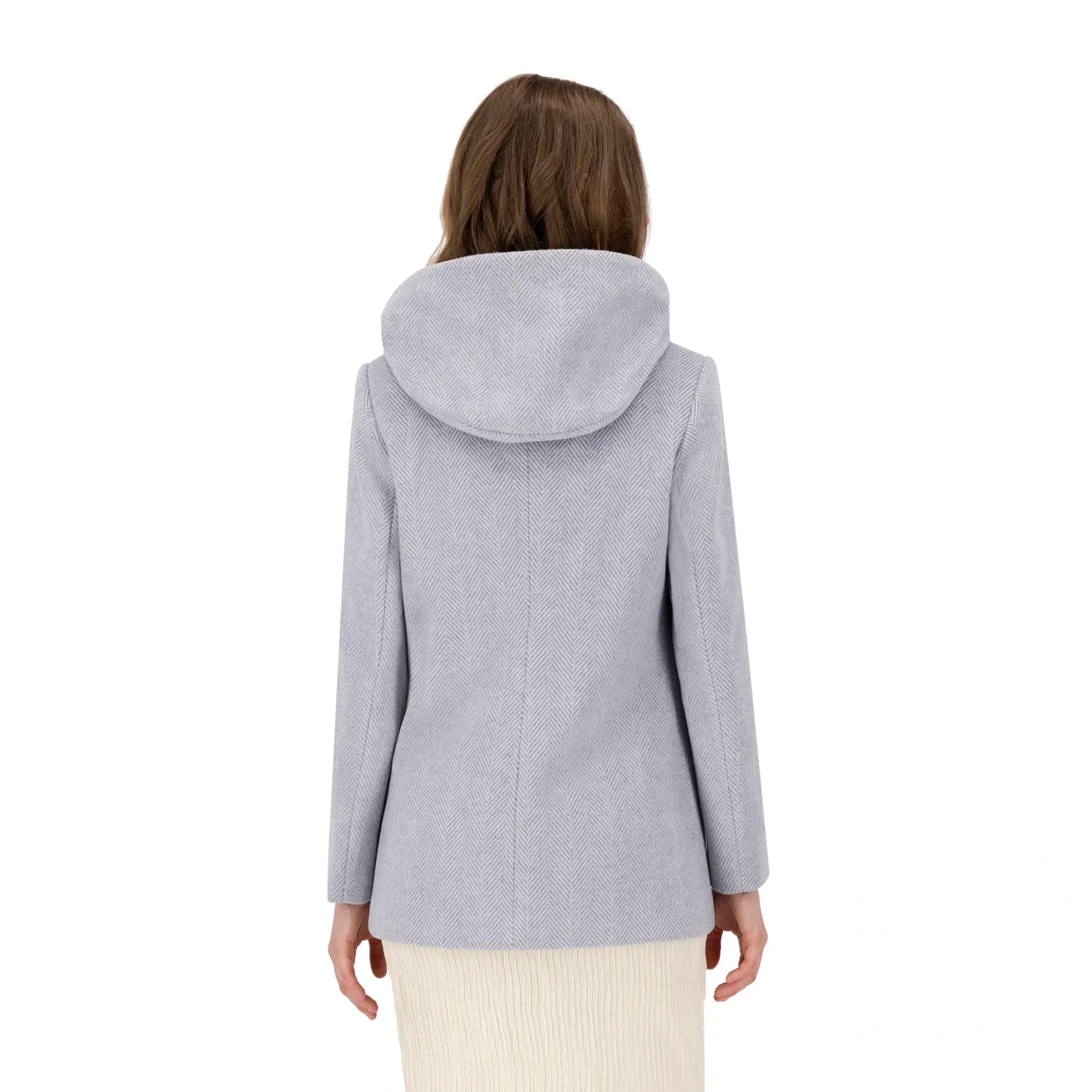 Este abrigo corto destaca por su gorro envolvente y cierre delantero oculto. Fabricado en tejido de espiga que añade textura y un toque refinado, brinda elegancia sin sacrificar confort. Su diseño favorecedor realza la silueta, convirtiéndose en una pieza versátil, ideal tanto para el uso diario como para darle un giro sofisticado a tus conjuntos casuales.