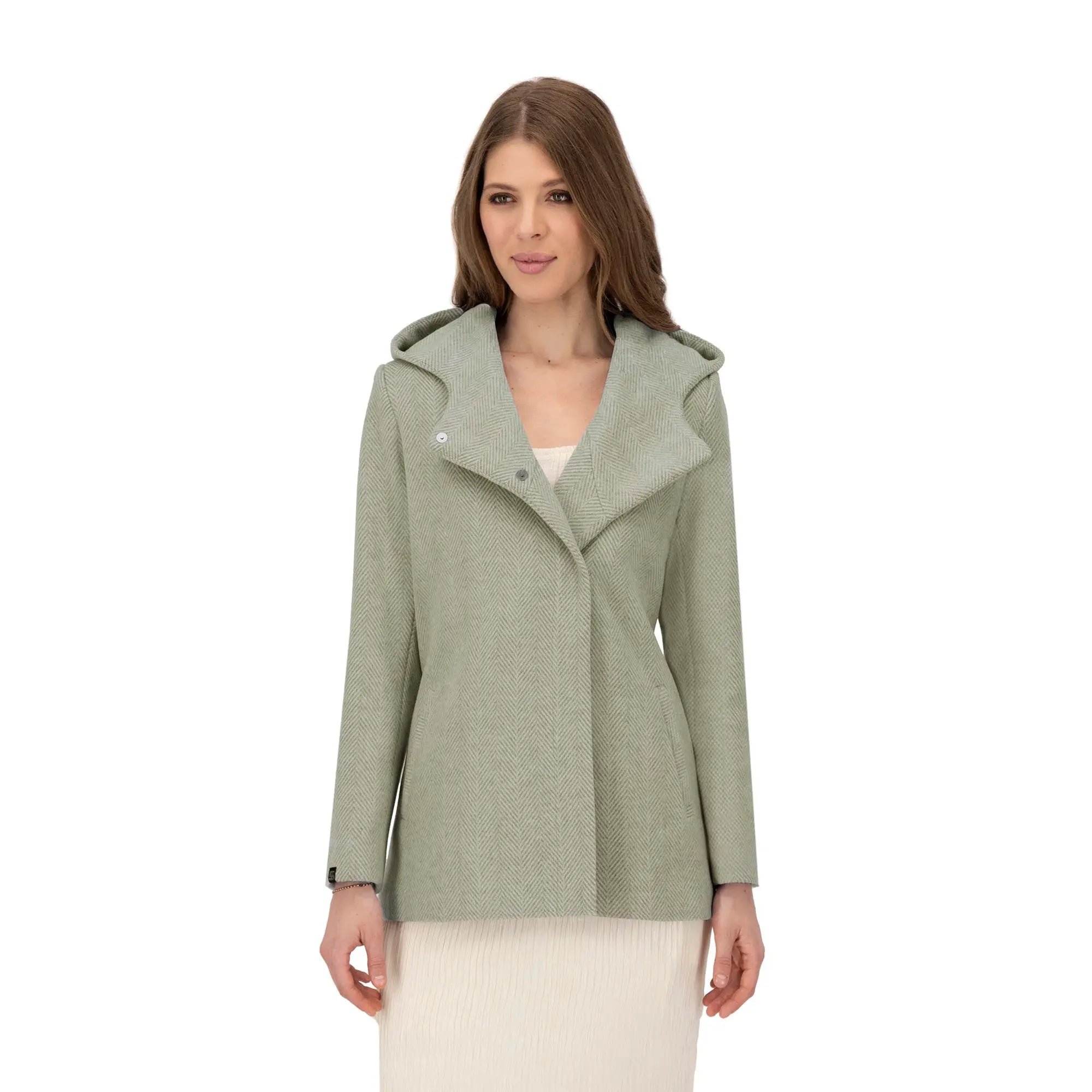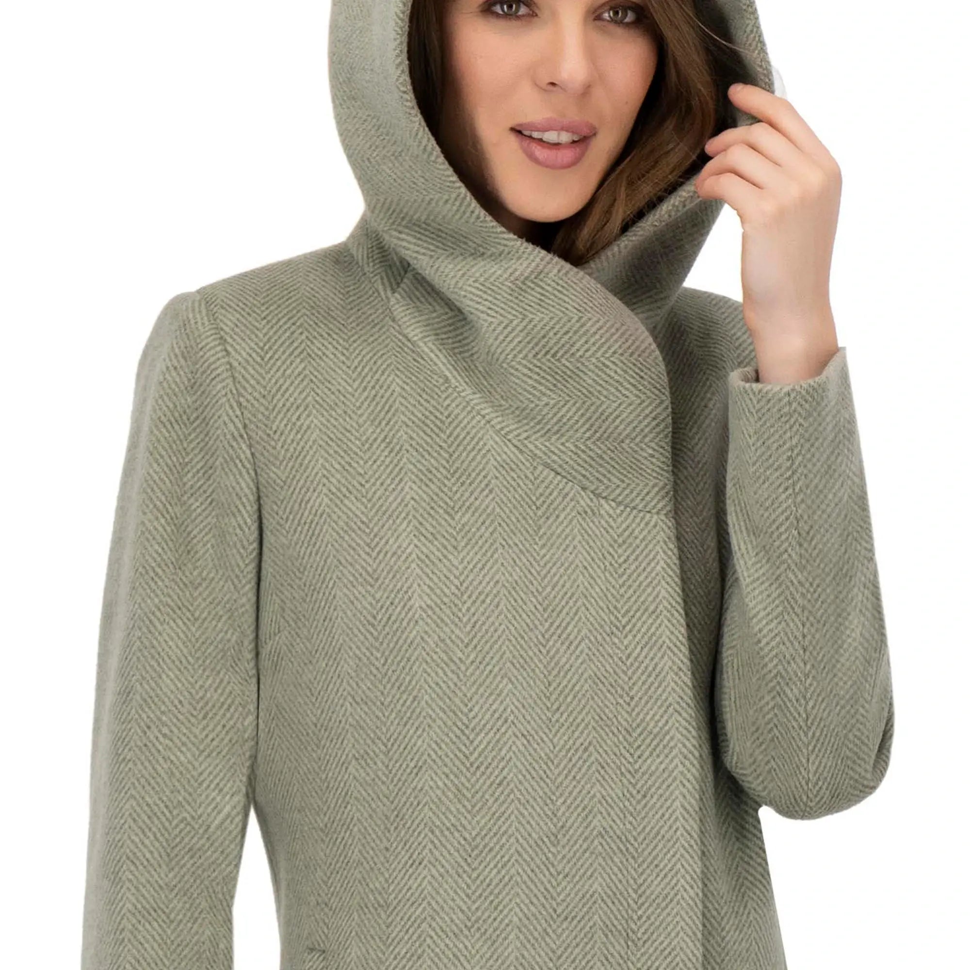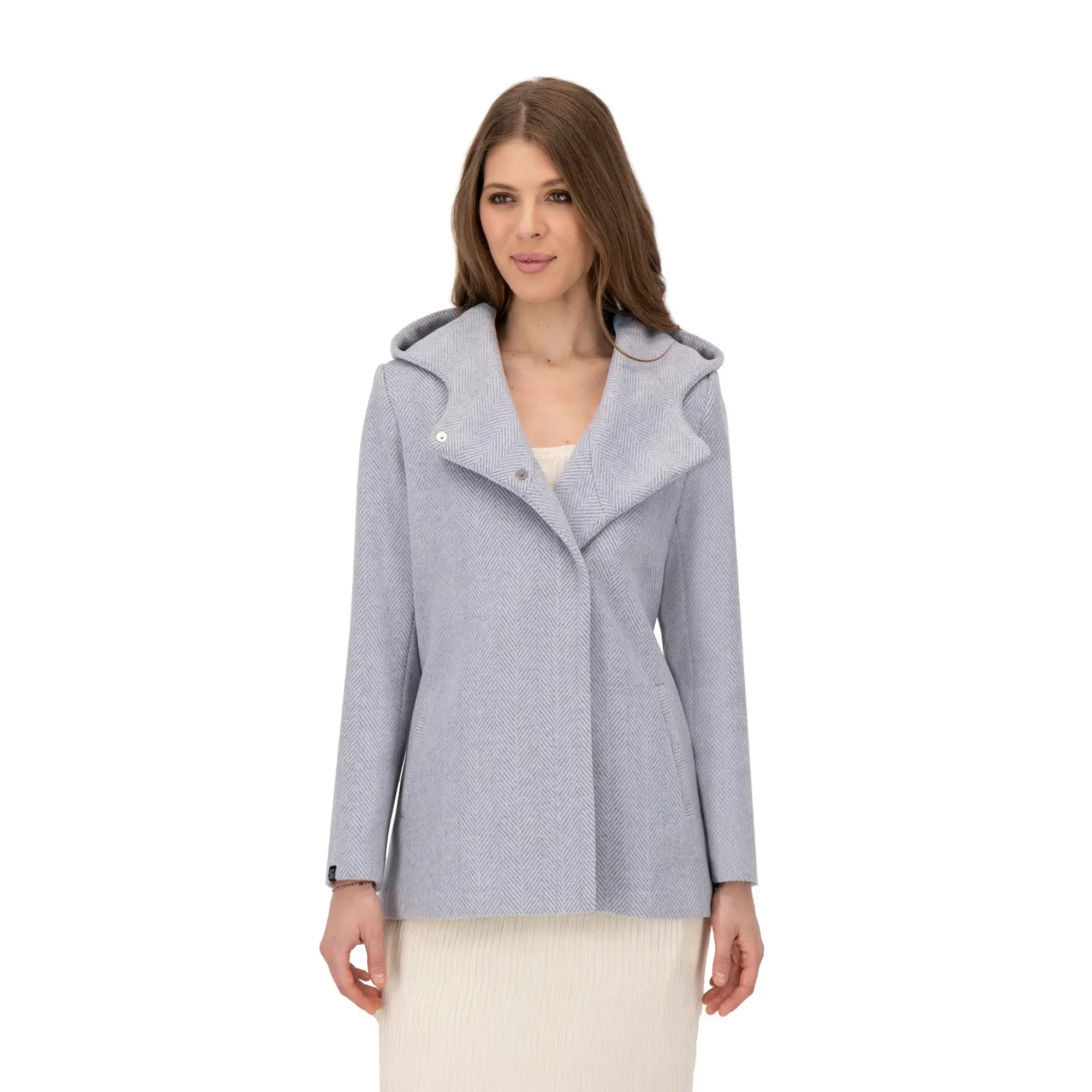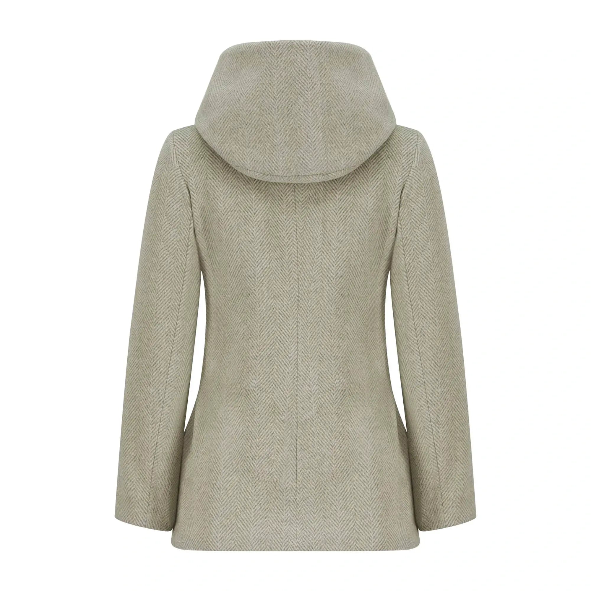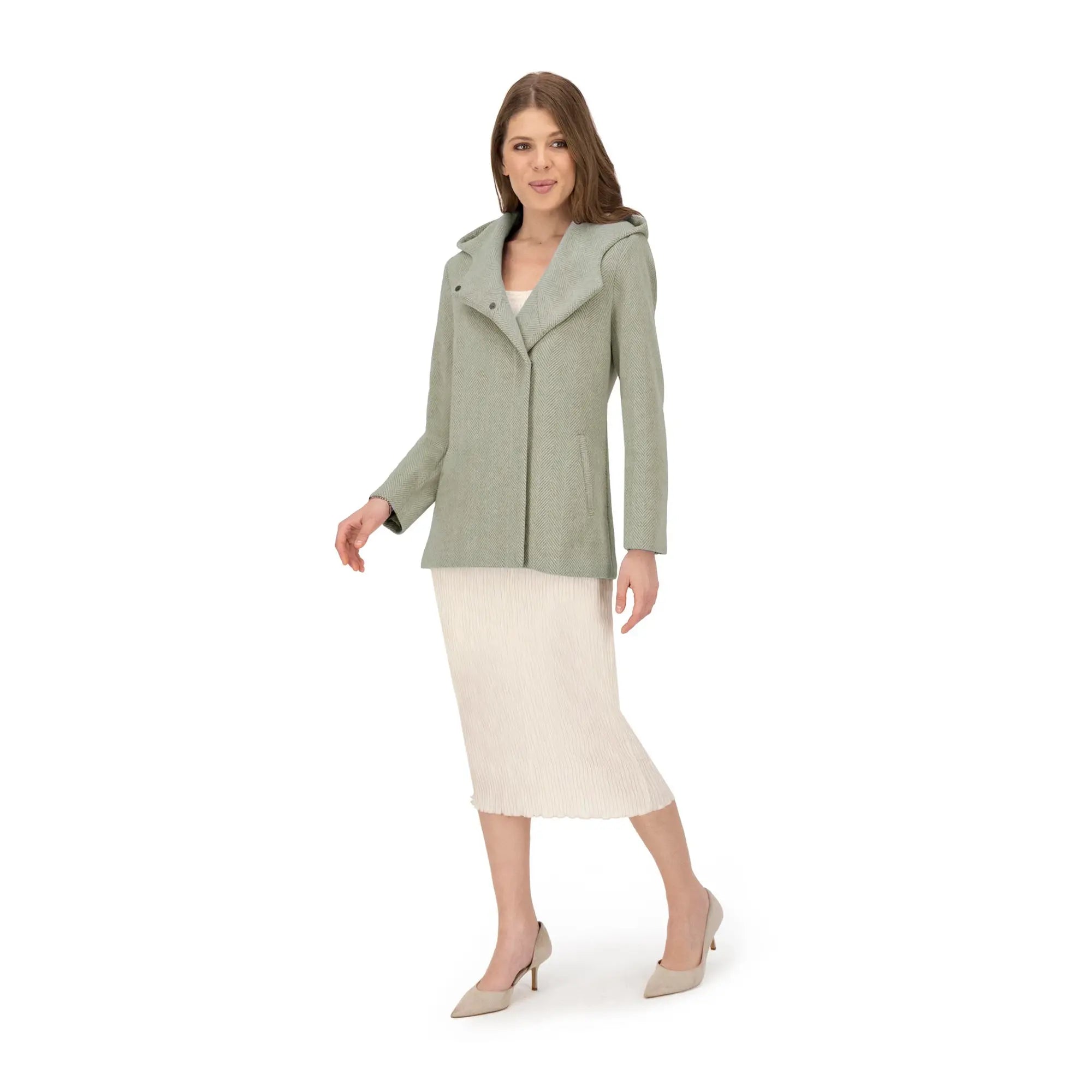 Este abrigo corto destaca por su gorro envolvente y cierre delantero oculto. Fabricado en tejido de espiga que añade textura y un toque refinado, brinda elegancia sin sacrificar confort. Su diseño favorecedor realza la silueta, convirtiéndose en una pieza versátil, ideal tanto para el uso diario como para darle un giro sofisticado a tus conjuntos casuales.