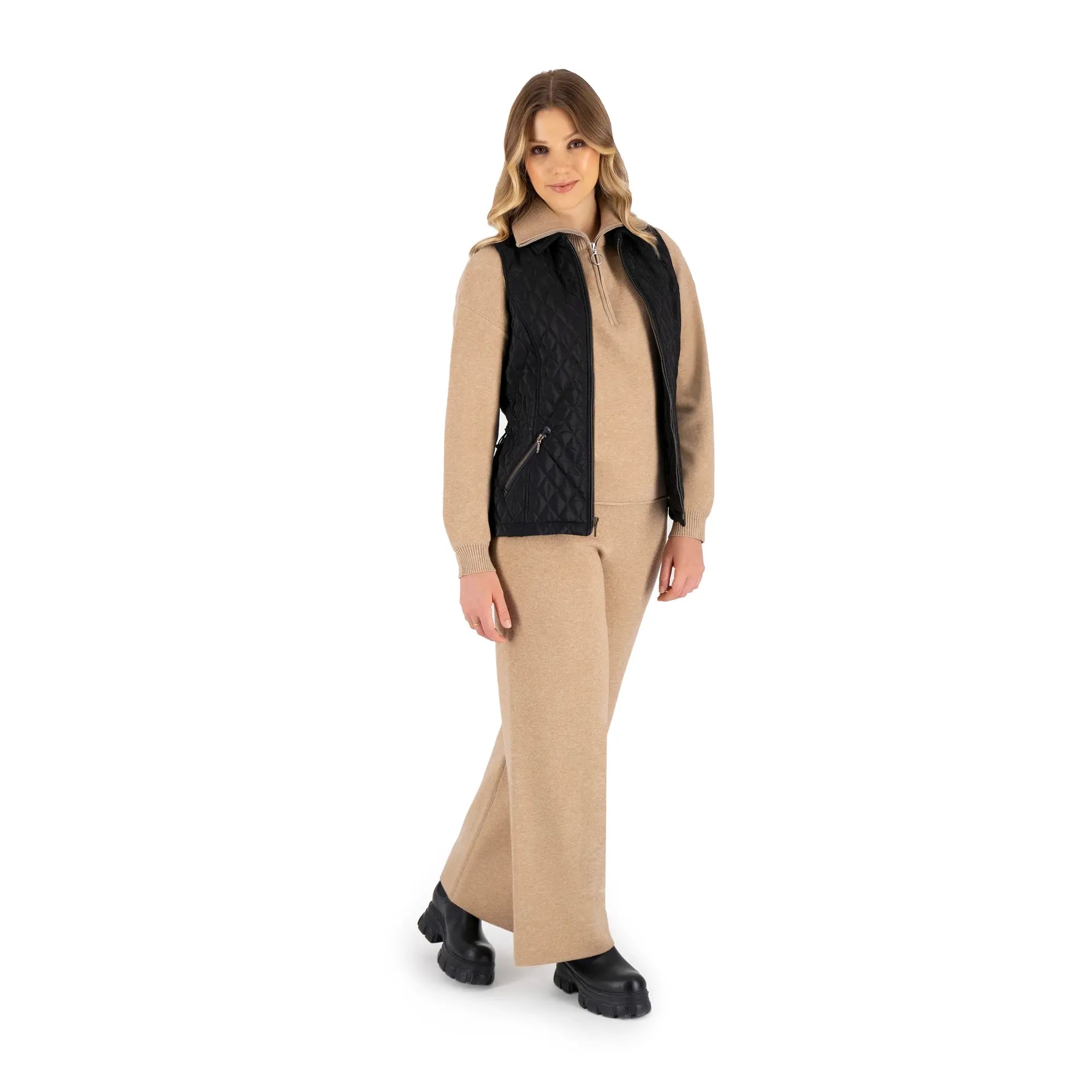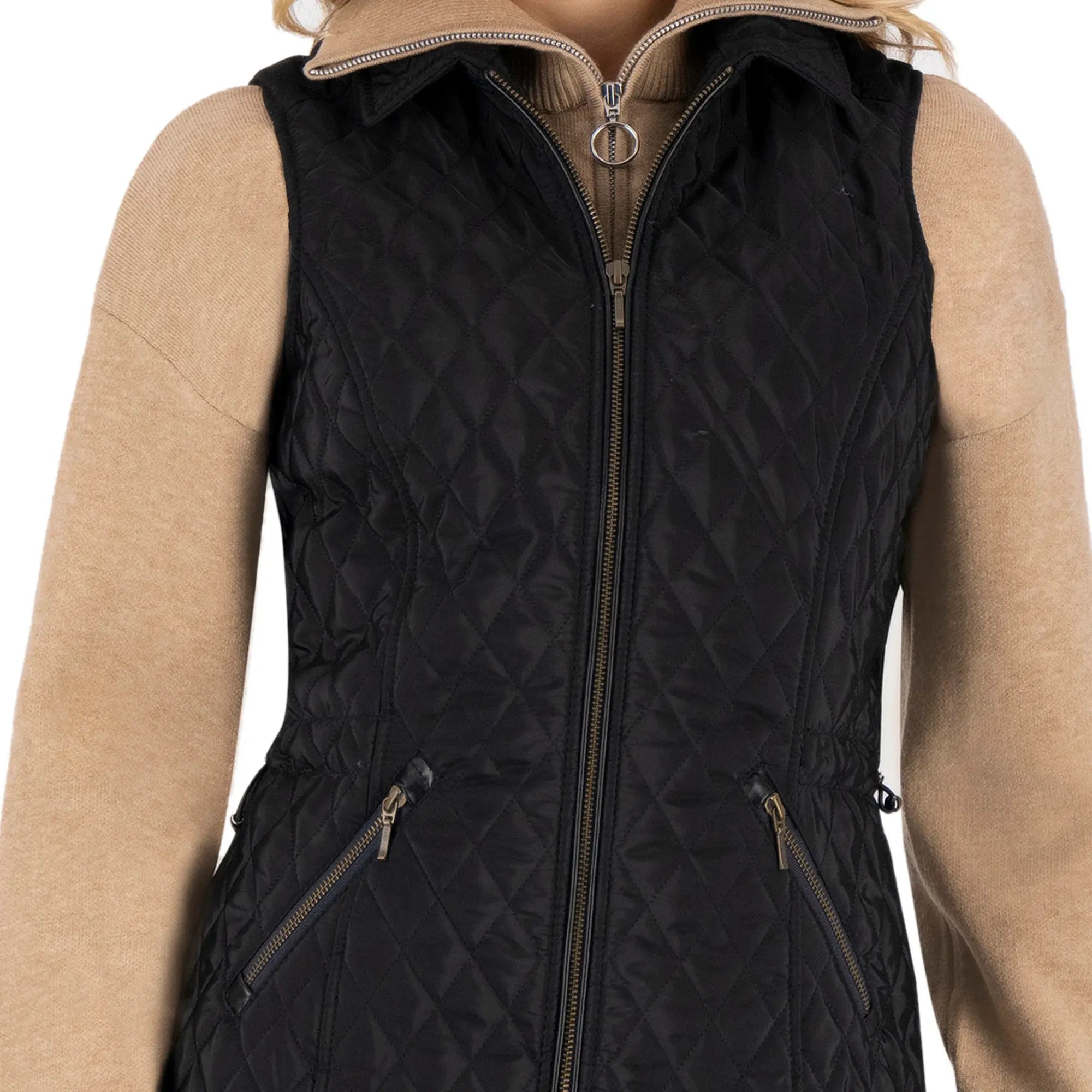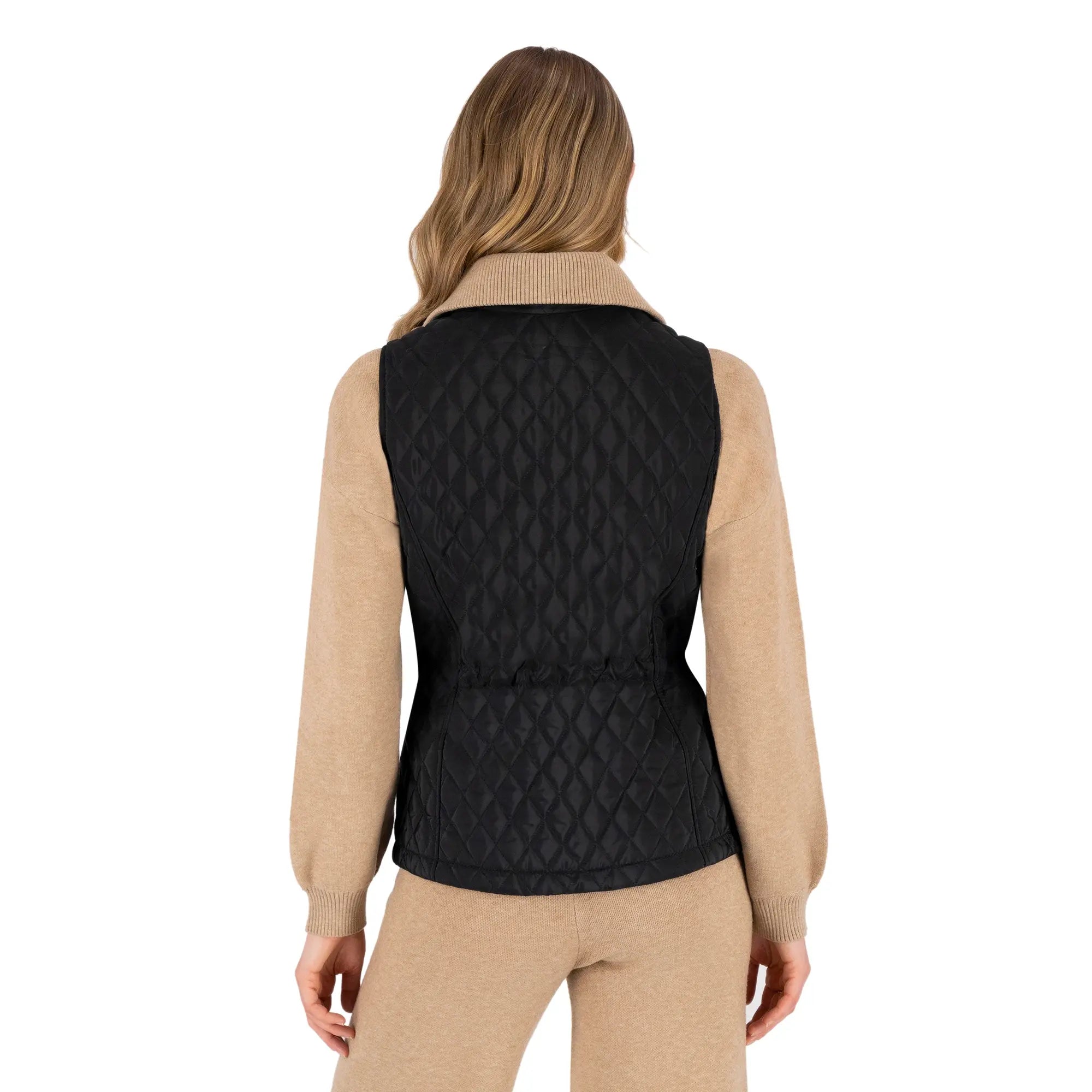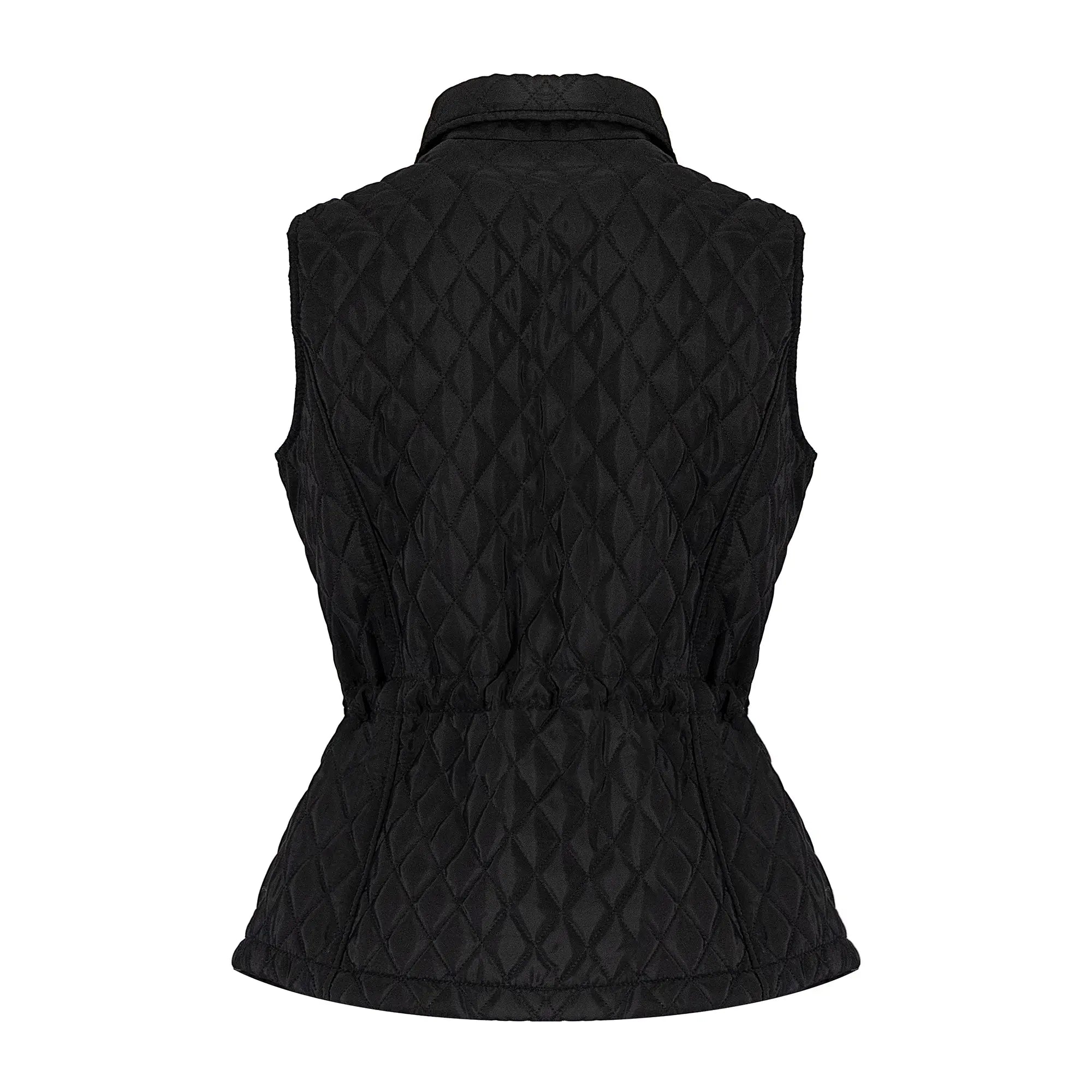 Chaleco acolchado con capitonado en rombo. Cierre frontal con cremallera metálica, bolsillos laterales con cierre y jareta elástica lateral que ajusta y realza la silueta. Ligero, versátil y fácil de combinar para todos los días.
