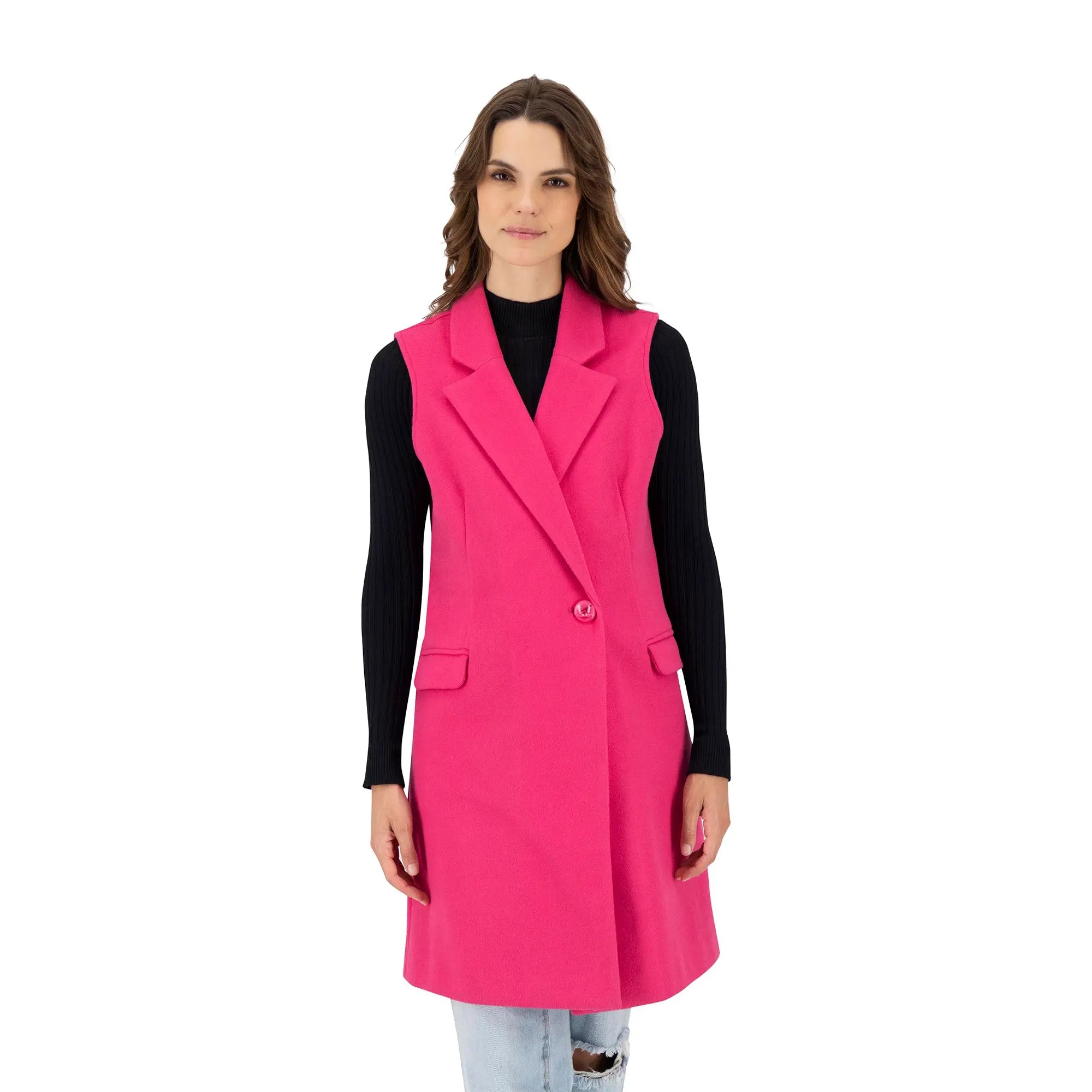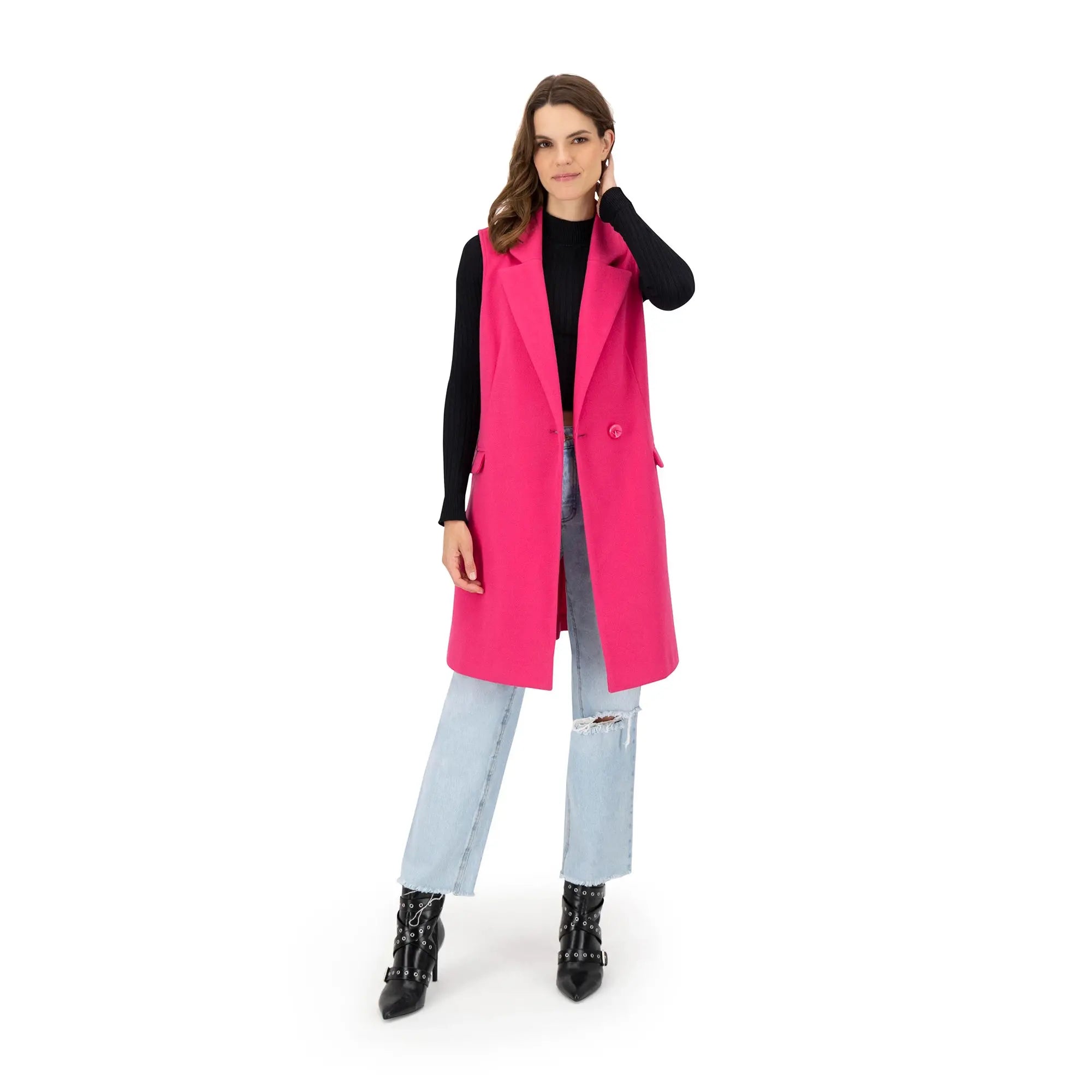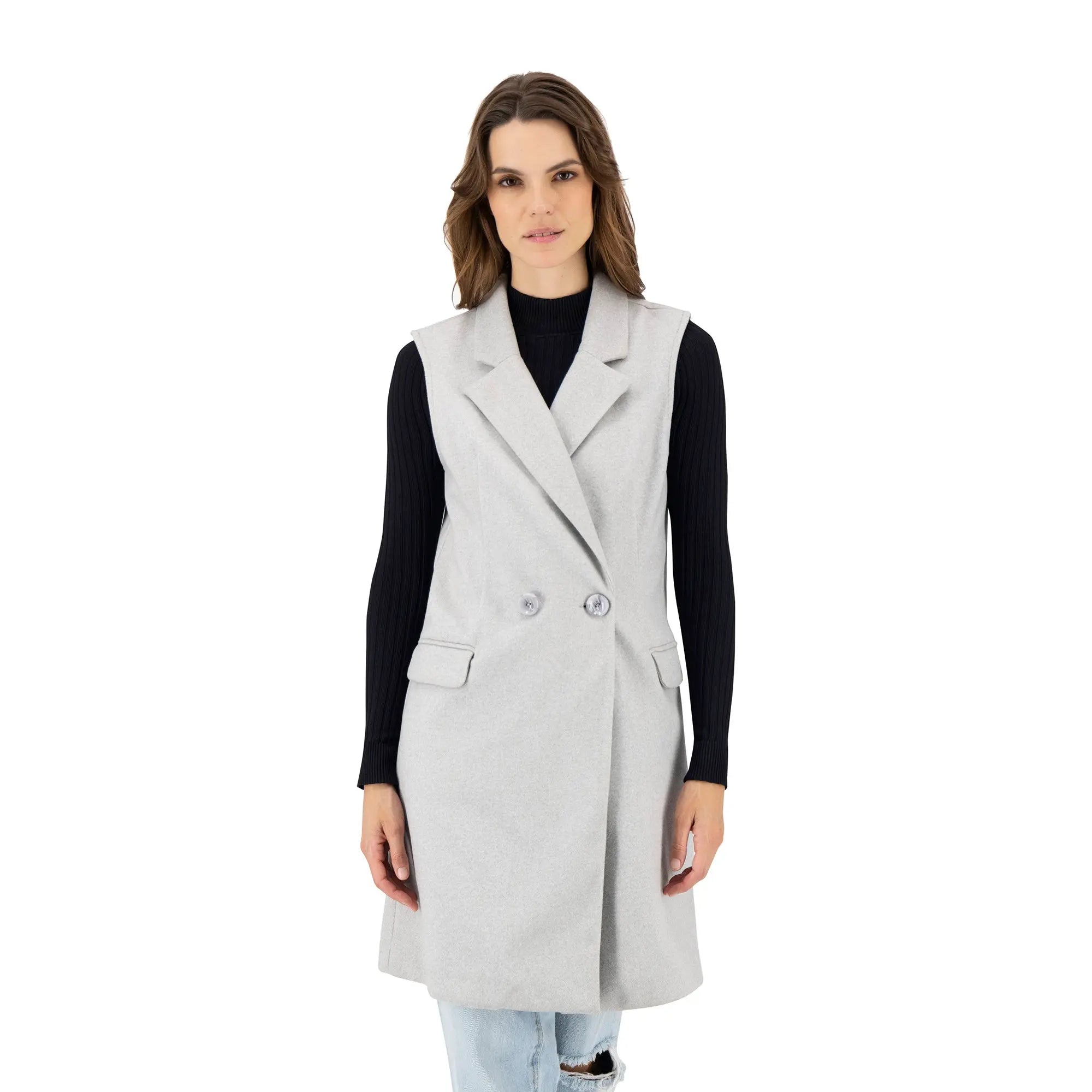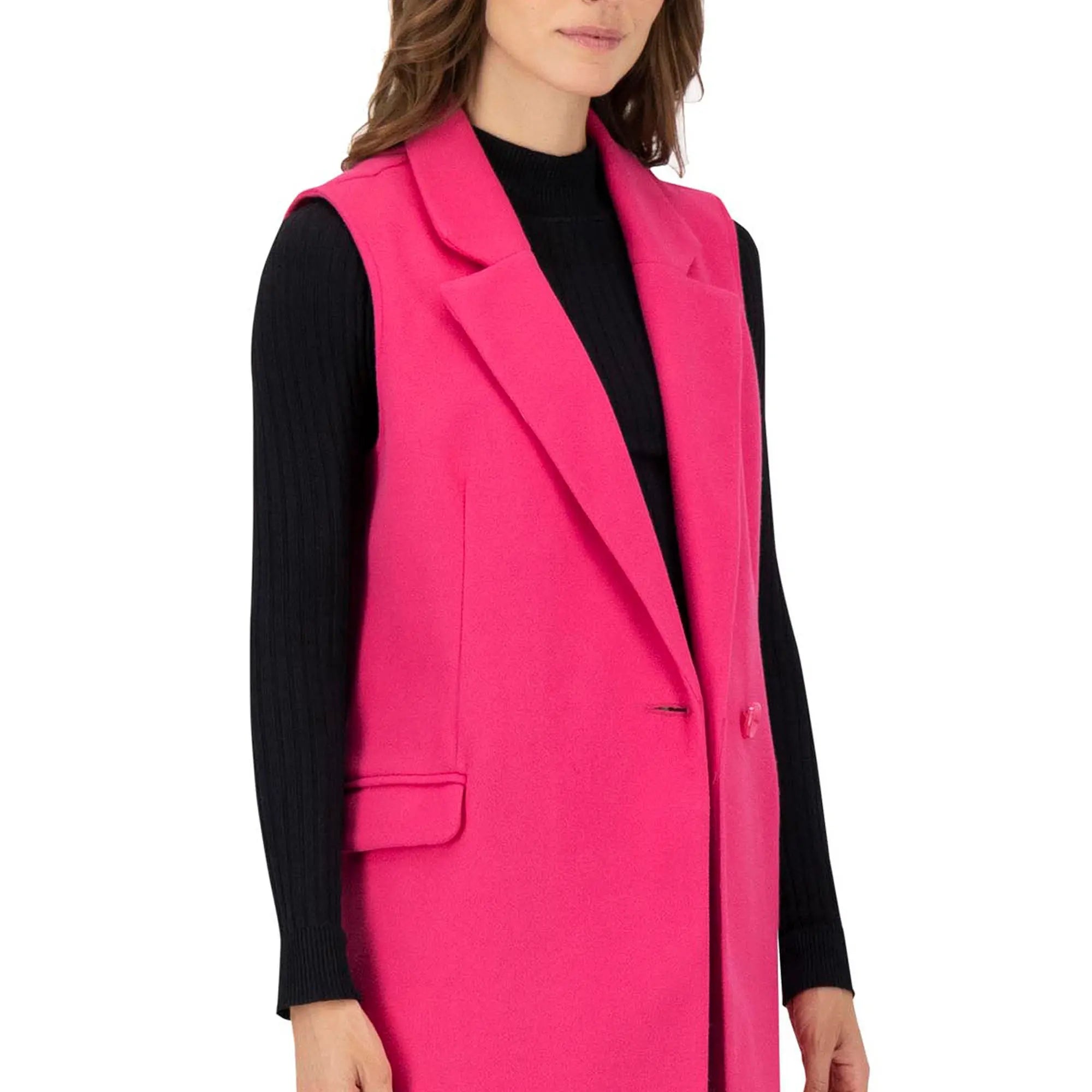 Chaleco largo con solapa clásica y cierre de un botón. Su silueta moderna y sin mangas aporta frescura y estilo.