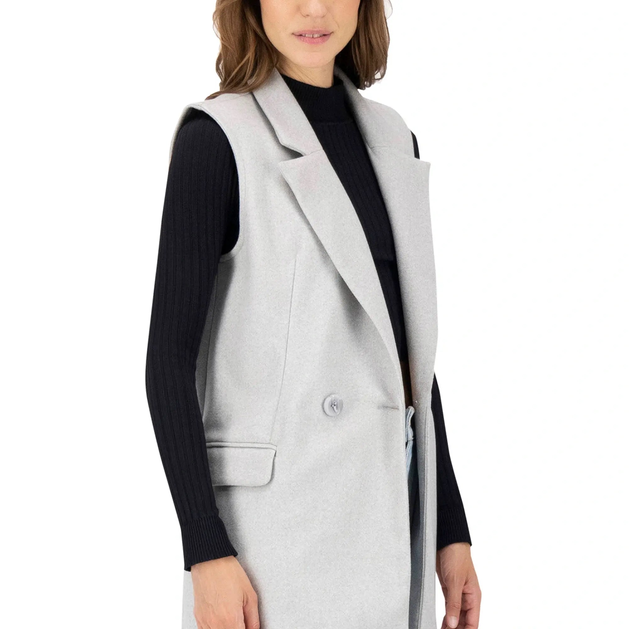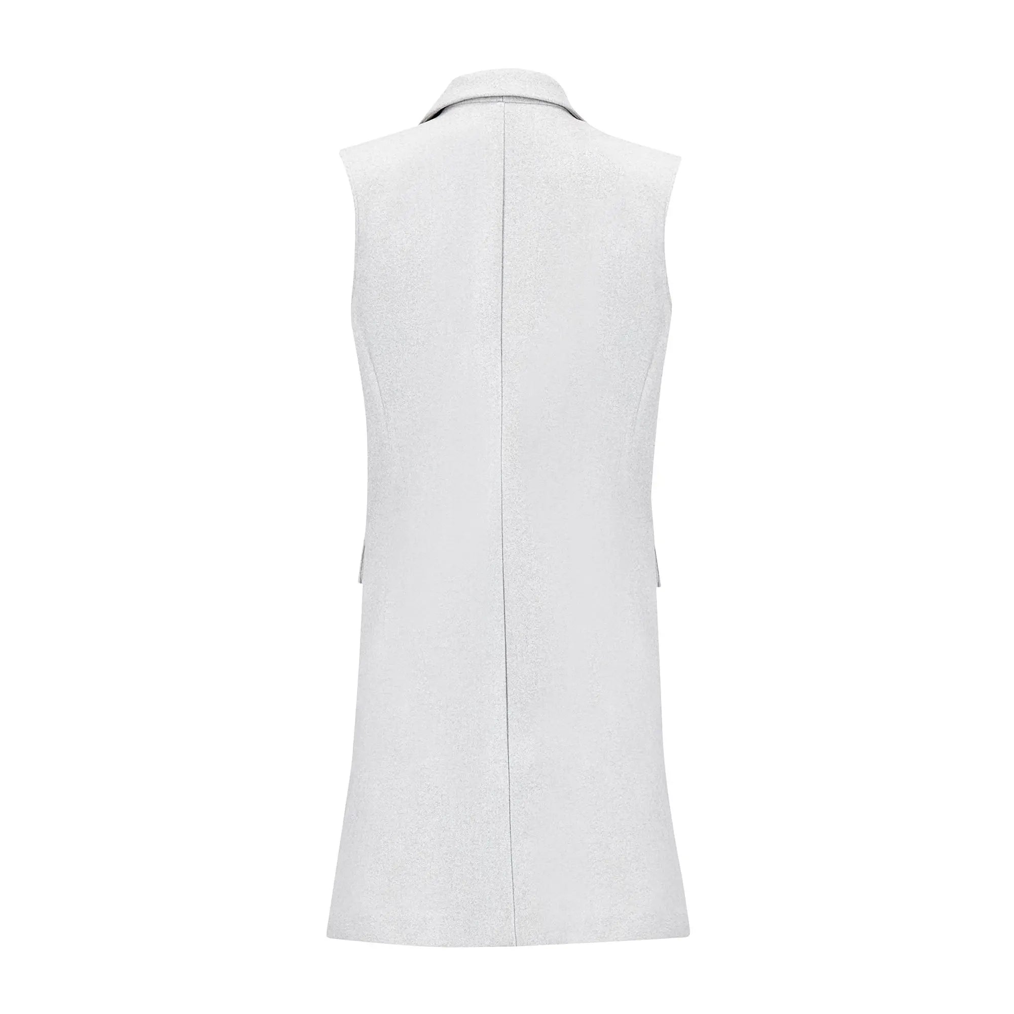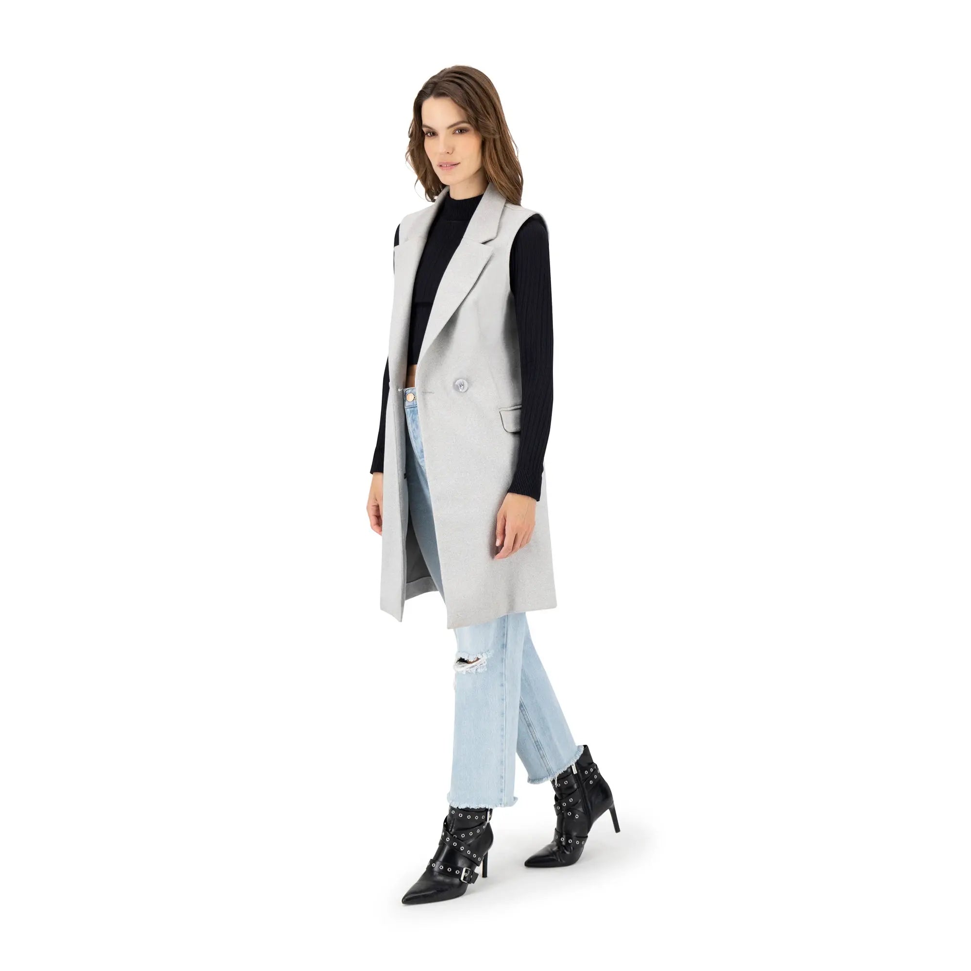 Chaleco largo con solapa clásica y cierre de un botón. Su silueta moderna y sin mangas aporta frescura y estilo.