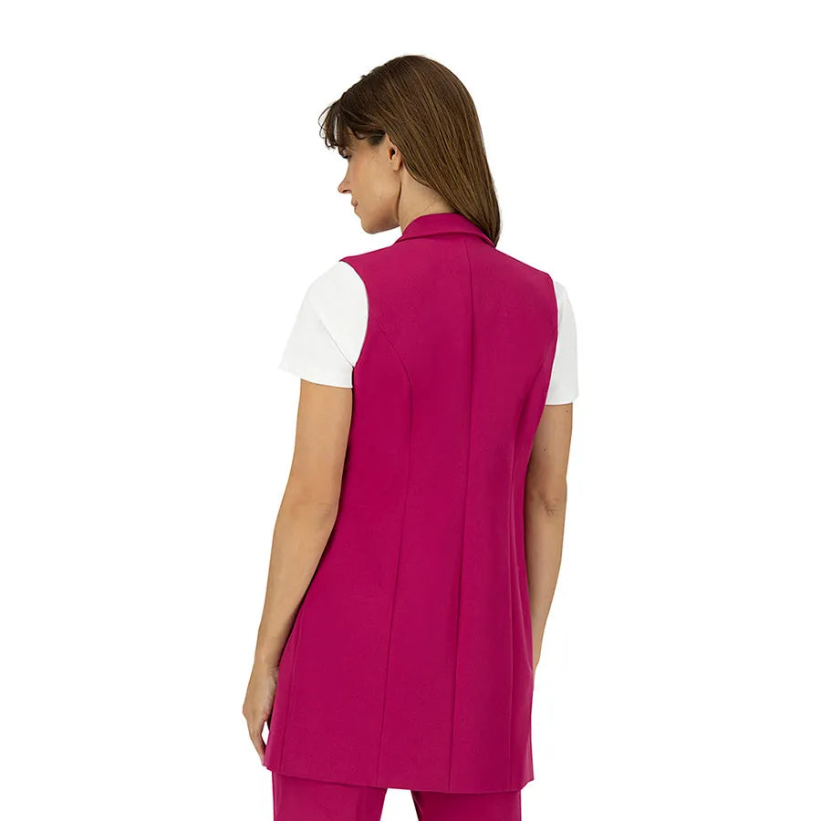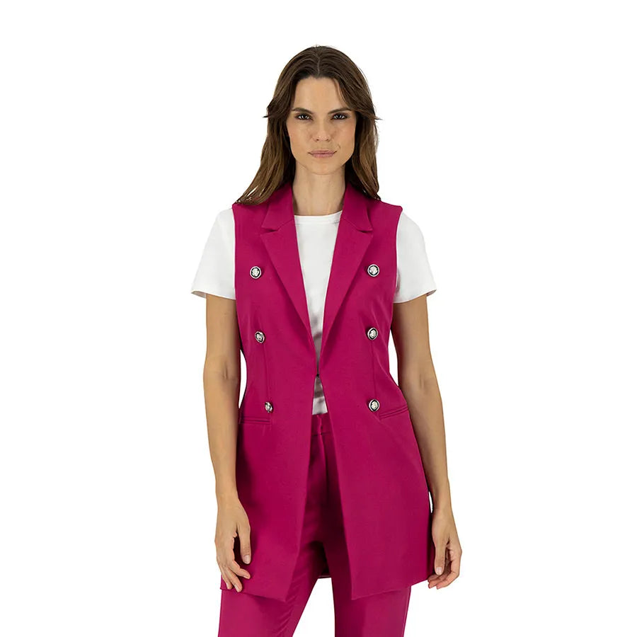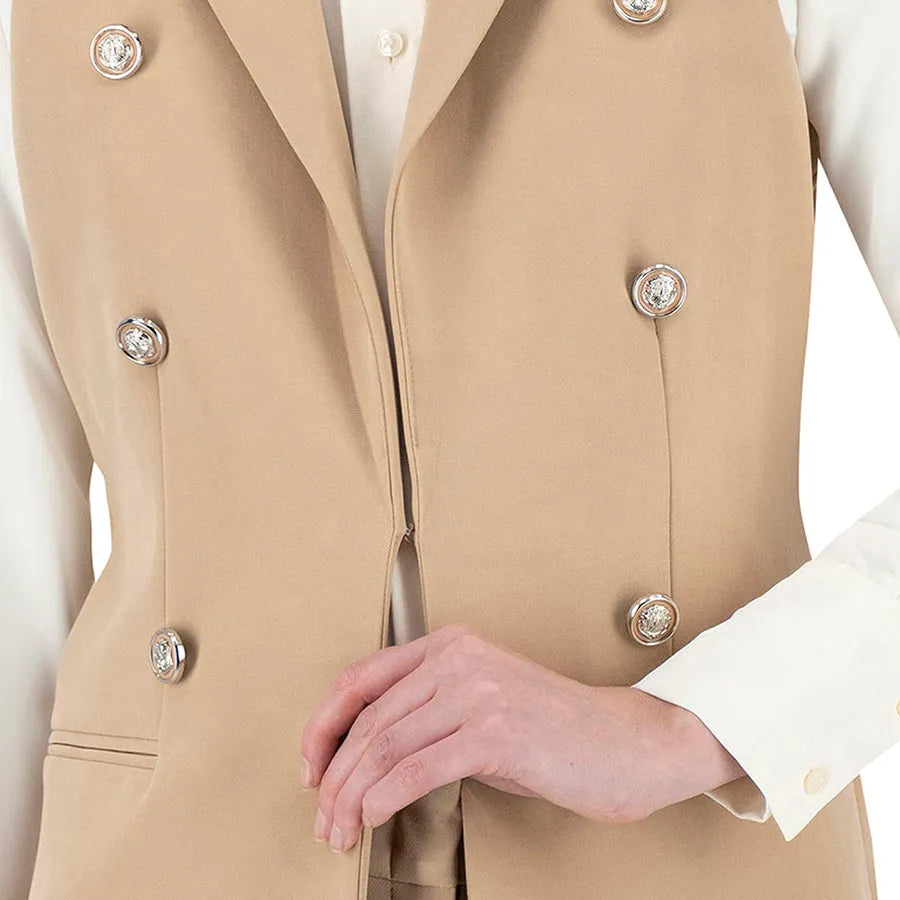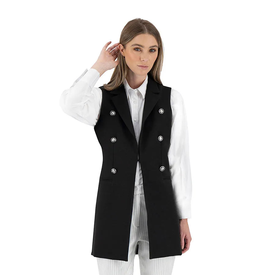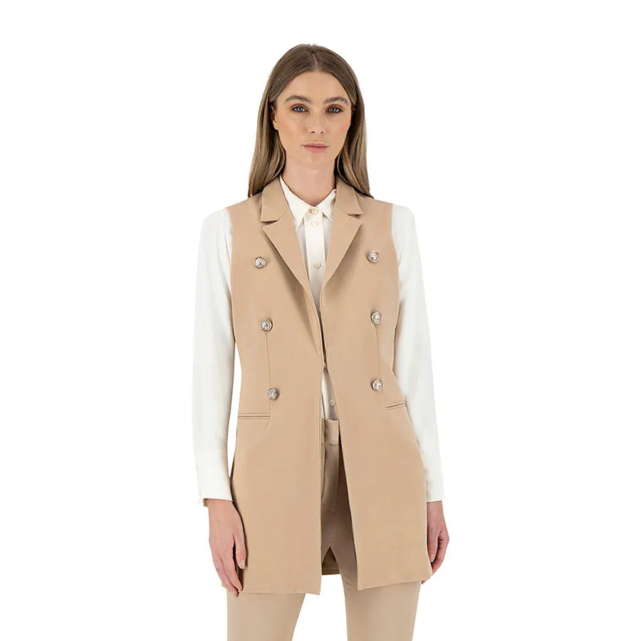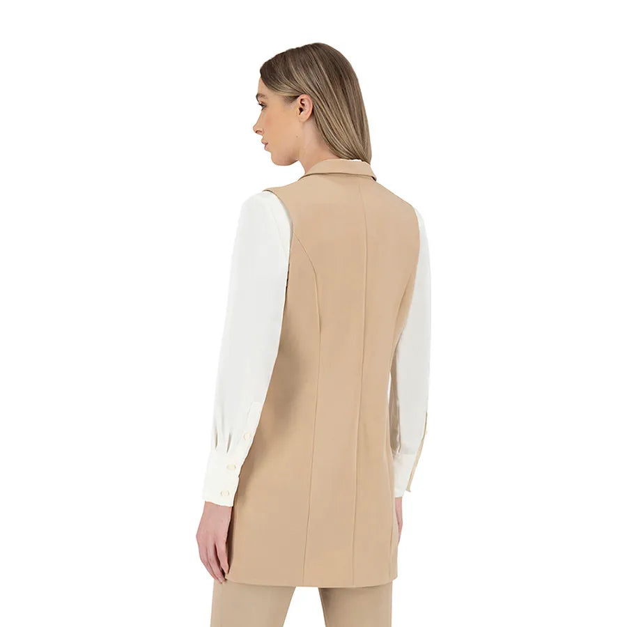 Este diseño presenta una silueta recta y alargada que estiliza la figura. Cuenta con solapa clásica tipo blazer, doble línea de botones metálicos decorativos y bolsillos con tapeta a los costados que añaden funcionalidad sutil. La prenda no tiene mangas, lo que permite combinarla fácilmente con blusas estructuradas, camisas ligeras o tops de cuello alto según la temporada.