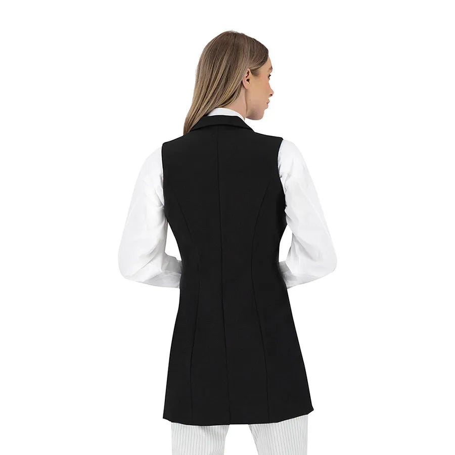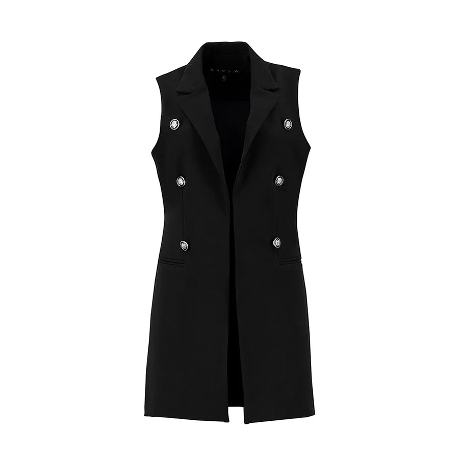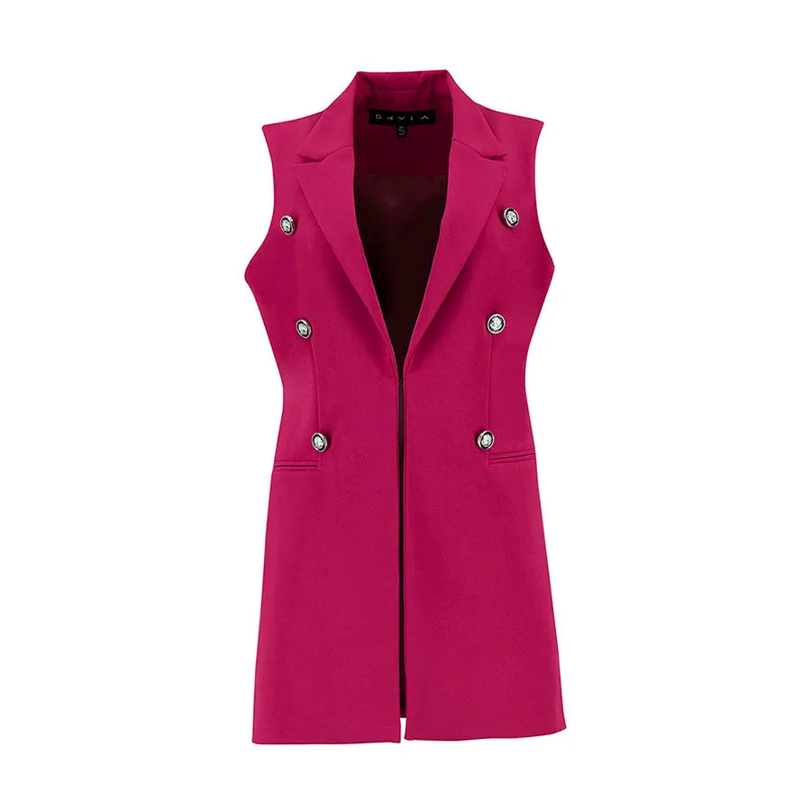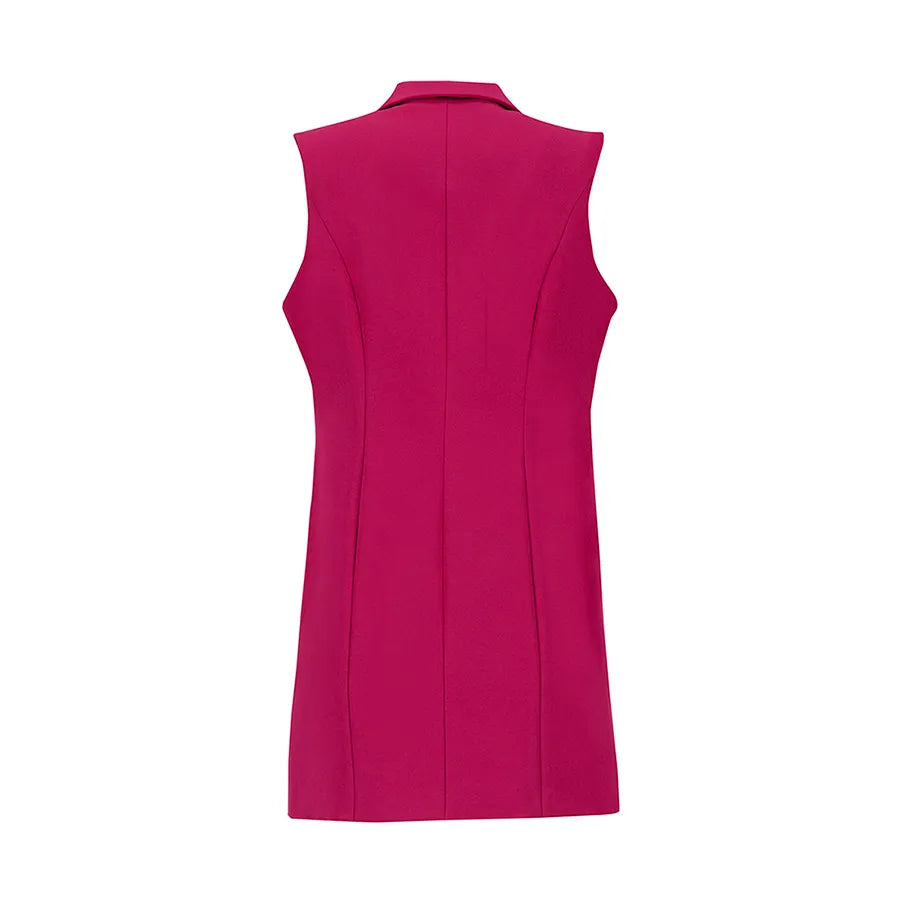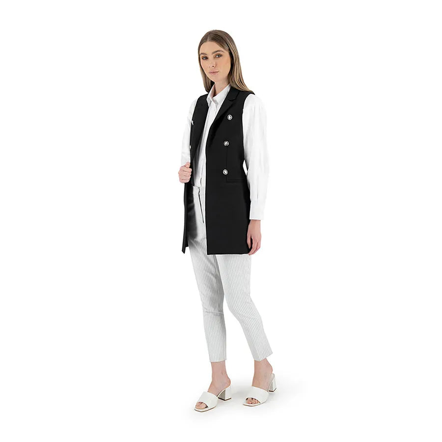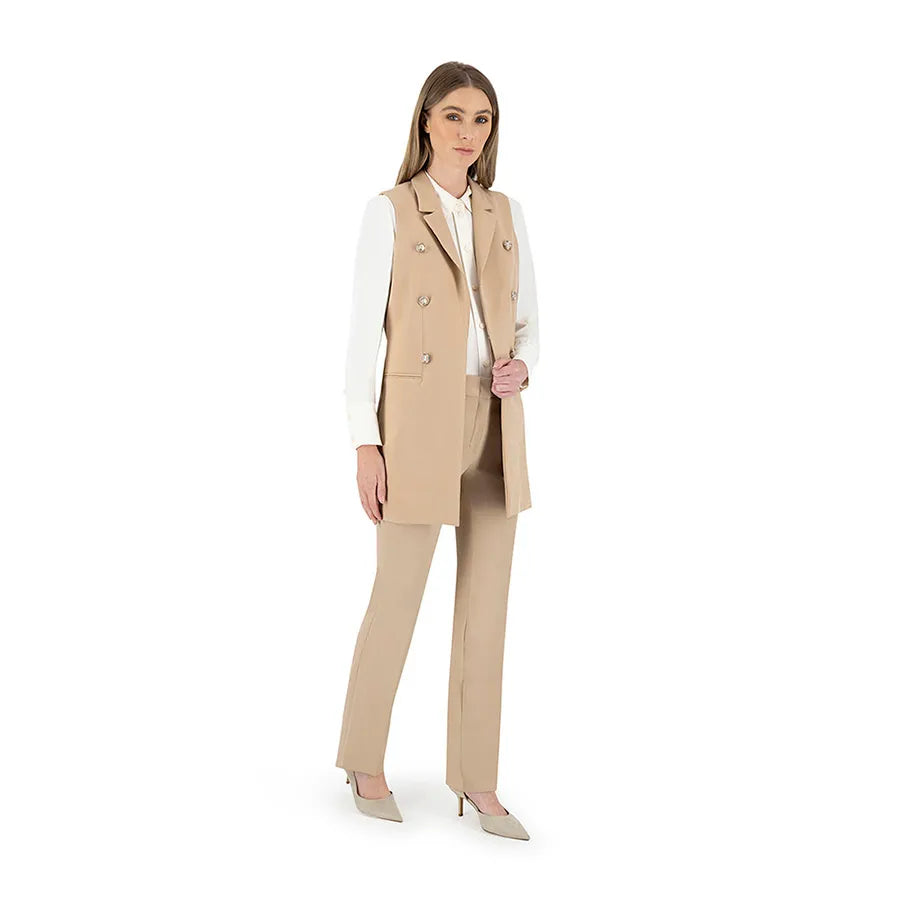 Este diseño presenta una silueta recta y alargada que estiliza la figura. Cuenta con solapa clásica tipo blazer, doble línea de botones metálicos decorativos y bolsillos con tapeta a los costados que añaden funcionalidad sutil. La prenda no tiene mangas, lo que permite combinarla fácilmente con blusas estructuradas, camisas ligeras o tops de cuello alto según la temporada.