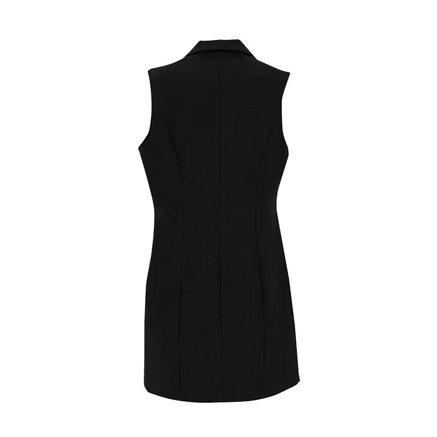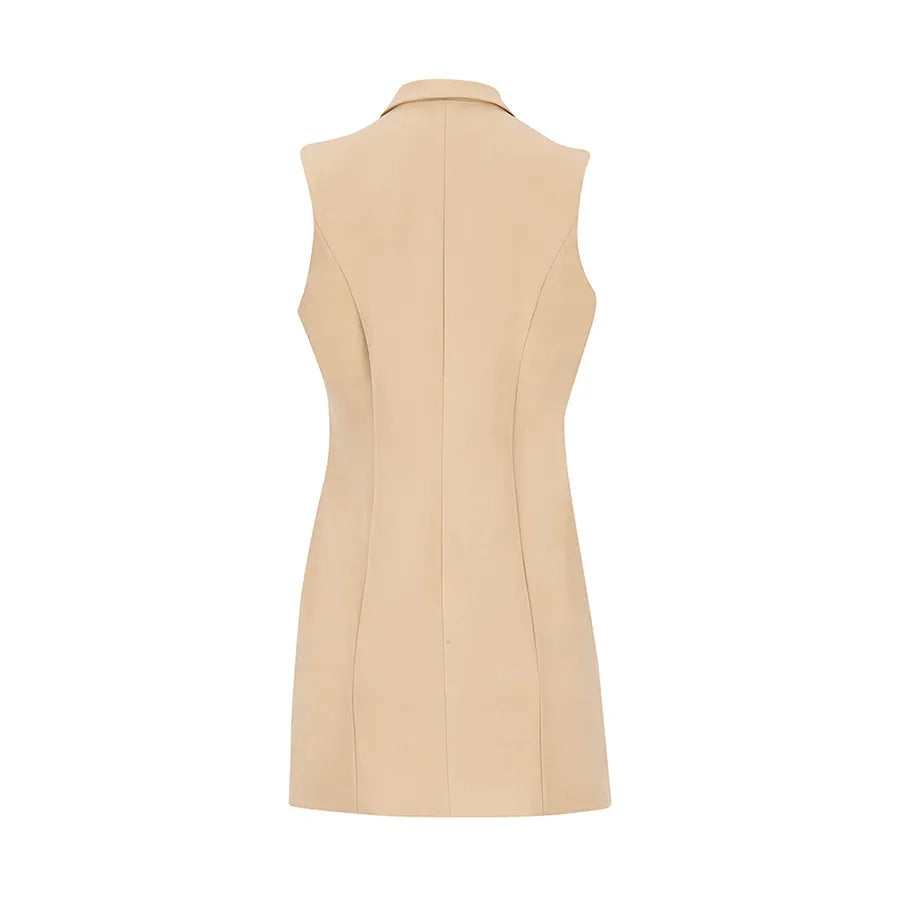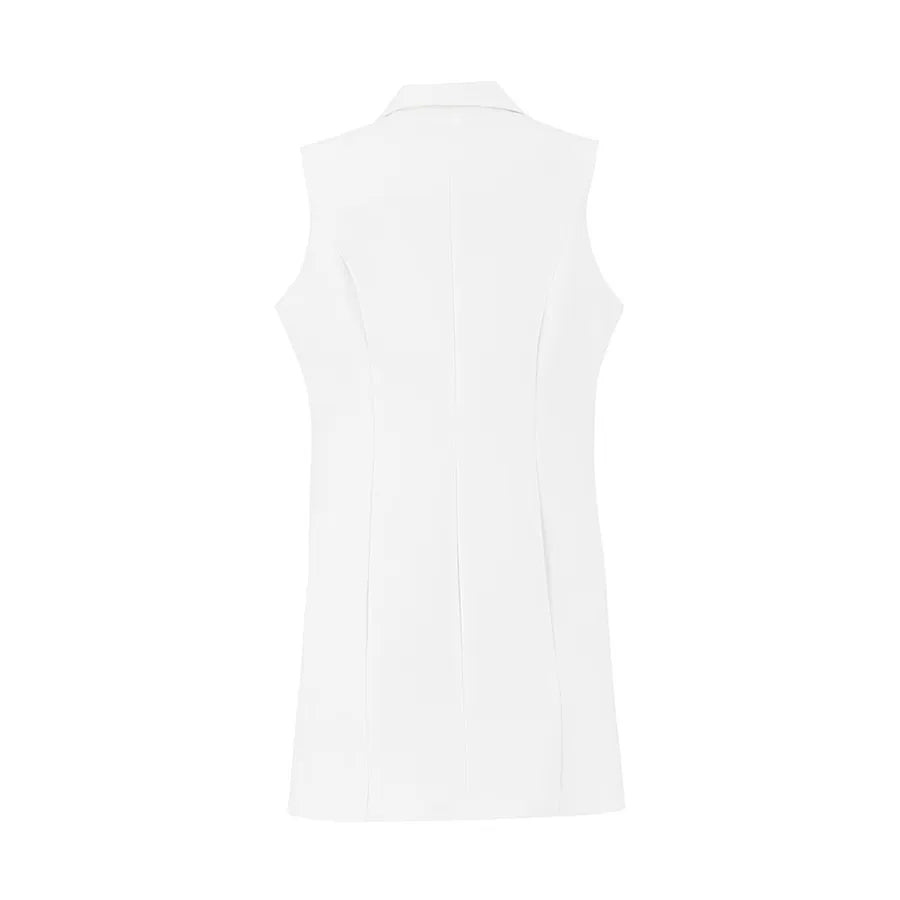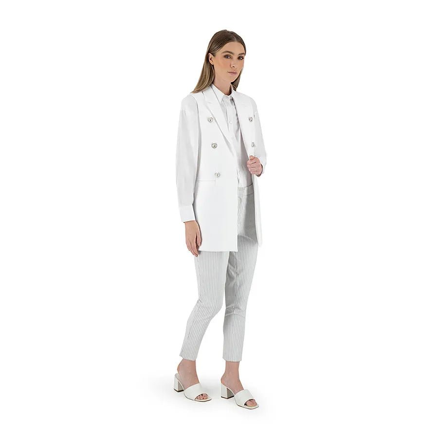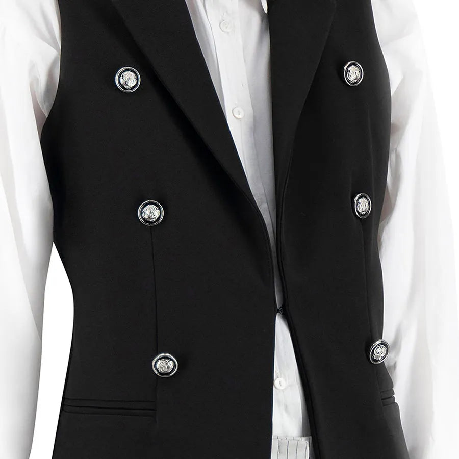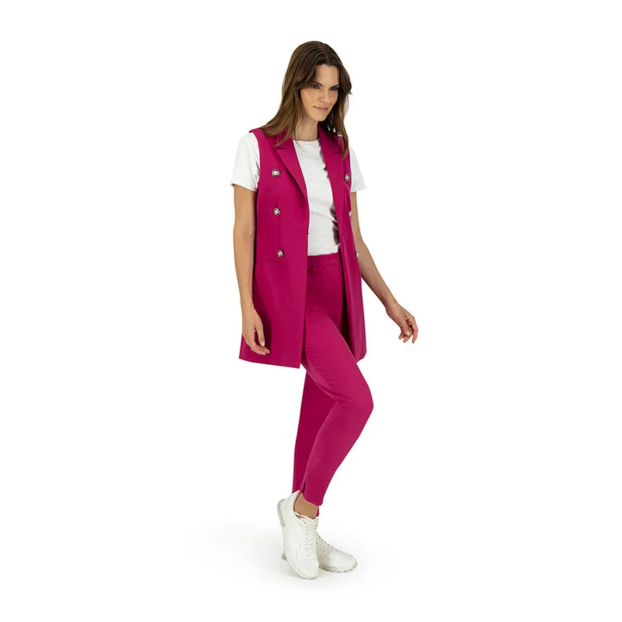 Este diseño presenta una silueta recta y alargada que estiliza la figura. Cuenta con solapa clásica tipo blazer, doble línea de botones metálicos decorativos y bolsillos con tapeta a los costados que añaden funcionalidad sutil. La prenda no tiene mangas, lo que permite combinarla fácilmente con blusas estructuradas, camisas ligeras o tops de cuello alto según la temporada.
