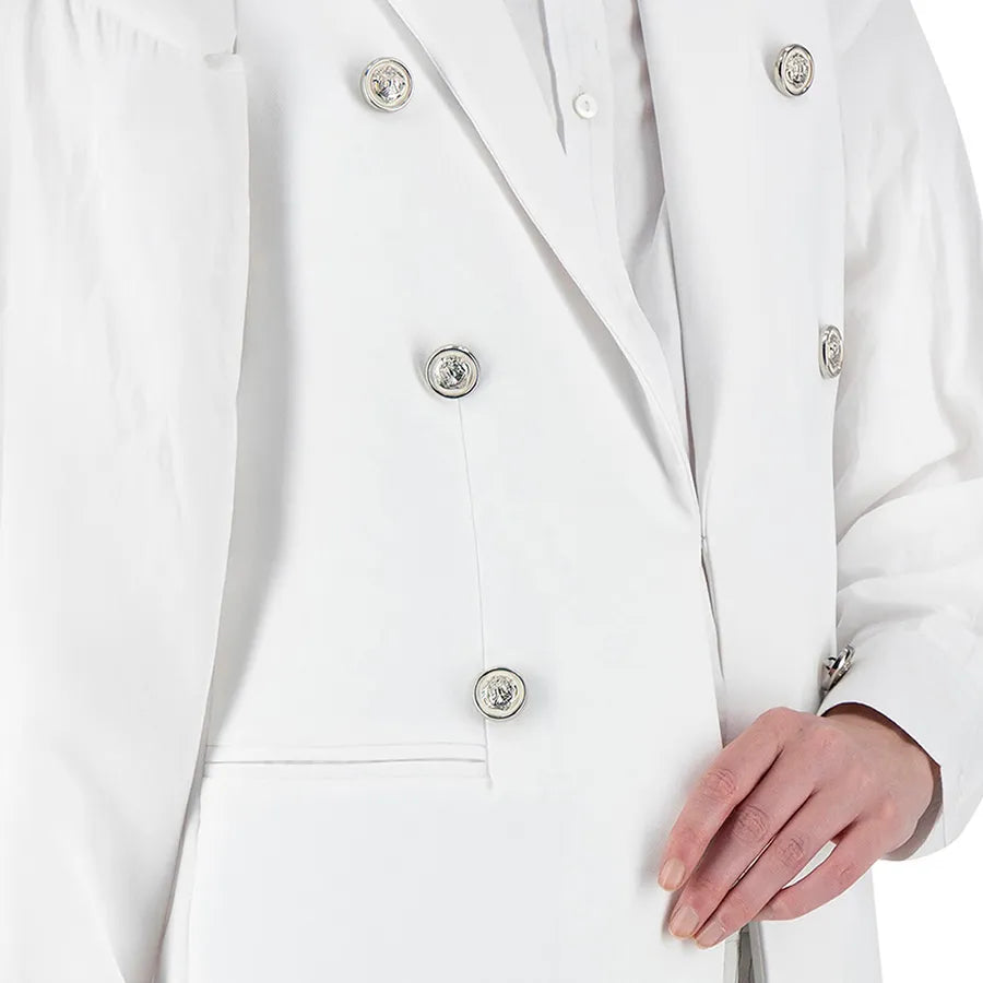 Su corte largo proporciona una caída fluida y elegante, mientras que los detalles de confección realzan su estética pulida y profesional.