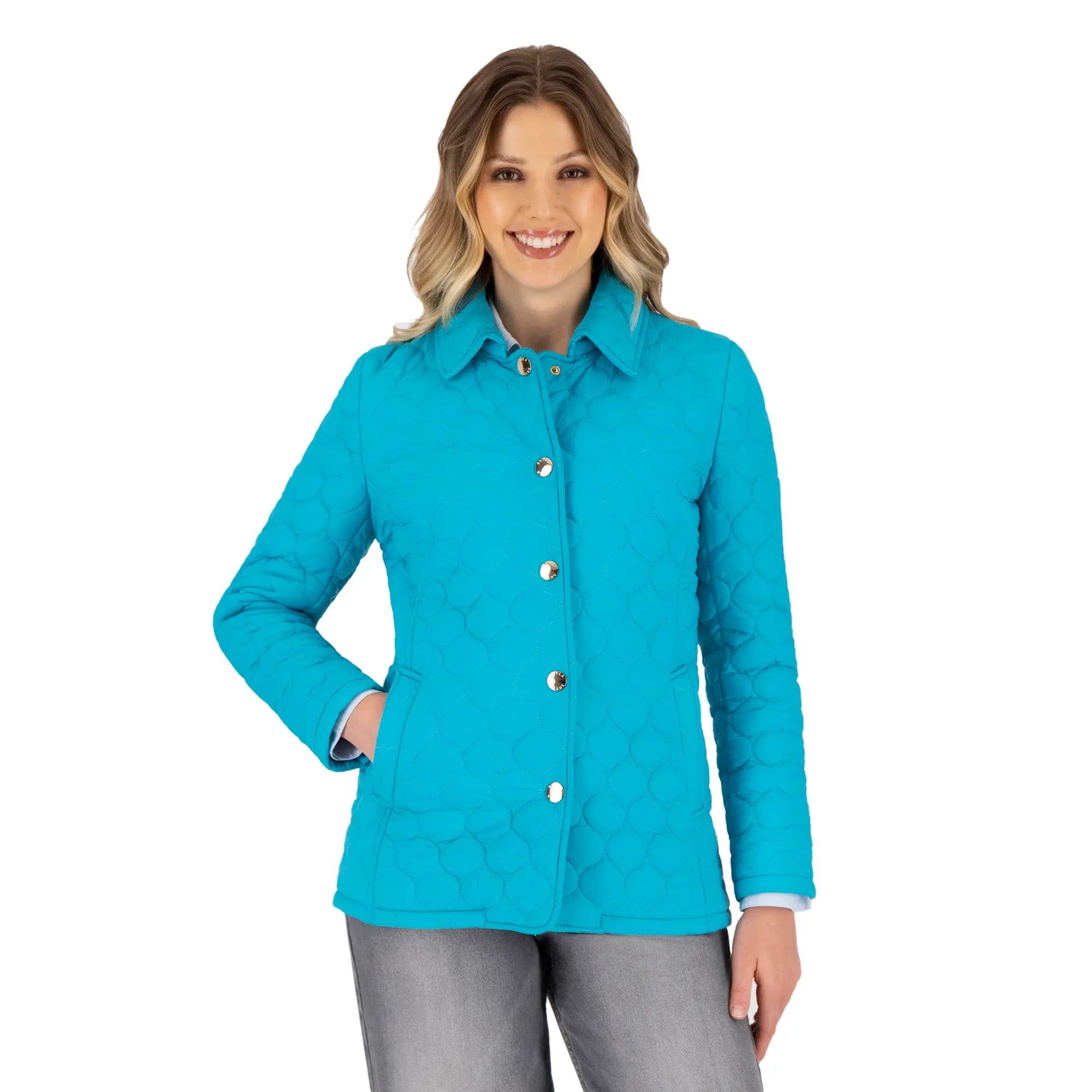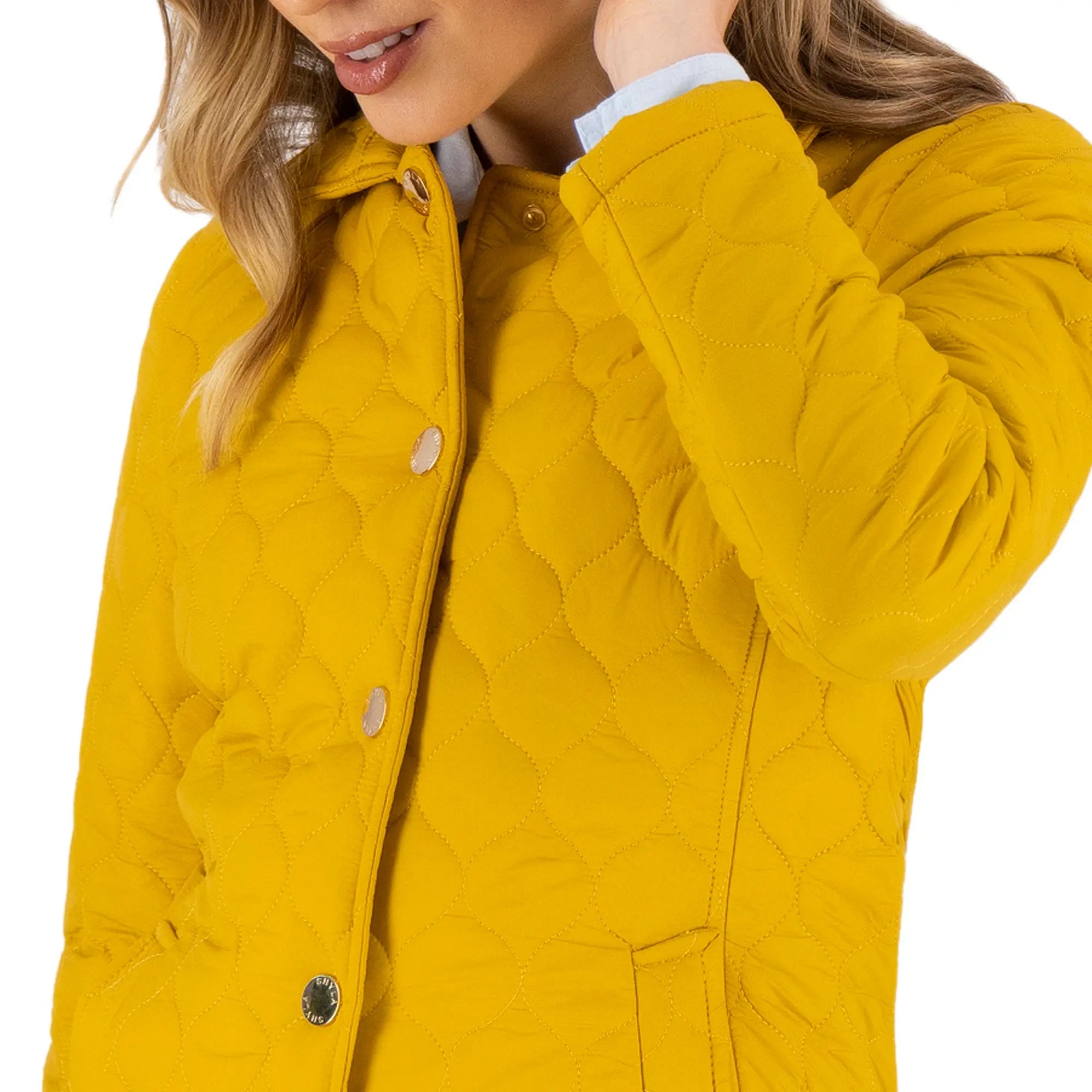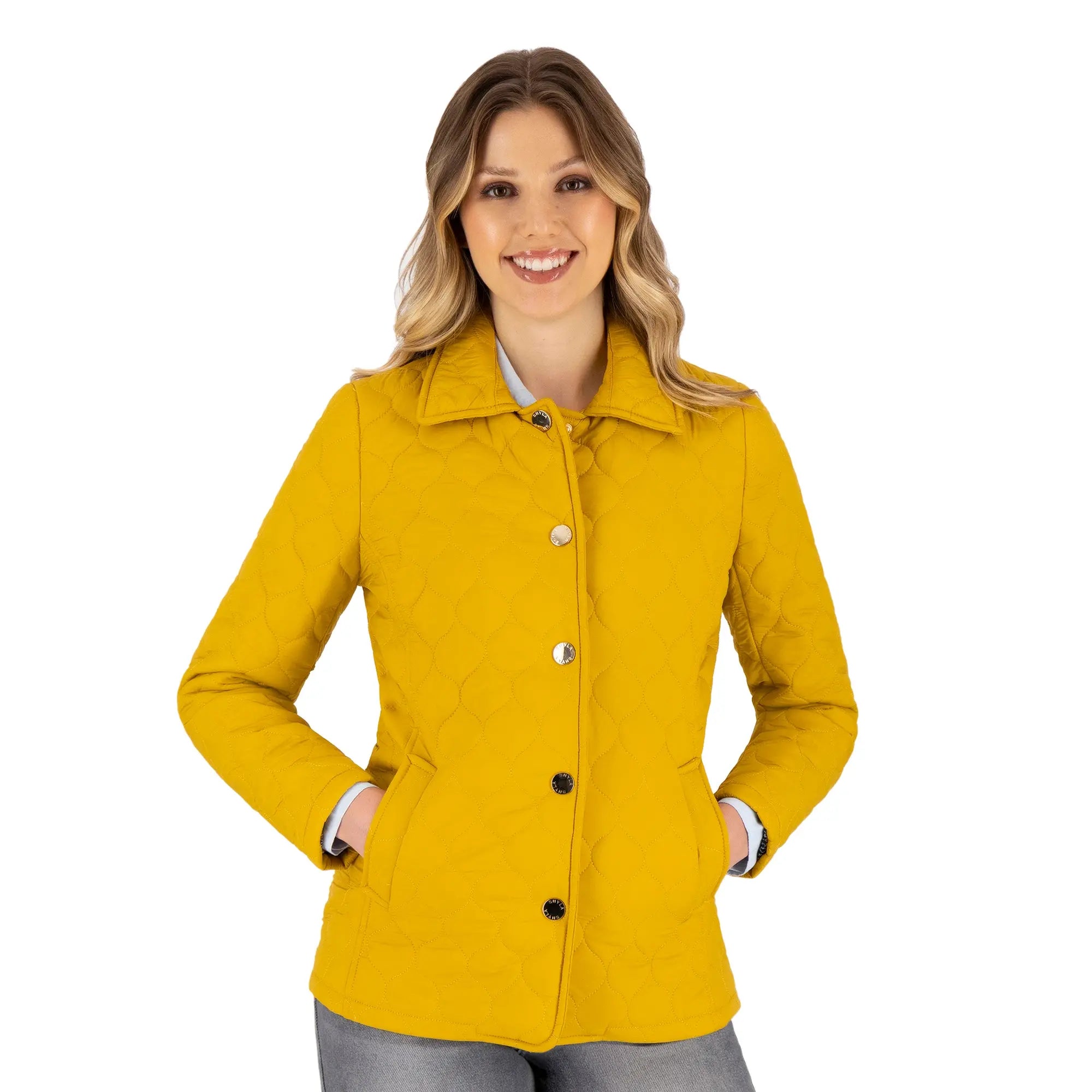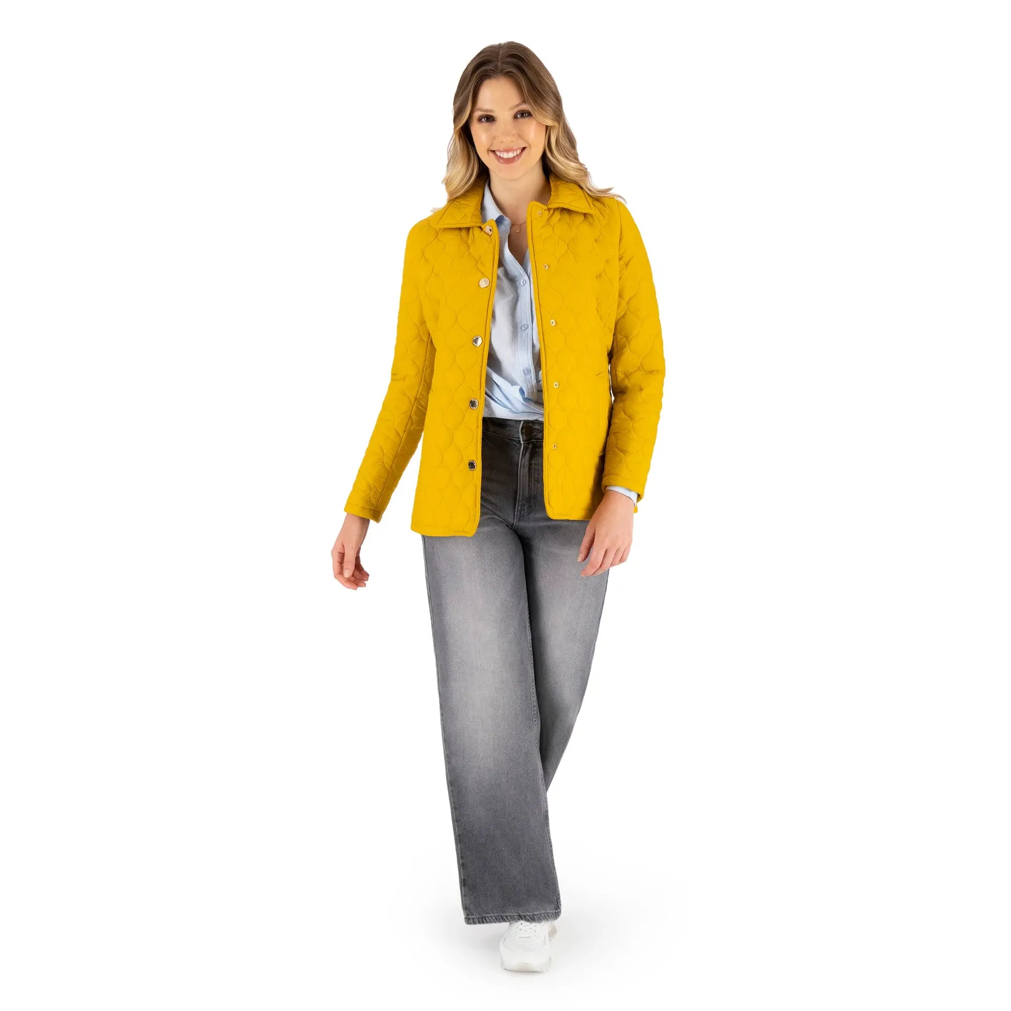 Chamarra acolchada de diseño clásico con cuello camisero. Capitonado redondeado para un acabado elegante. Cierre frontal con botones metálicos. Versátil y cómoda para el día a día.