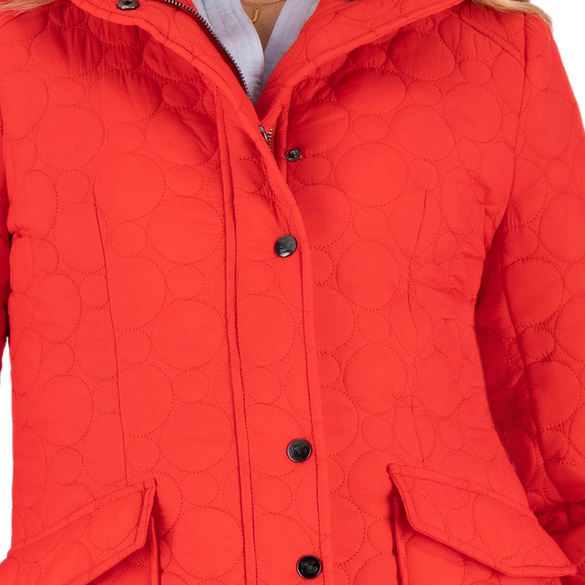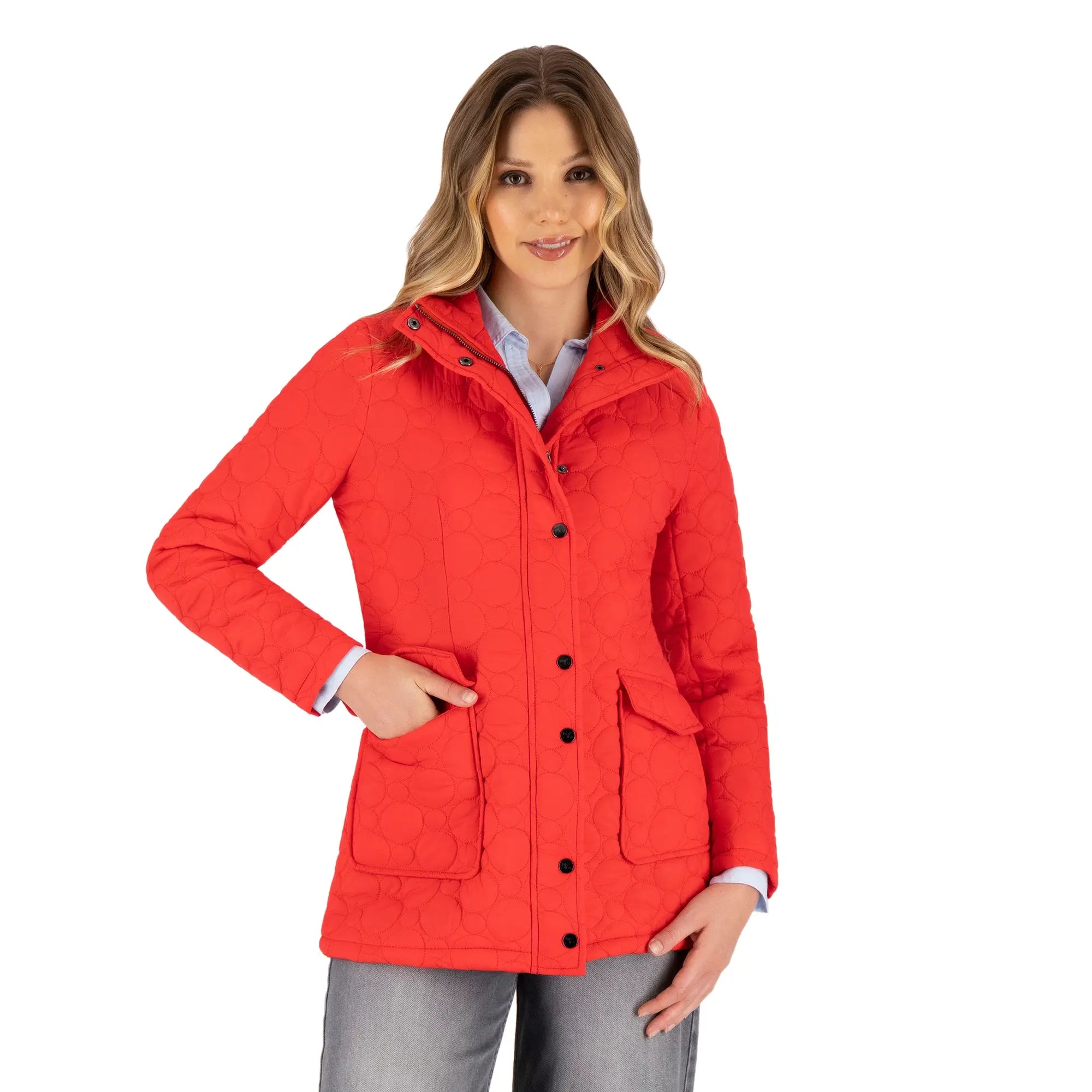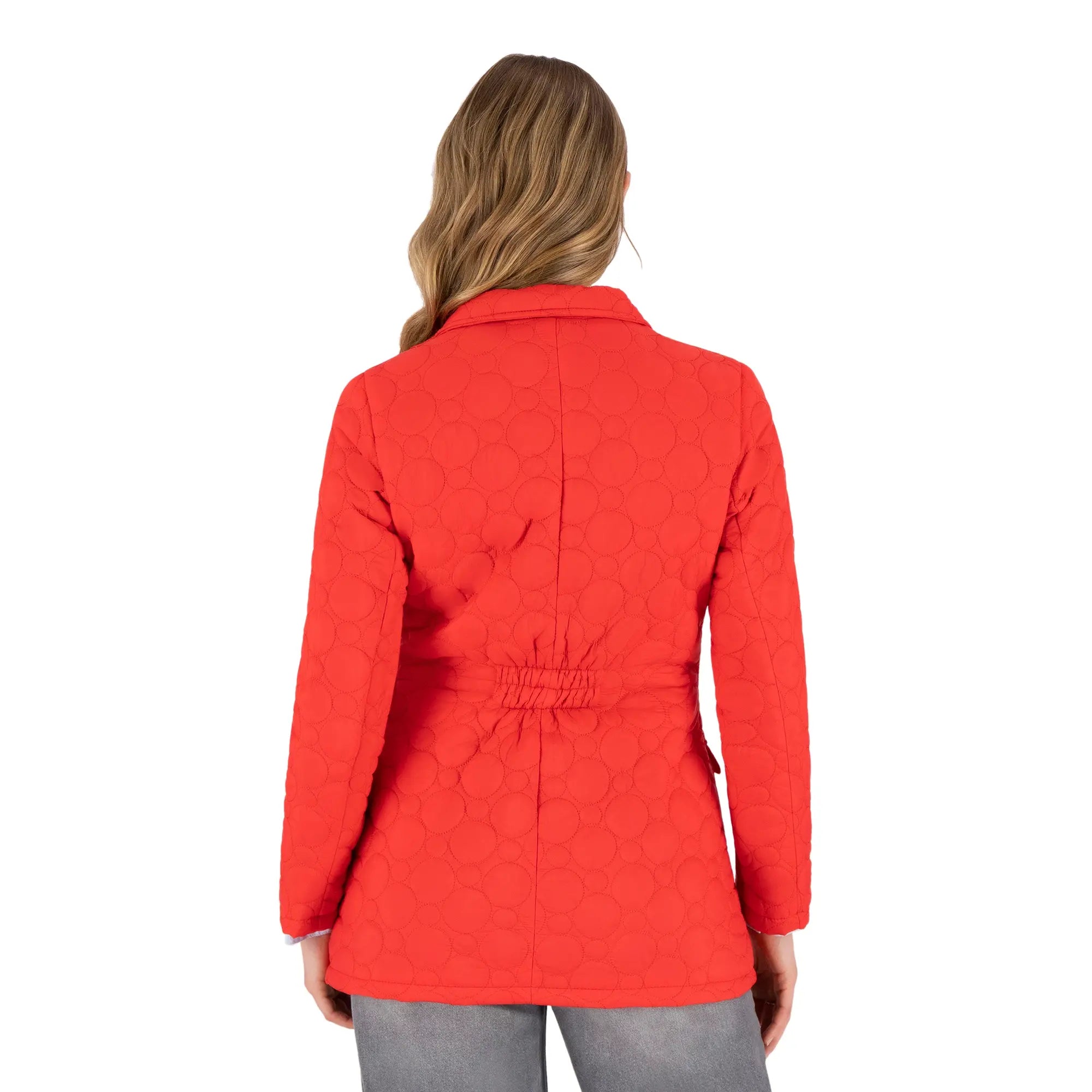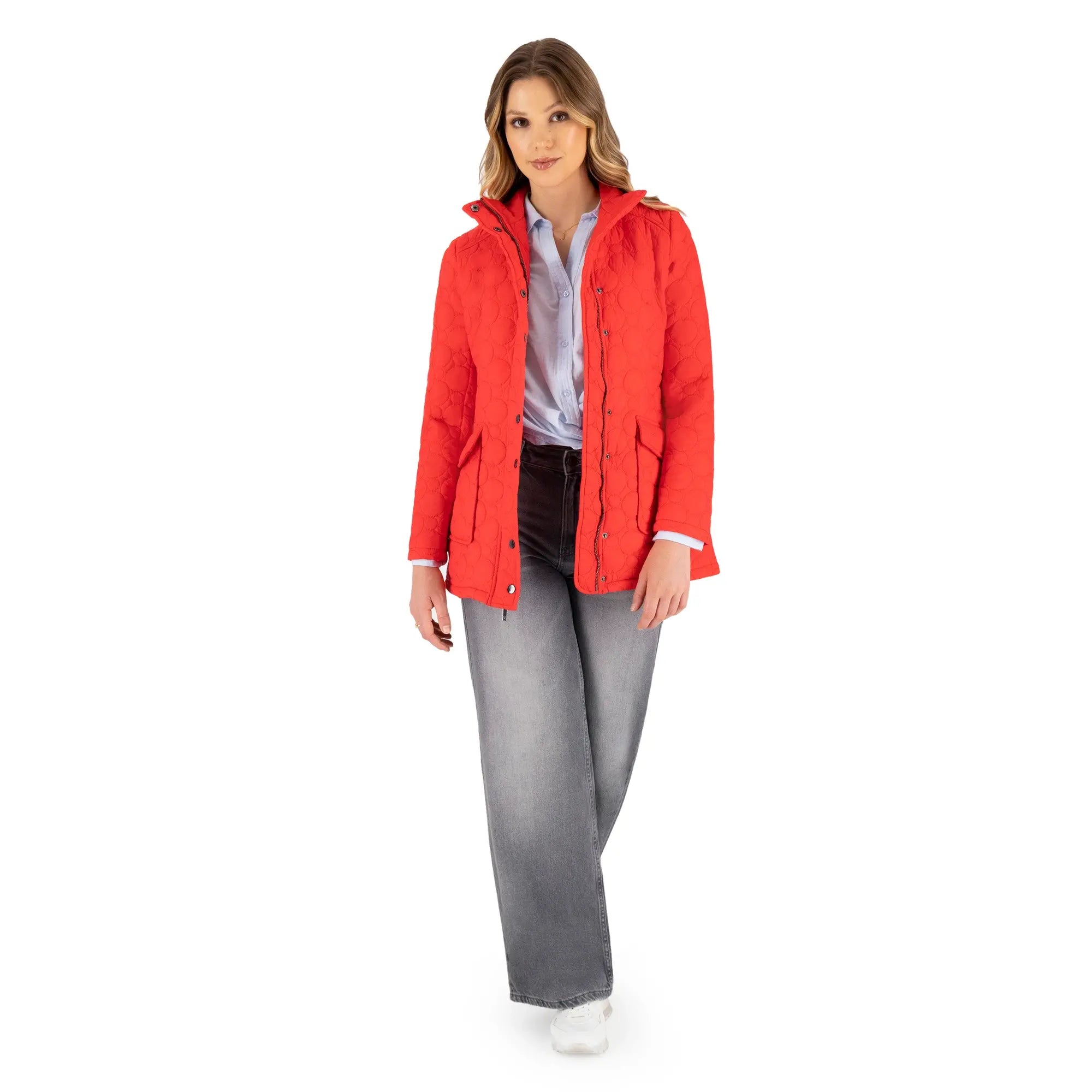 Chamarra acolchada con capitonado circular y cuello alto. Cierre frontal con cremallera oculta y botones metálicos. Bolsillos delanteros amplios con solapa. Panel elástico en la espalda para mayor comodidad y una silueta definida. Funcional, cálida y fácil de combinar.