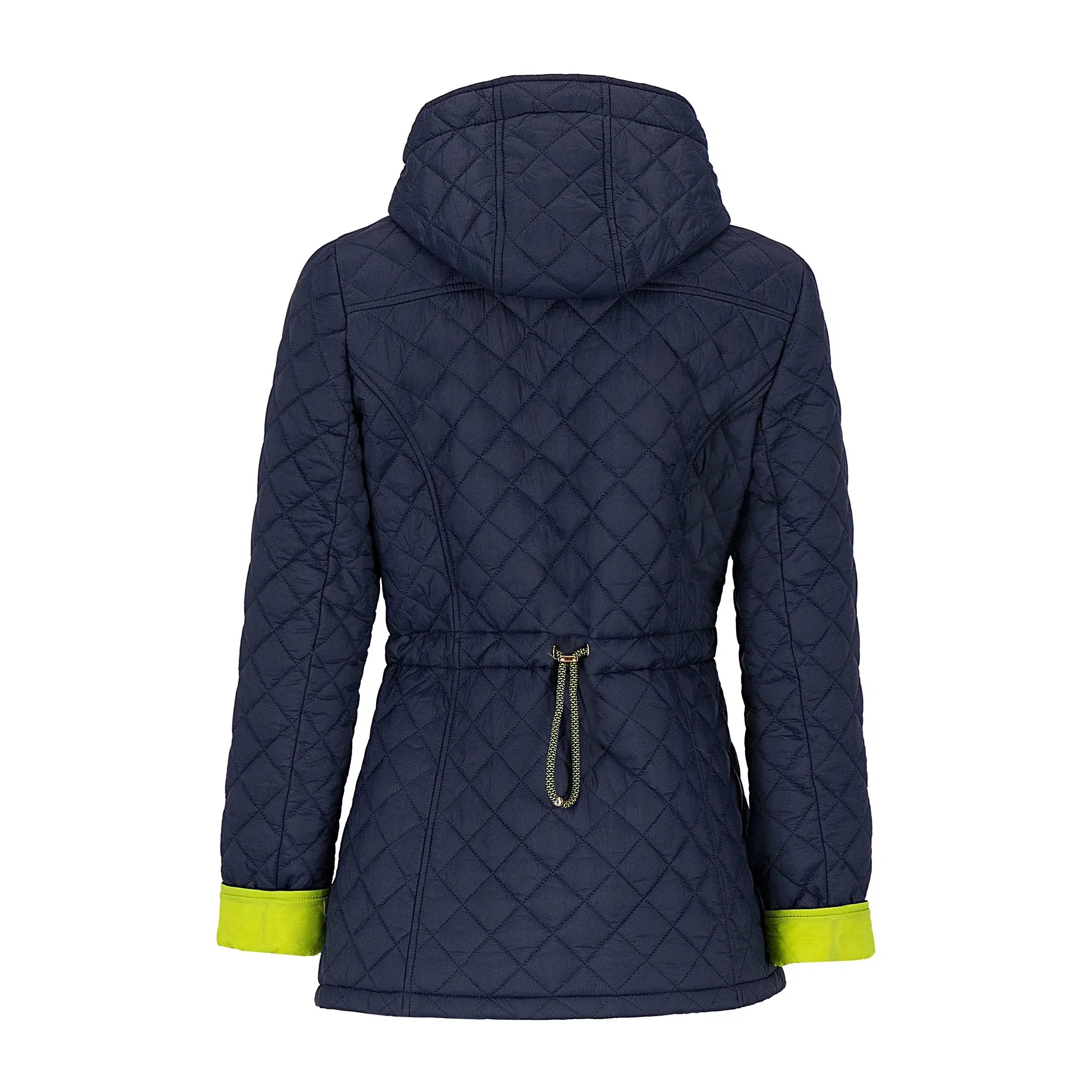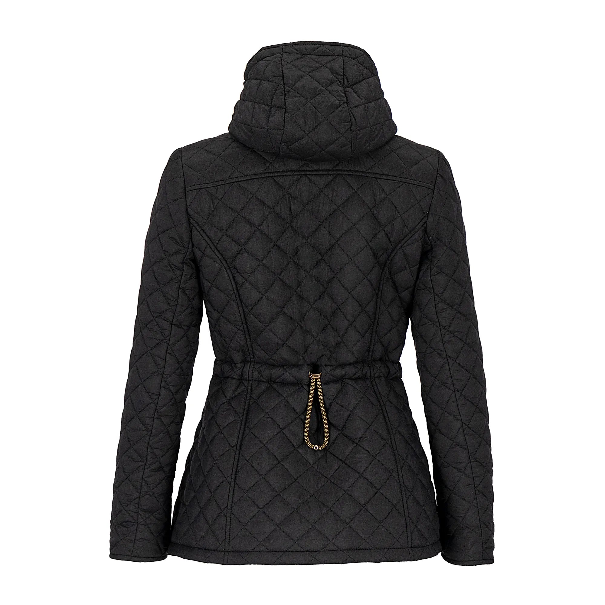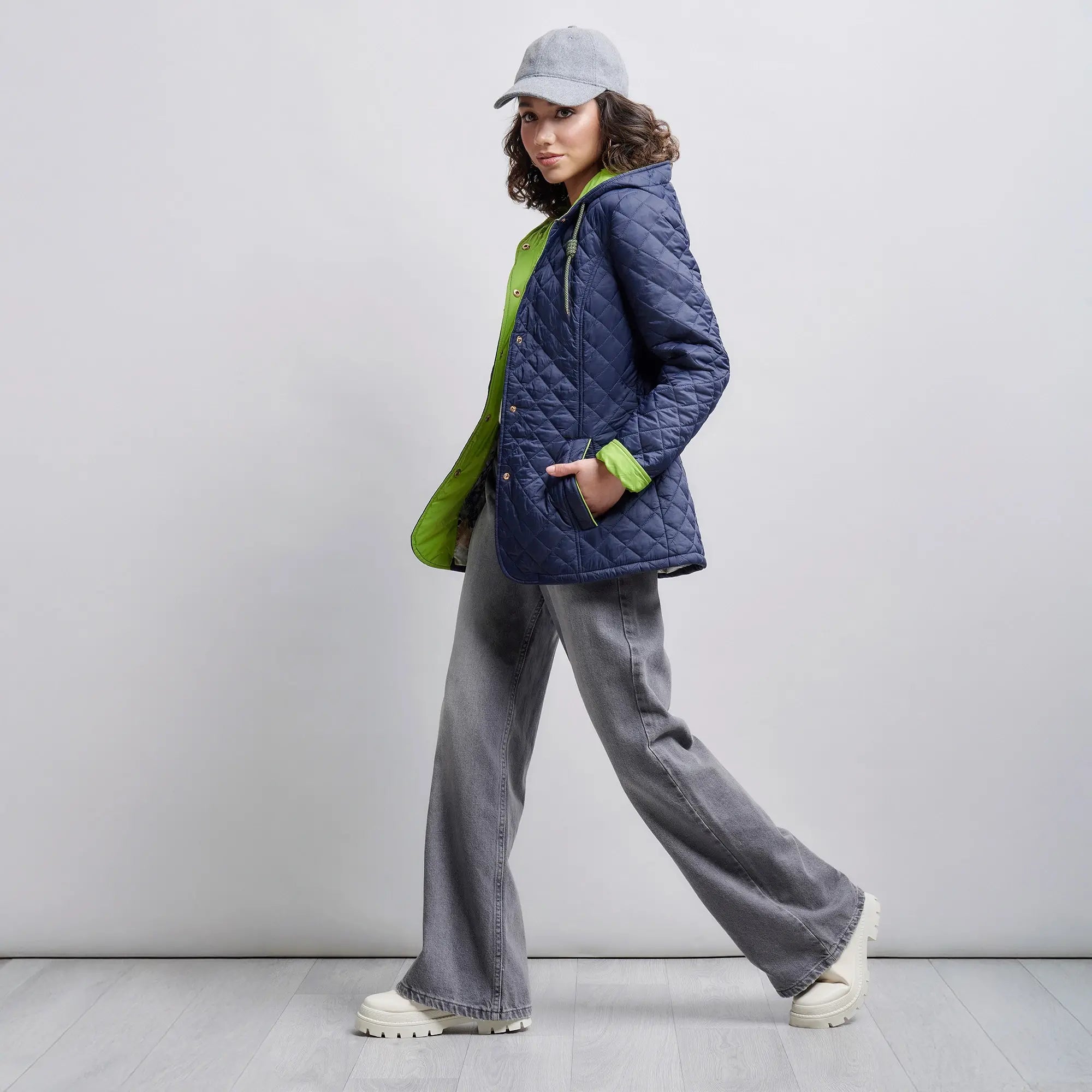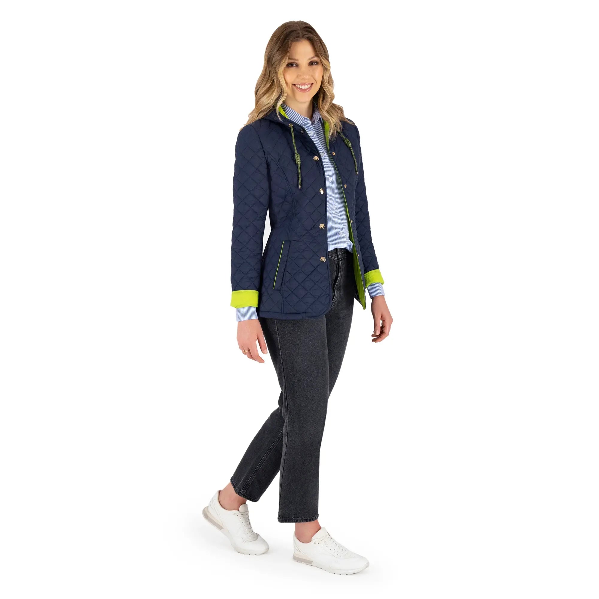 Chamarra con capucha integrada. Cierre frontal con botones metálicos. Jareta ajustable en la espalda que realza la cintura. Detalles en contraste para un toque moderno. Versátil y cómoda.