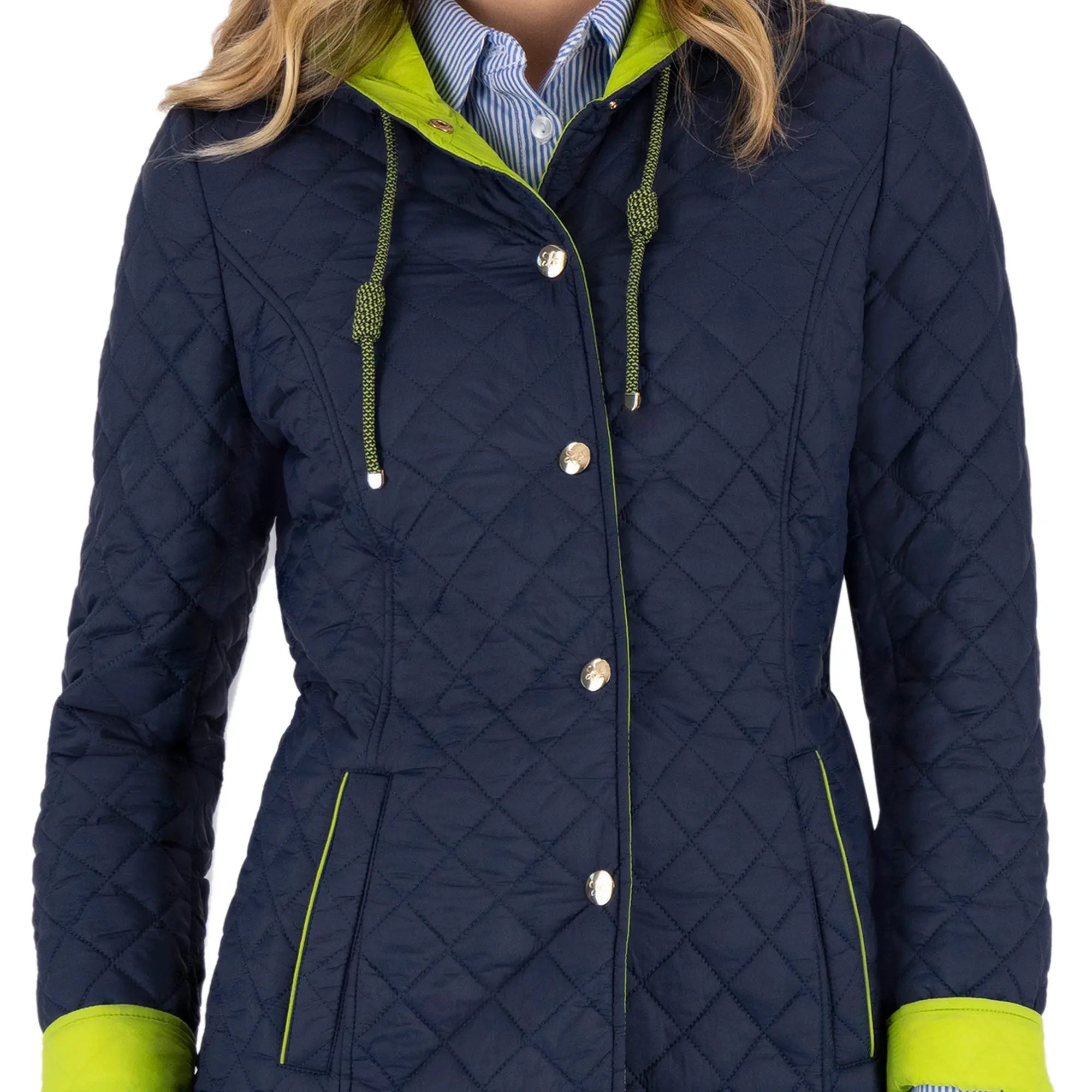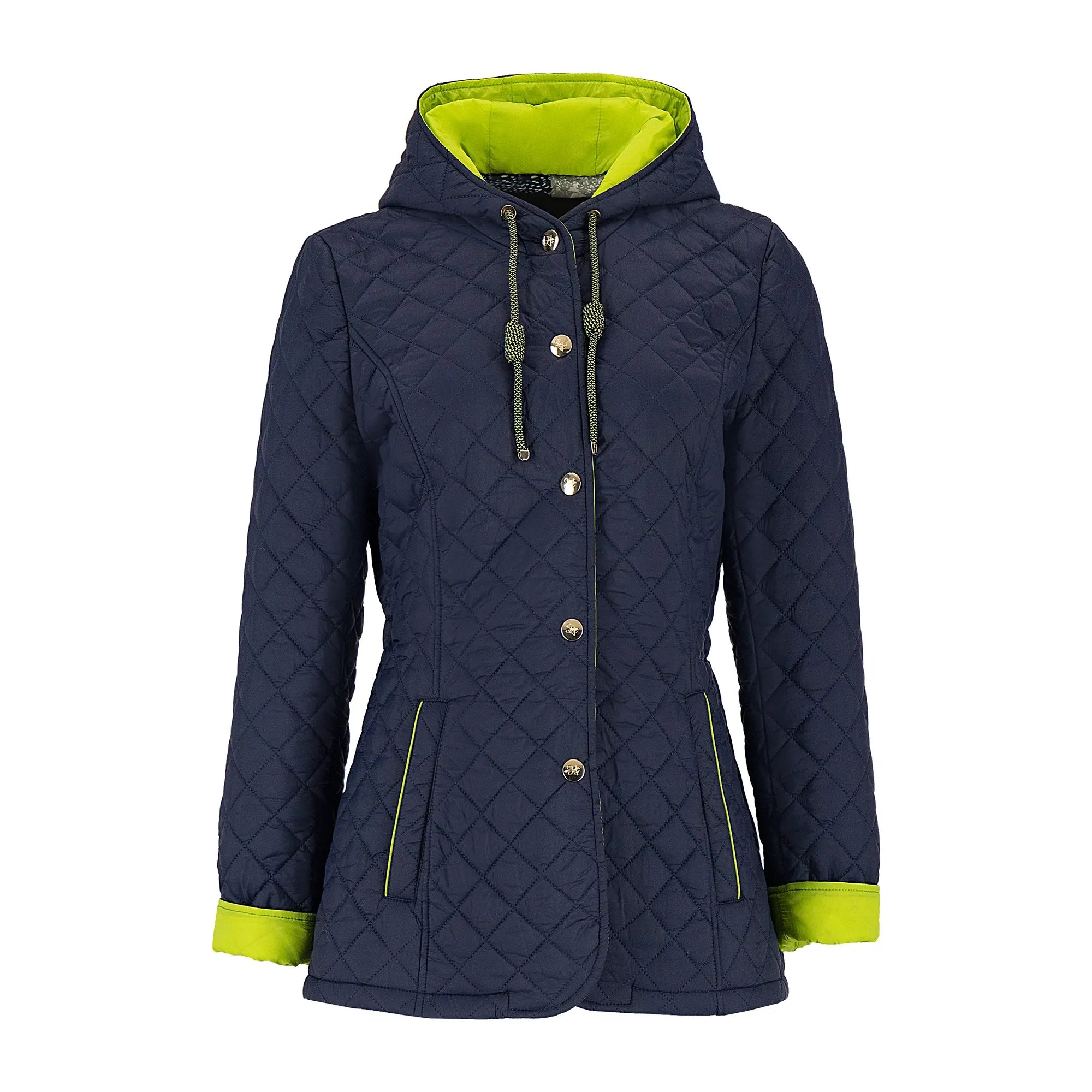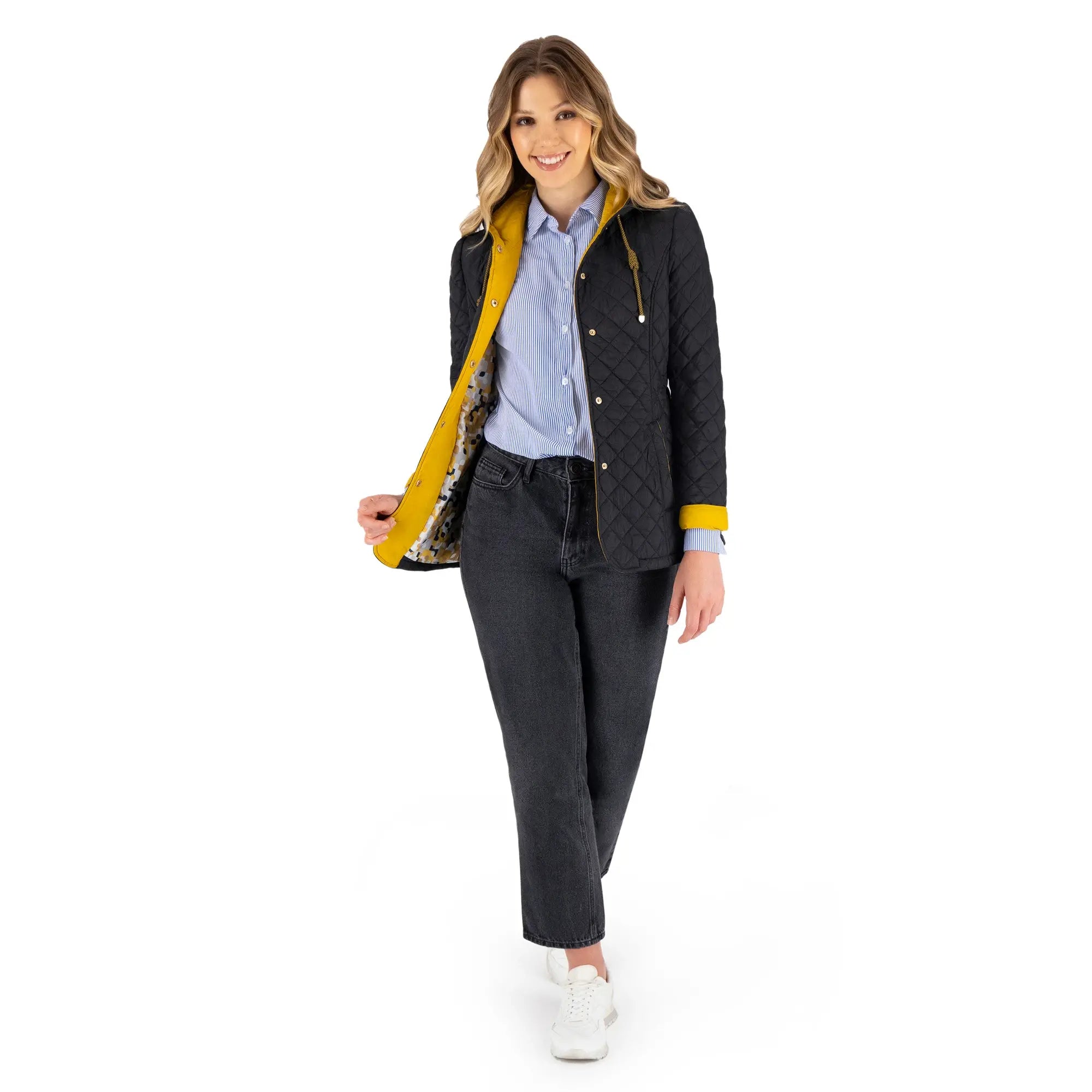 Chamarra con capucha integrada. Cierre frontal con botones metálicos. Jareta ajustable en la espalda que realza la cintura. Detalles en contraste para un toque moderno. Versátil y cómoda.