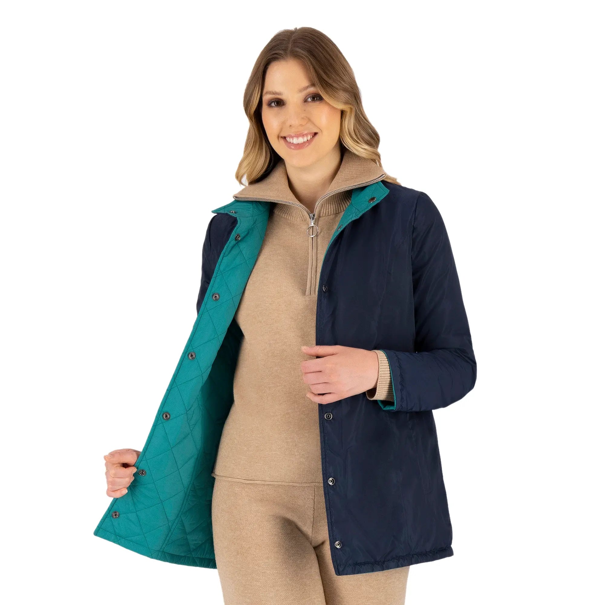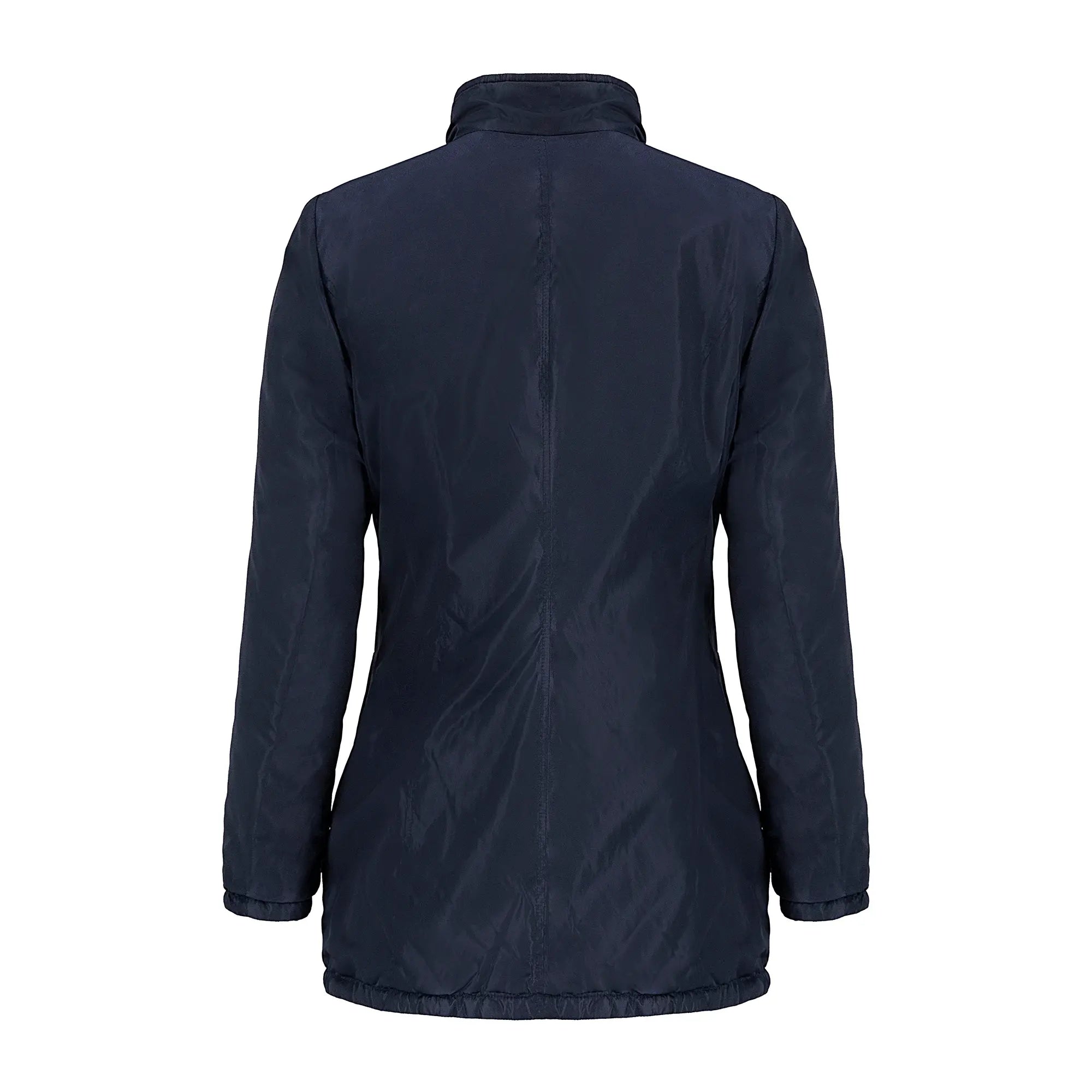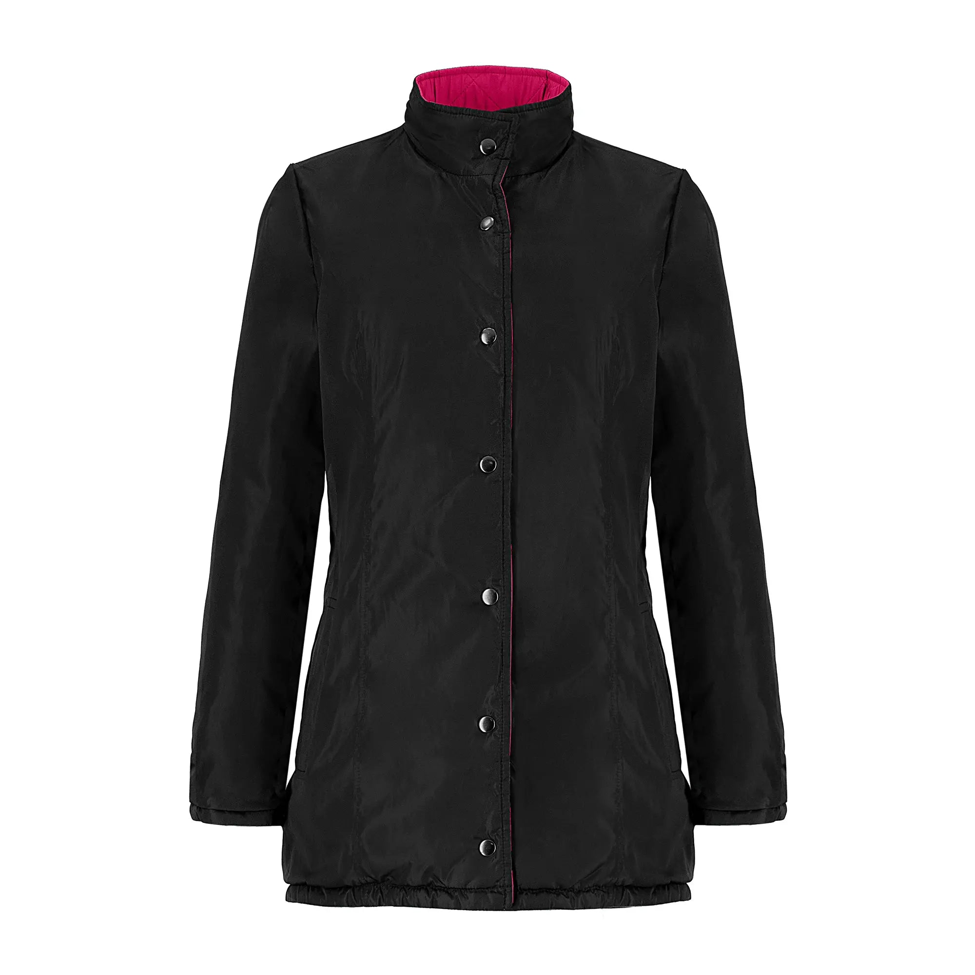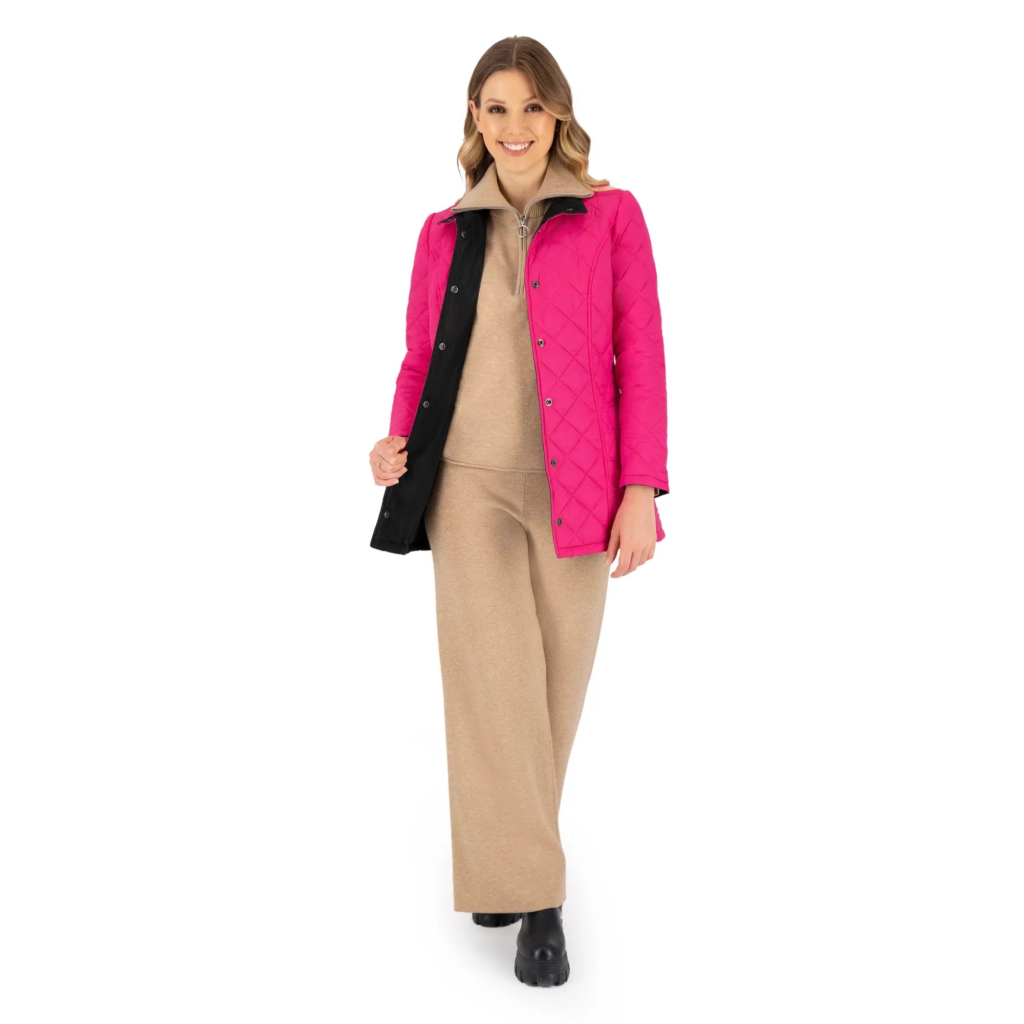 Chamarra doble vista de cuello mao. Costuras en rombo que estilizan la silueta. Cierre frontal con botones metálicos. Dos looks en una sola prenda: práctica y fácil de combinar.