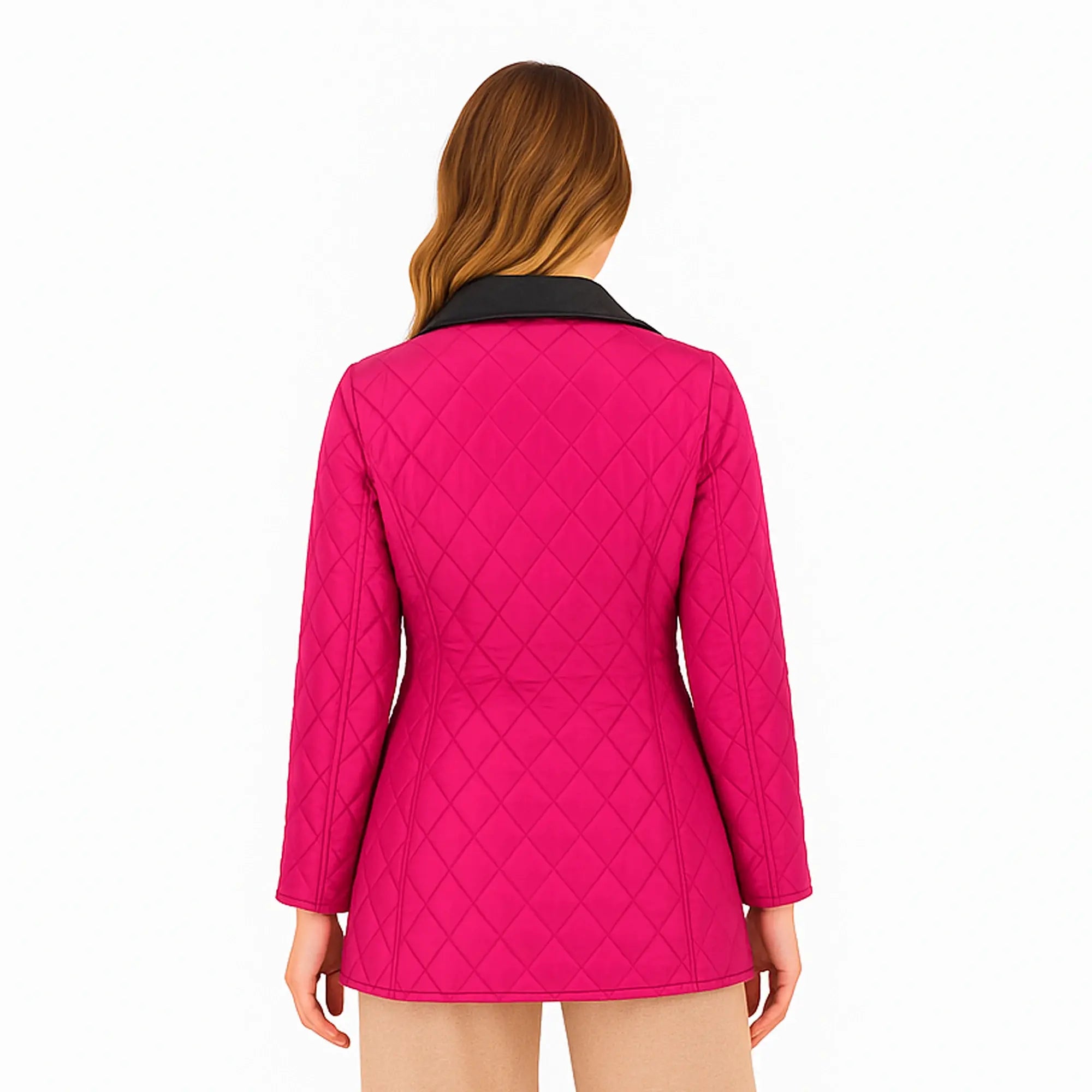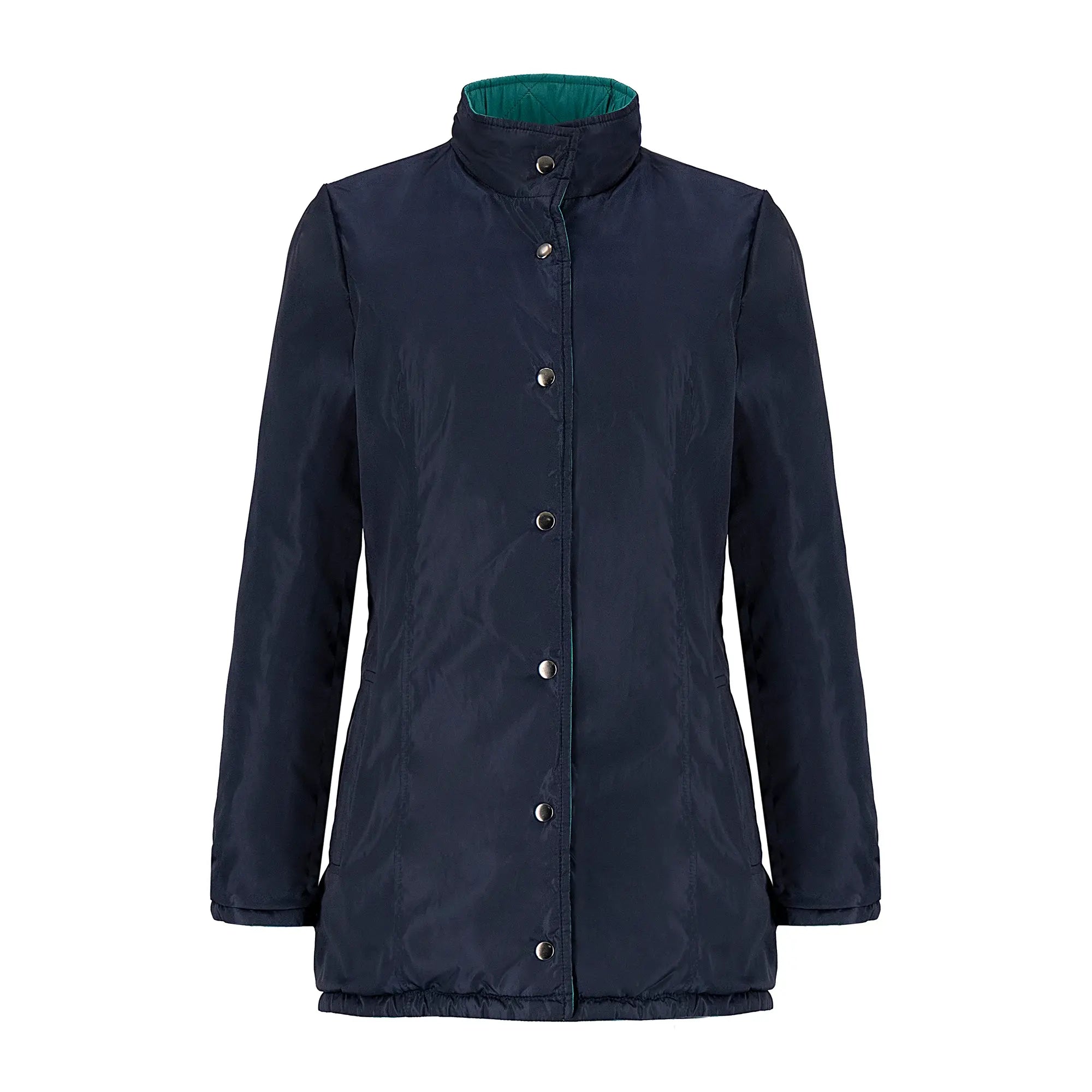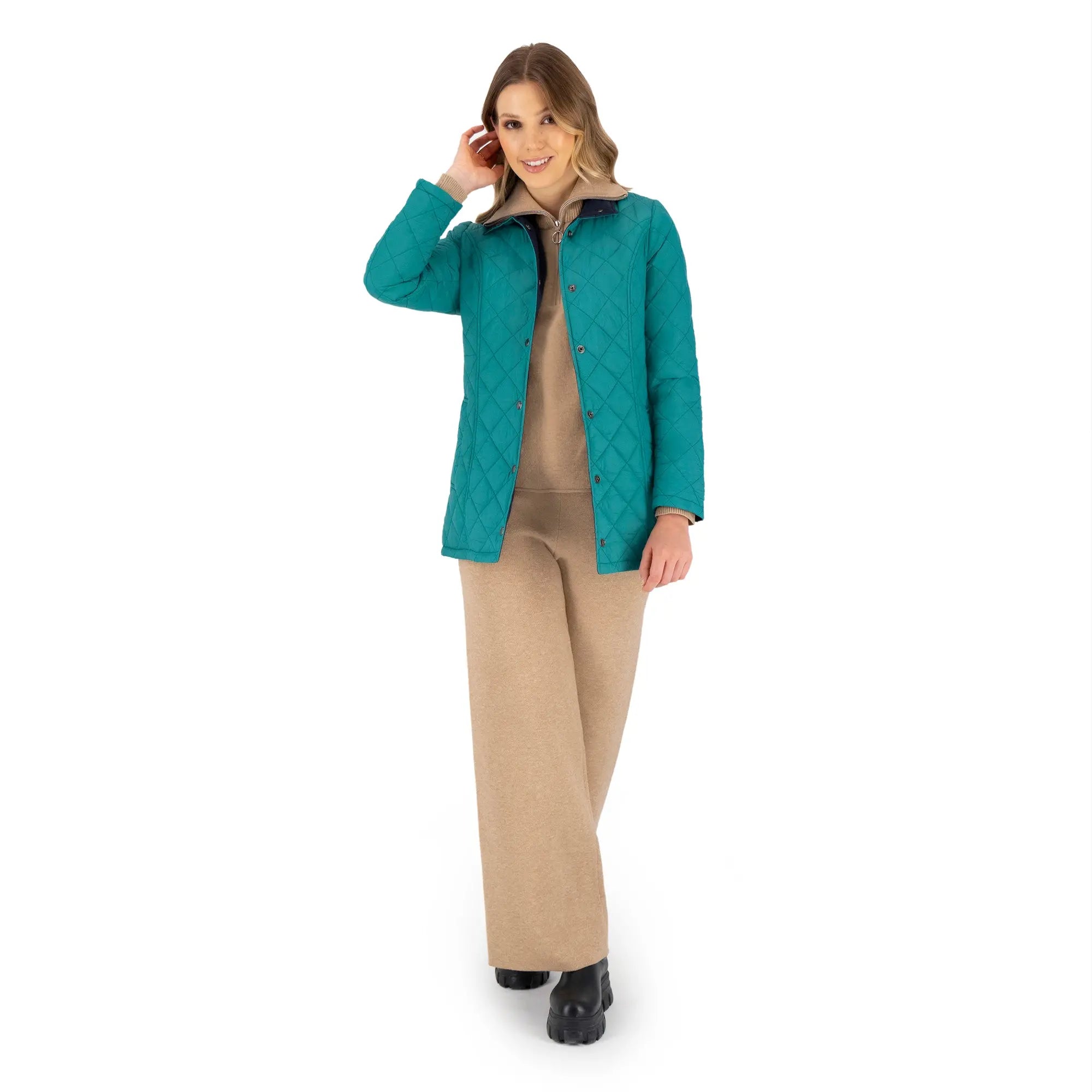 Chamarra doble vista de cuello mao. Costuras en rombo que estilizan la silueta. Cierre frontal con botones metálicos. Dos looks en una sola prenda: práctica y fácil de combinar.