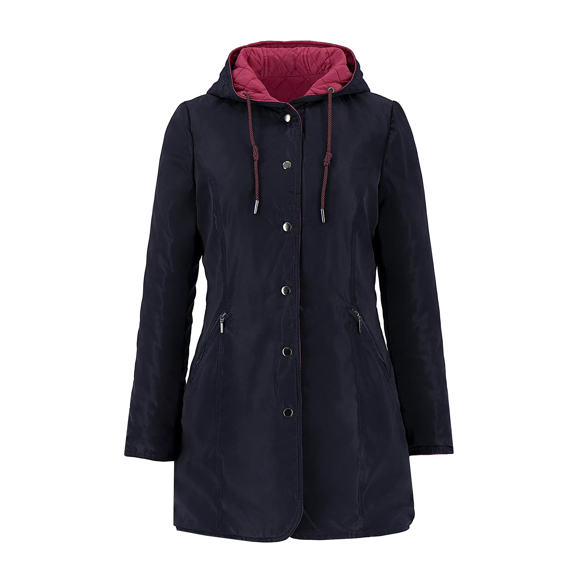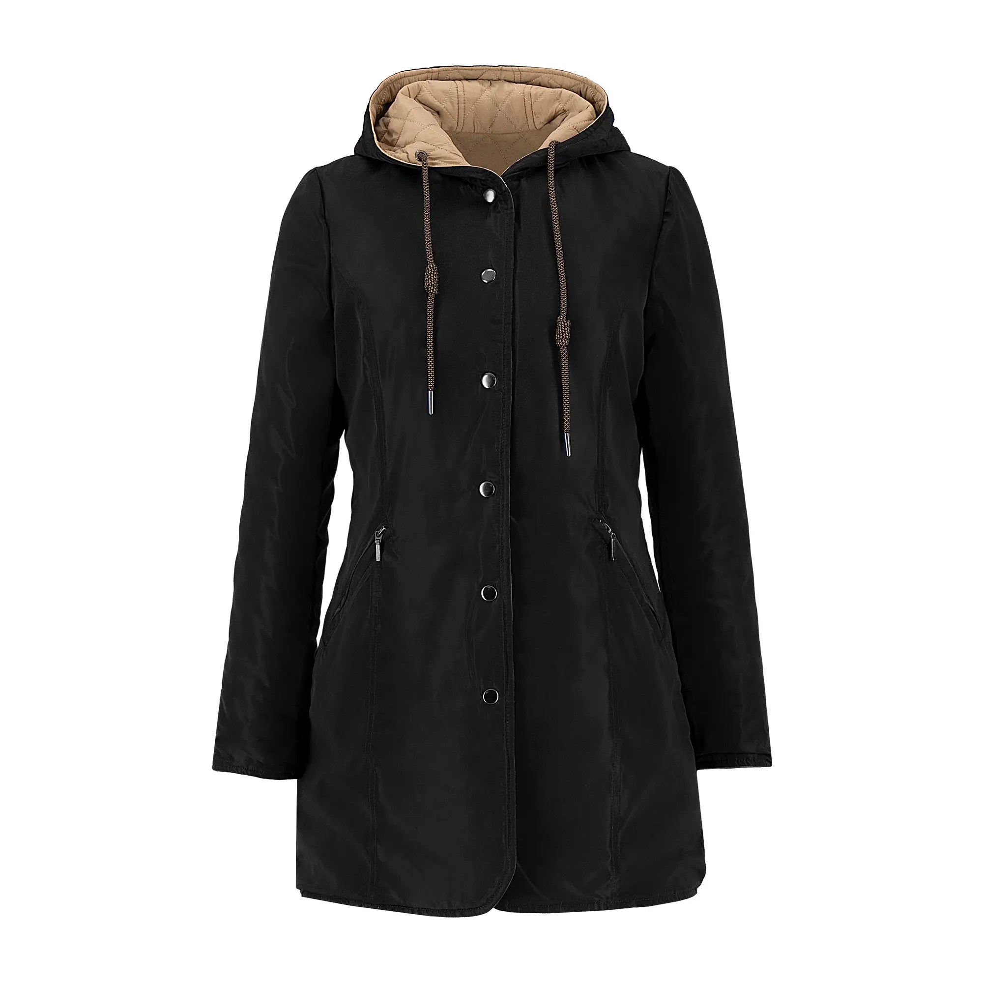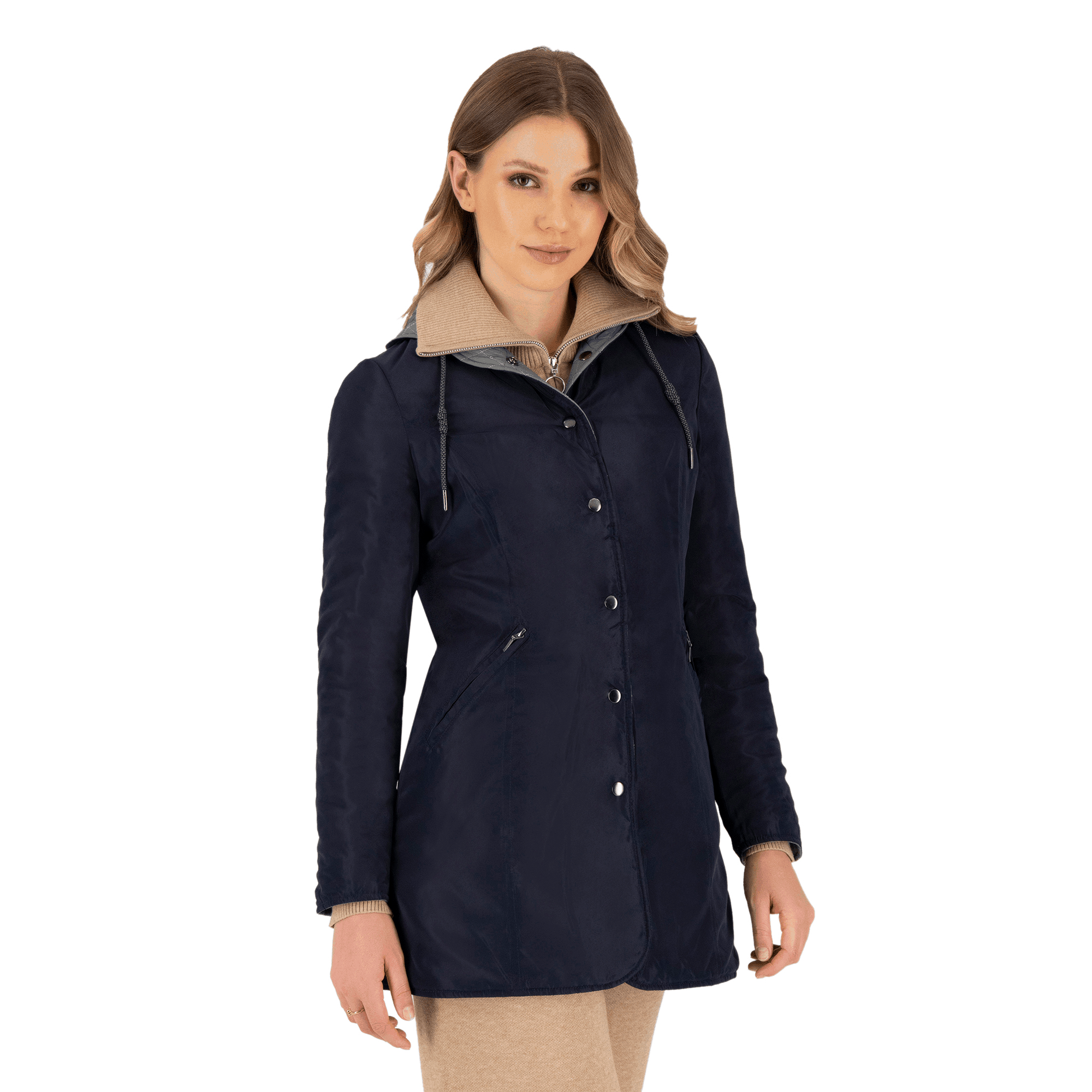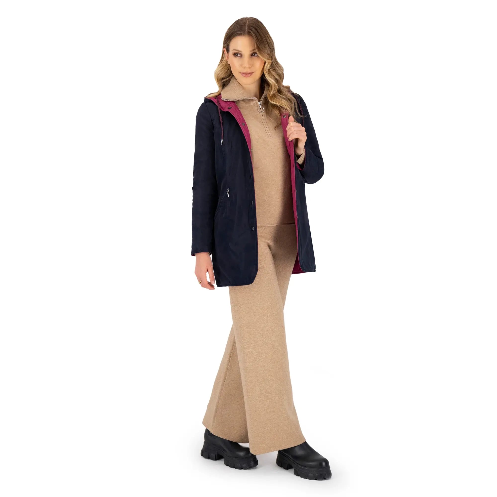 Chamarra doble vista con gorro integrado. Cierre frontal con botones metálicos y bolsillos laterales con cierre. Jareta trasera ajustable para acentuar la cintura. Versátil y práctica.