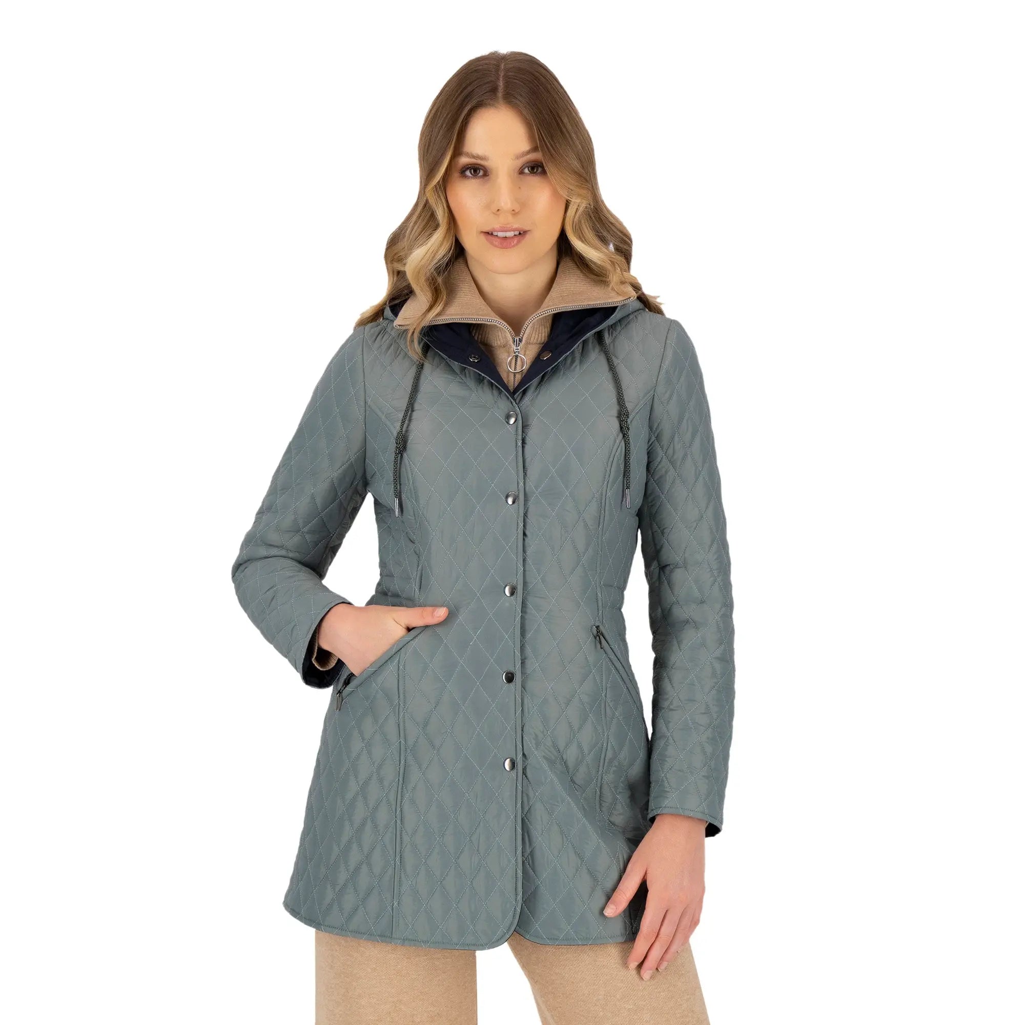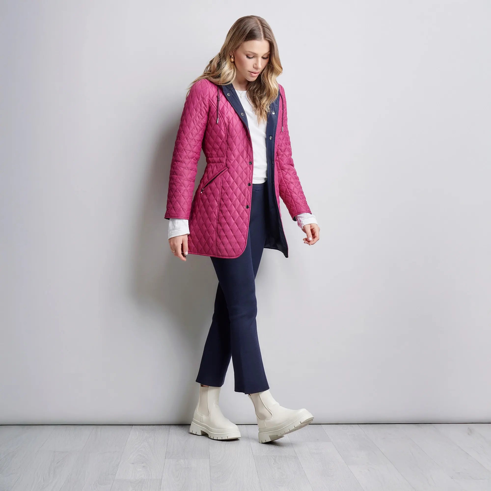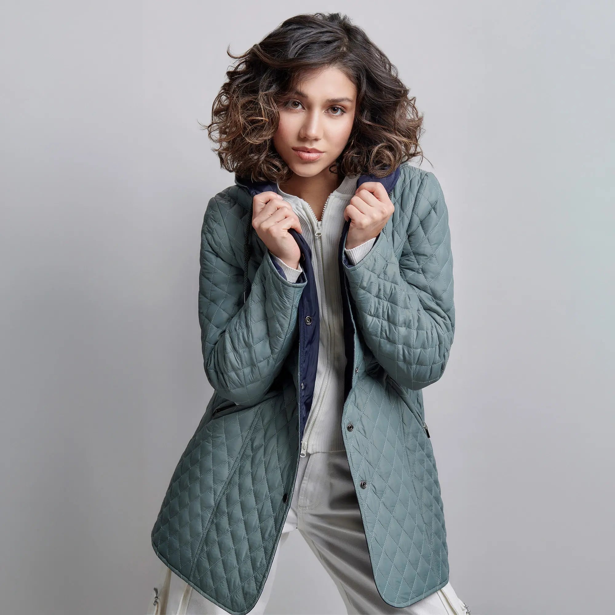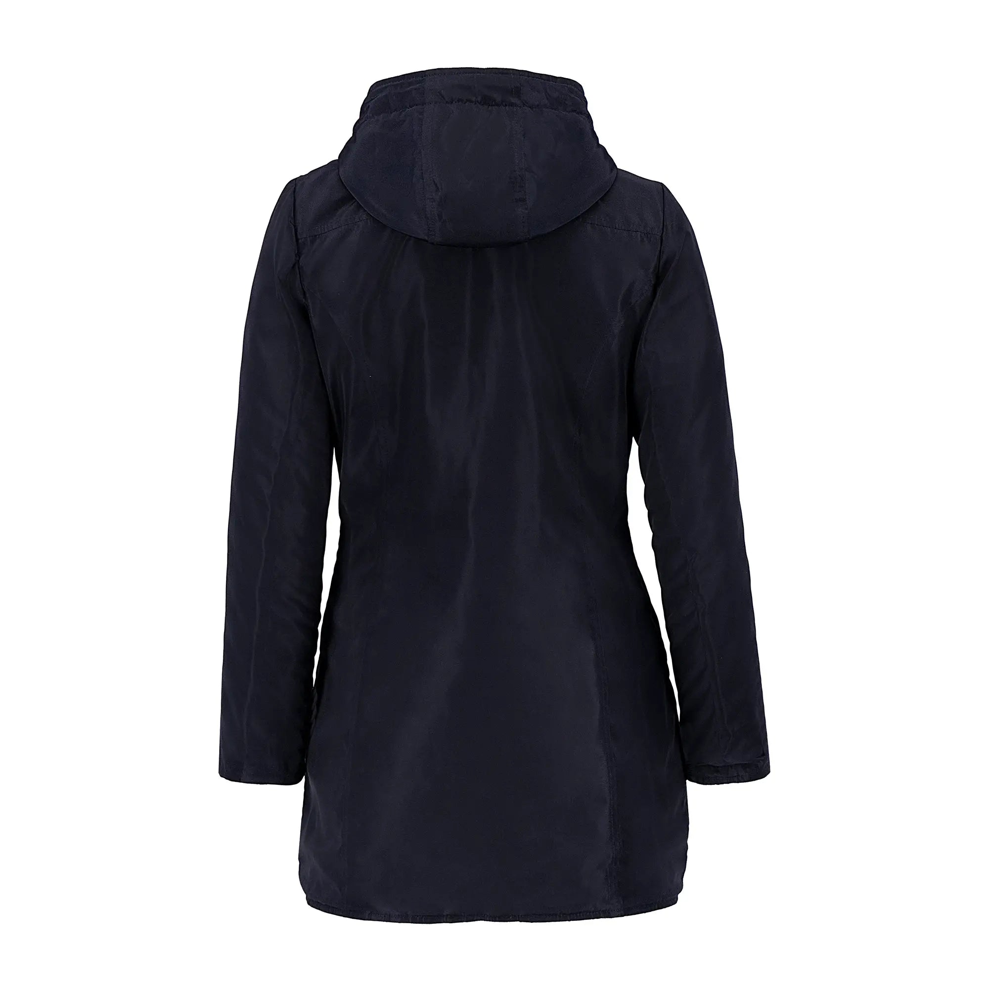 Chamarra doble vista con gorro integrado. Cierre frontal con botones metálicos y bolsillos laterales con cierre. Jareta trasera ajustable para acentuar la cintura. Versátil y práctica.