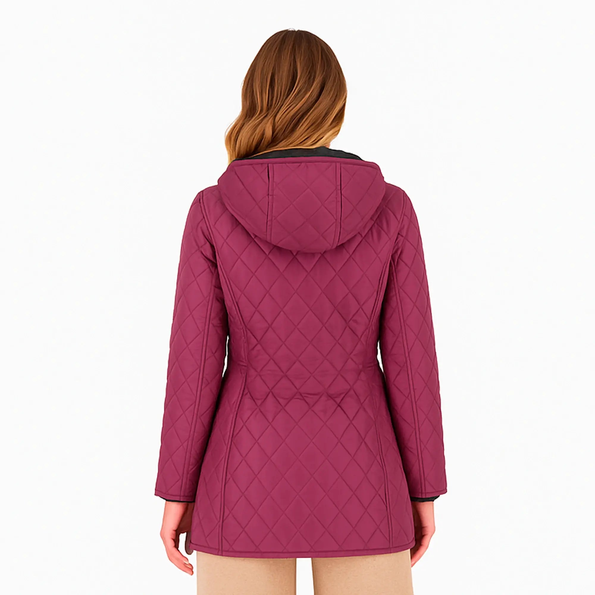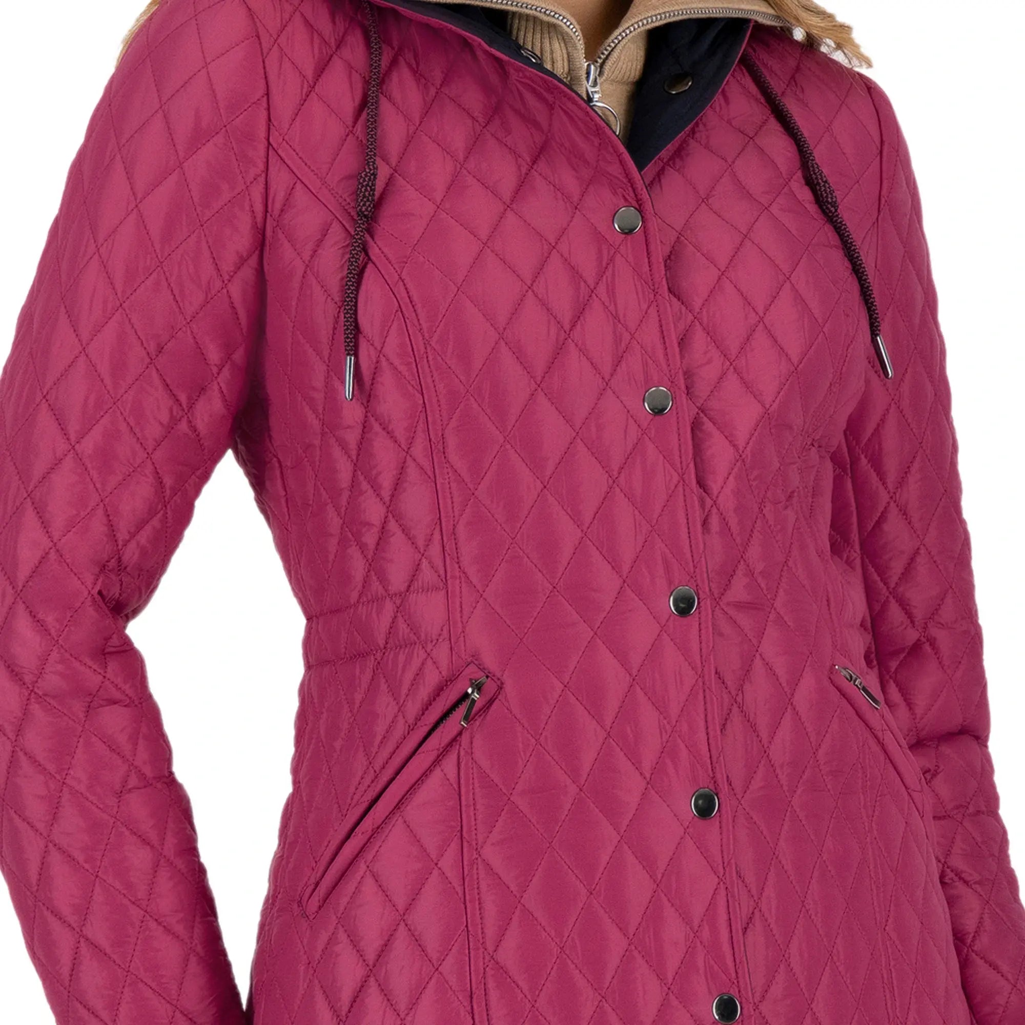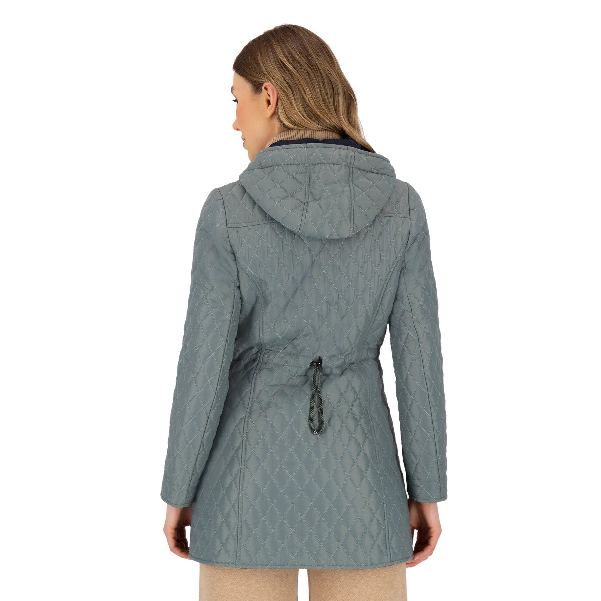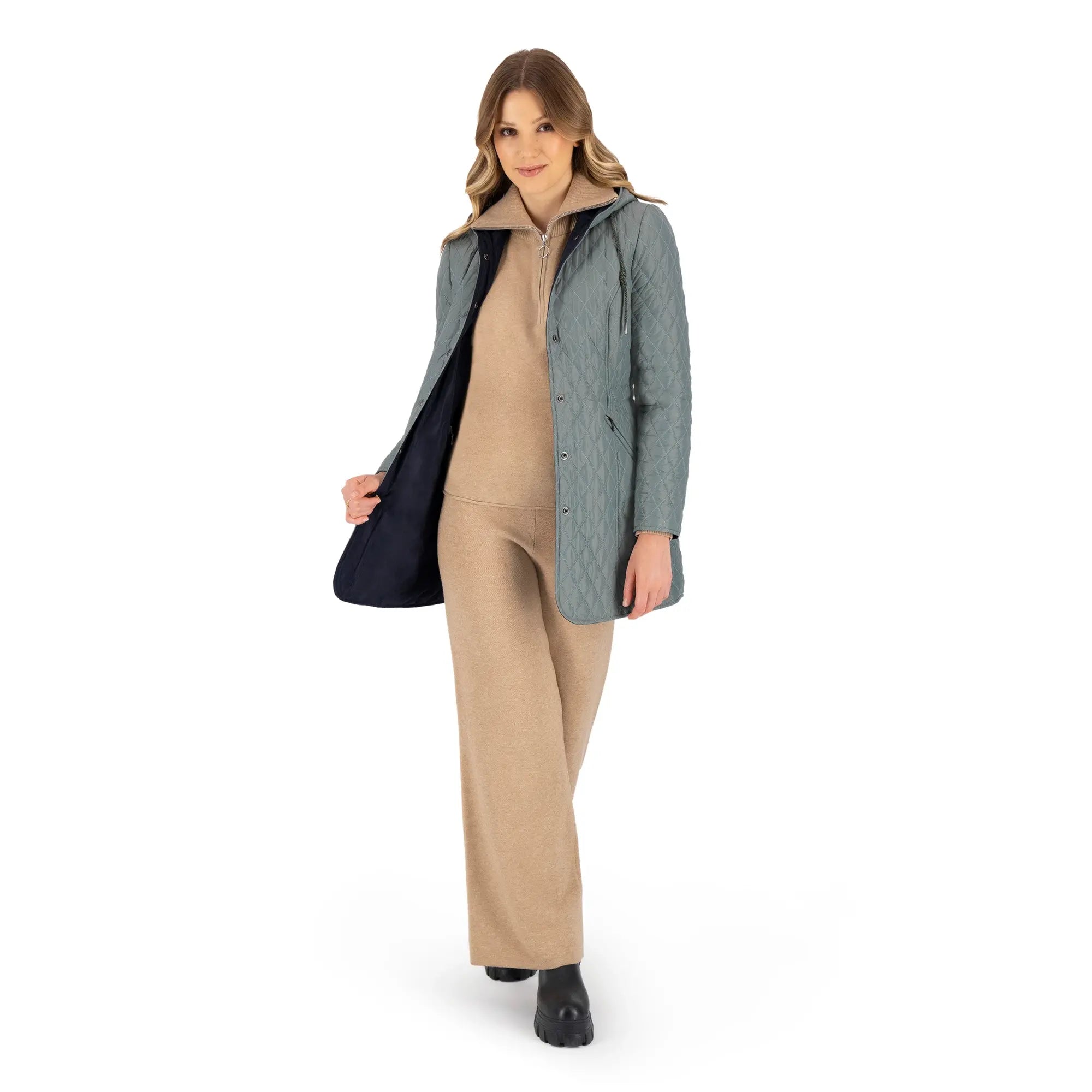Chamarra doble vista con gorro integrado. Cierre frontal con botones metálicos y bolsillos laterales con cierre. Jareta trasera ajustable para acentuar la cintura. Versátil y práctica.