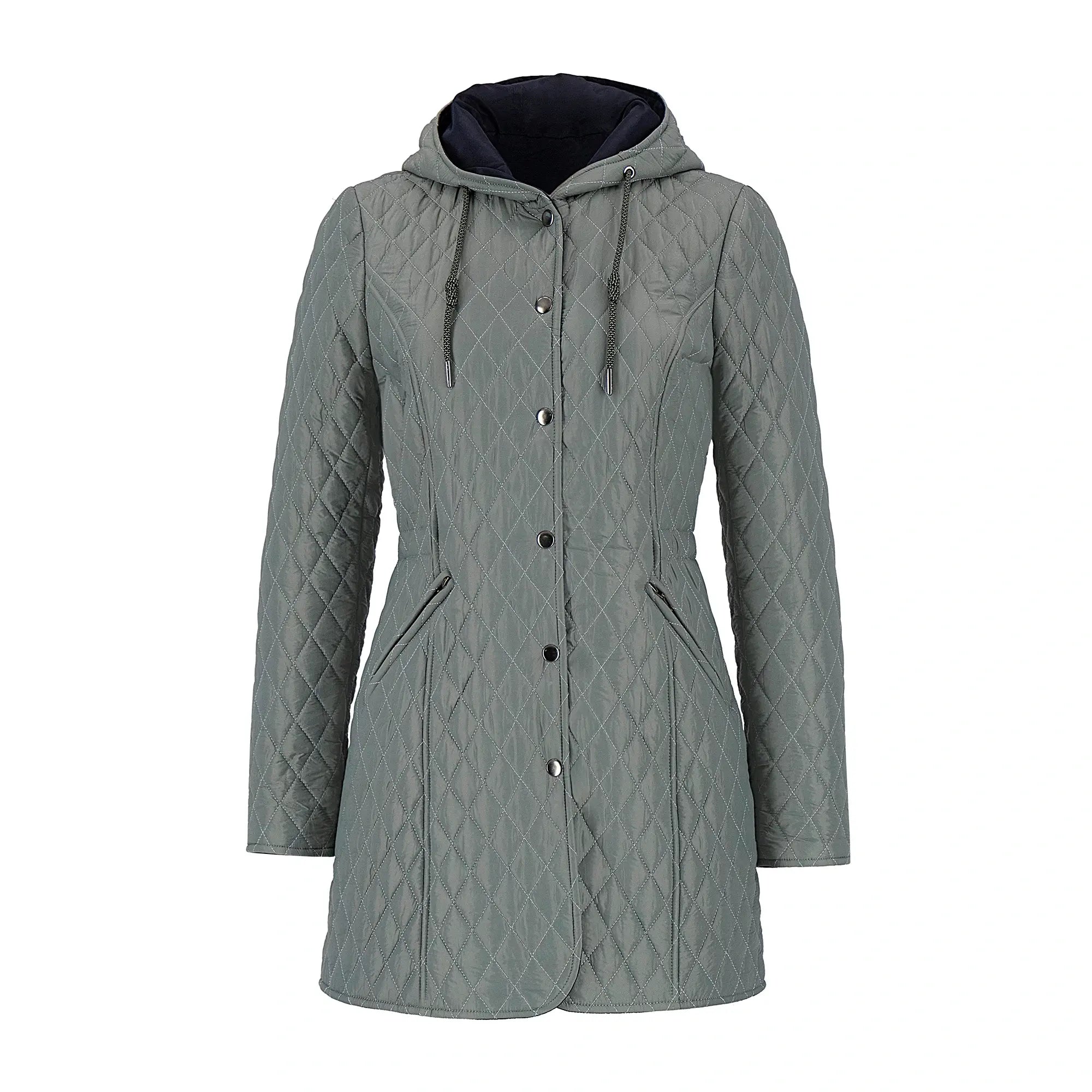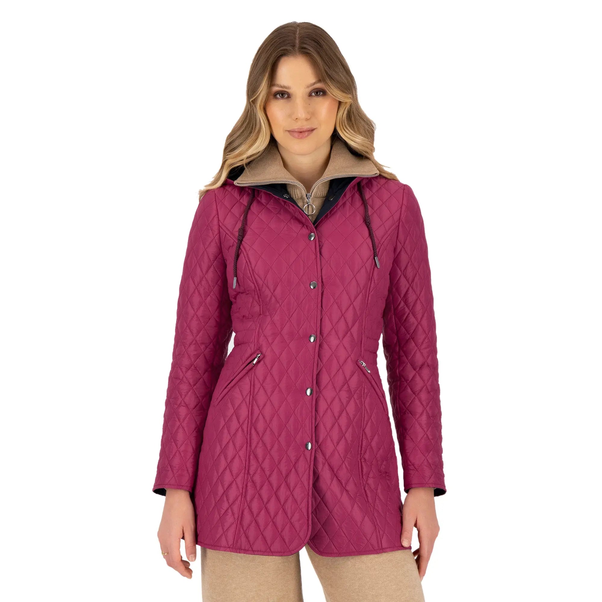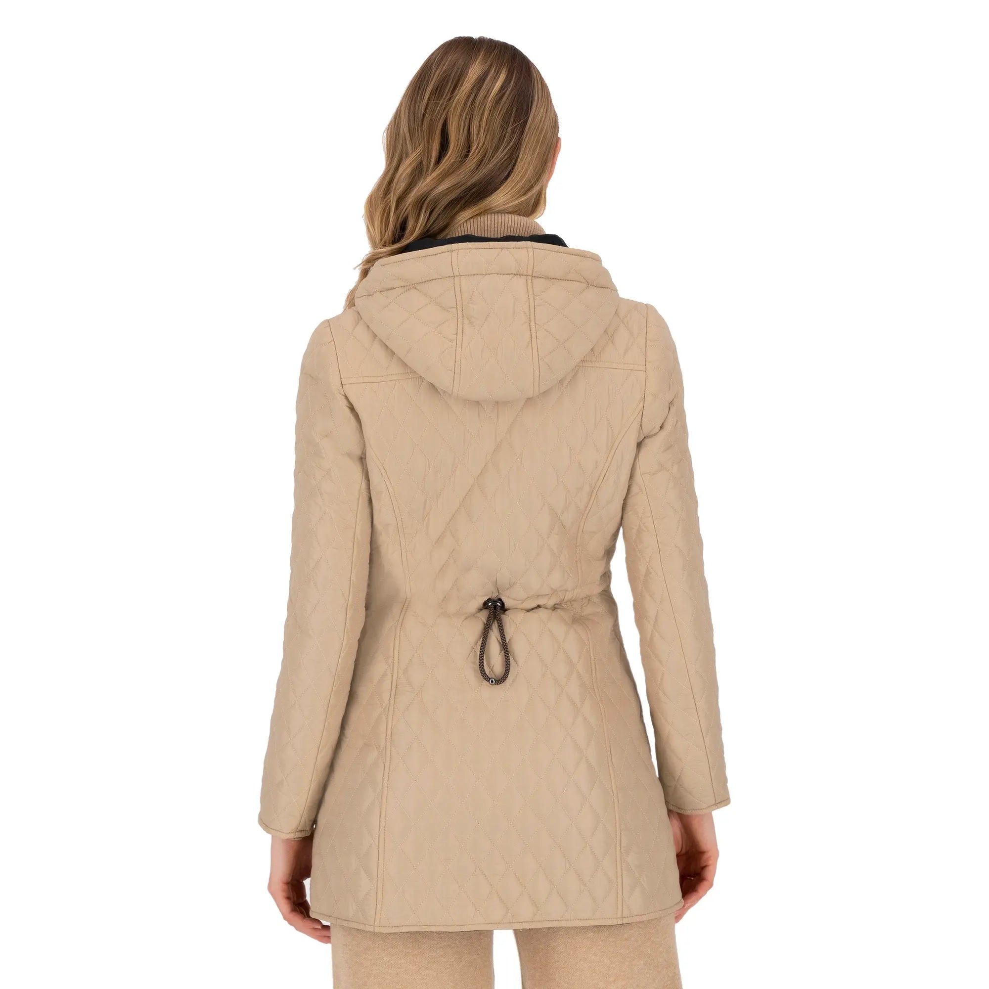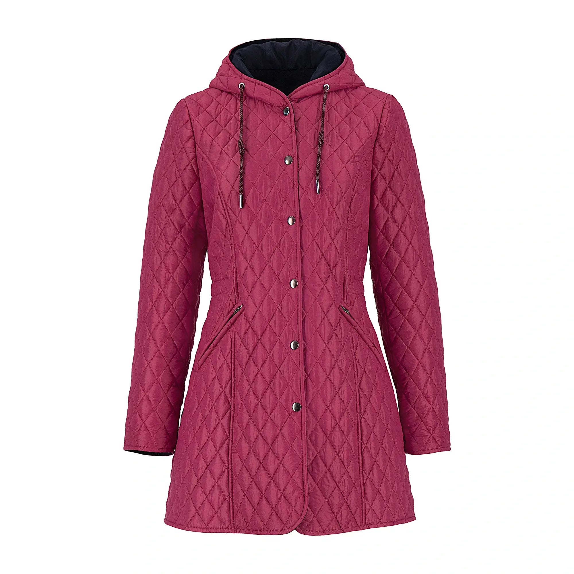 Chamarra doble vista con gorro integrado. Cierre frontal con botones metálicos y bolsillos laterales con cierre. Jareta trasera ajustable para acentuar la cintura. Versátil y práctica.