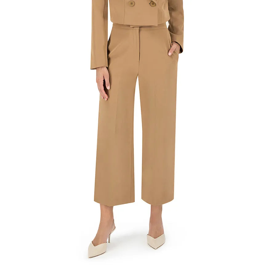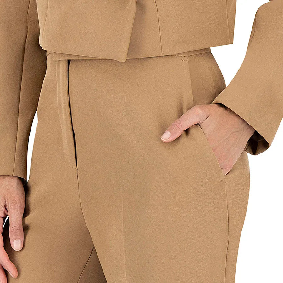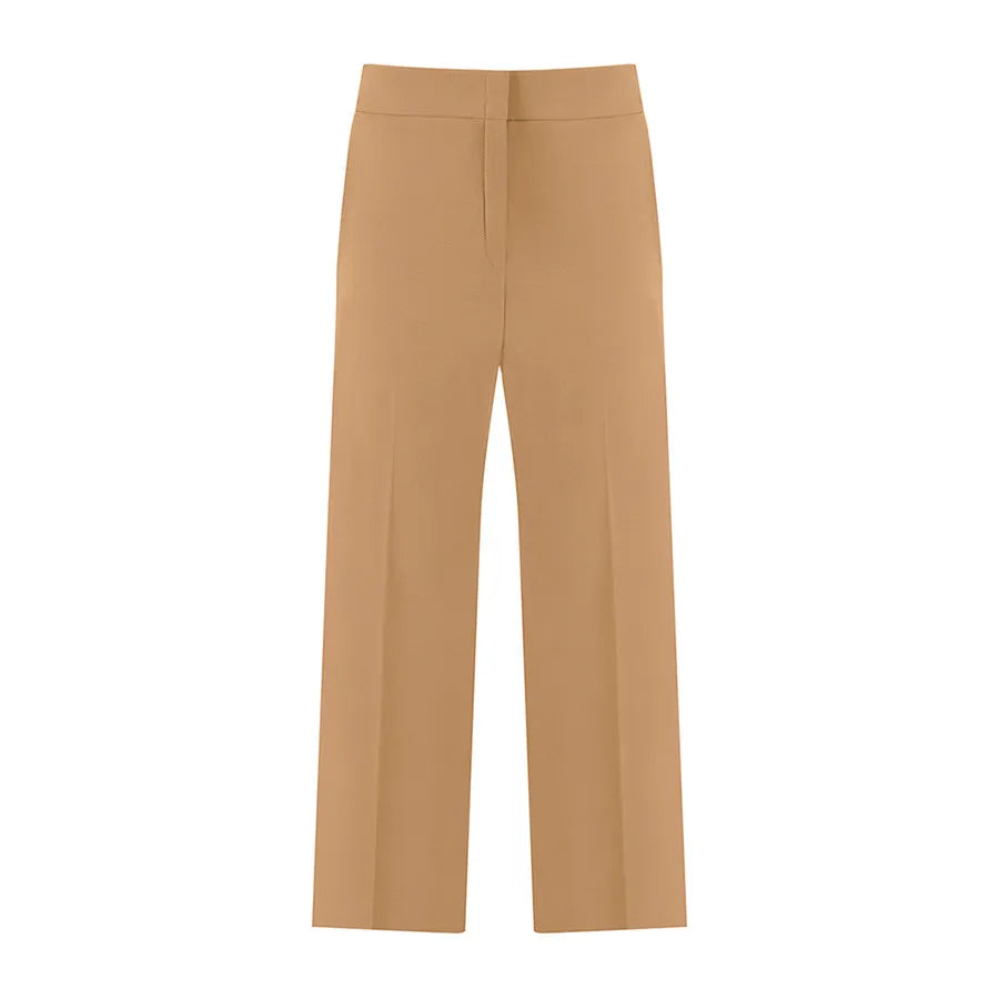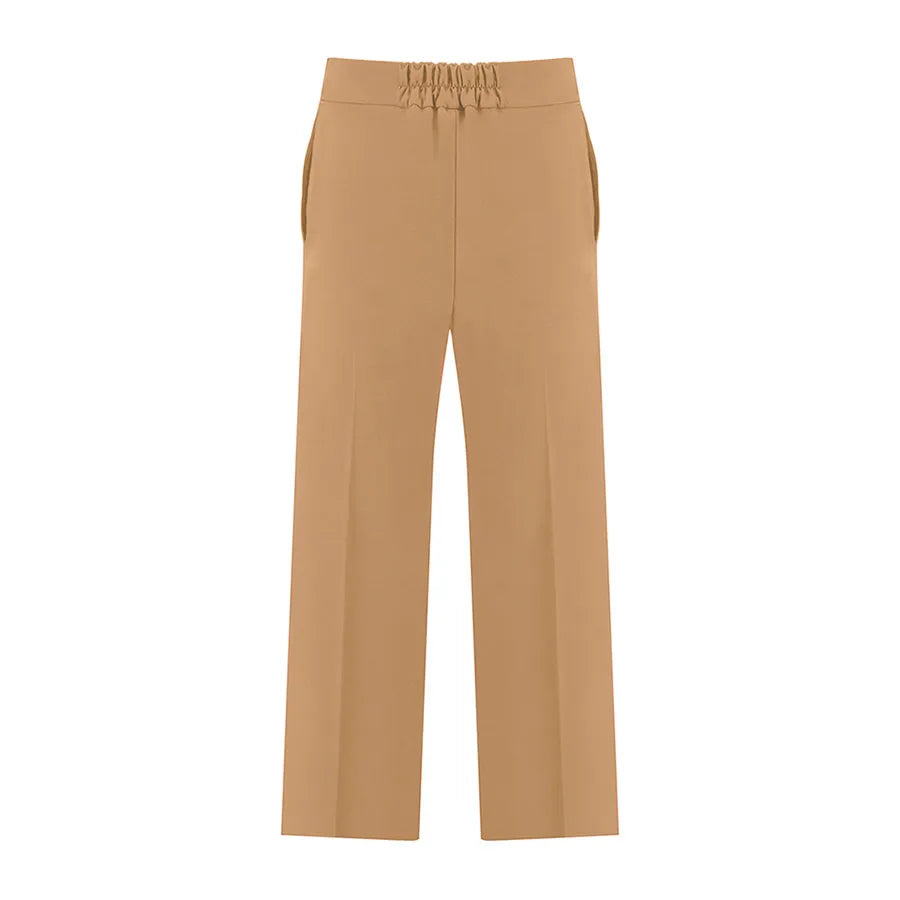 Este pantalón cuenta con una cintura alta que estiliza la figura, con un diseño minimalista y limpio que resalta la elegancia de su color camel. Los bolsillos laterales añaden un toque práctico y discreto, mientras que la tela fluida y de alta calidad permite una caída perfecta que asegura confort y estructura durante todo el día.