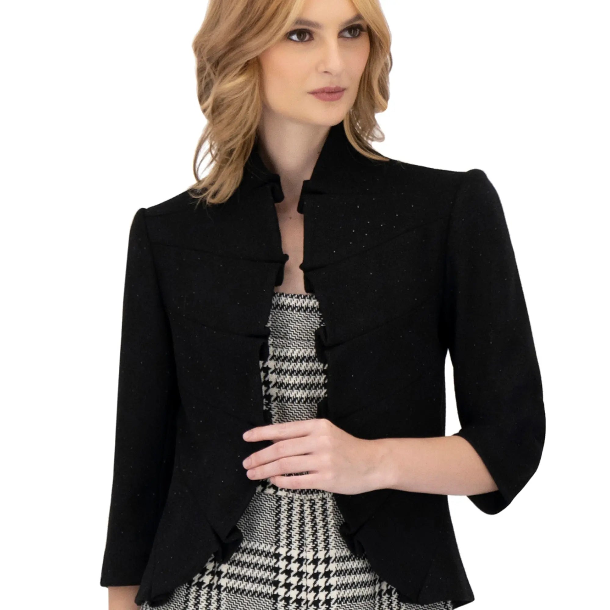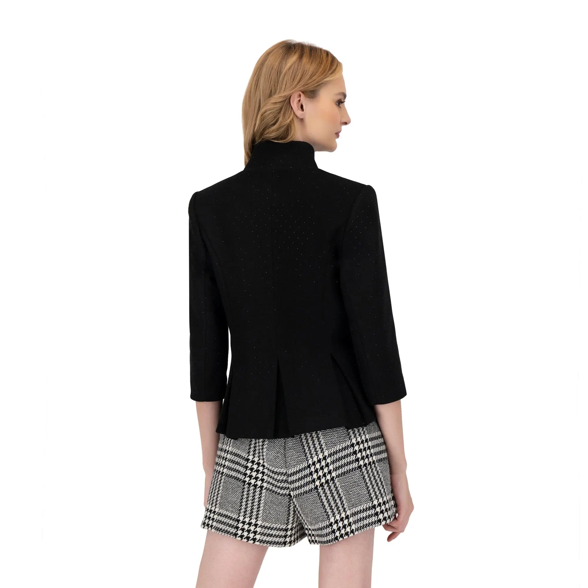 Este saco corto y con estructura definida realza tu figura con elegancia. Cuenta con cuello alto y manga tres cuartos, además de un diseño frontal de líneas limpias que afina la silueta. Su tejido firme asegura comodidad y mantiene la forma durante todo el día. Ideal para la oficina, cenas o cualquier evento, puedes combinarlo fácilmente con vestidos, blusas o tops para lograr un look sofisticado y sin complicaciones.