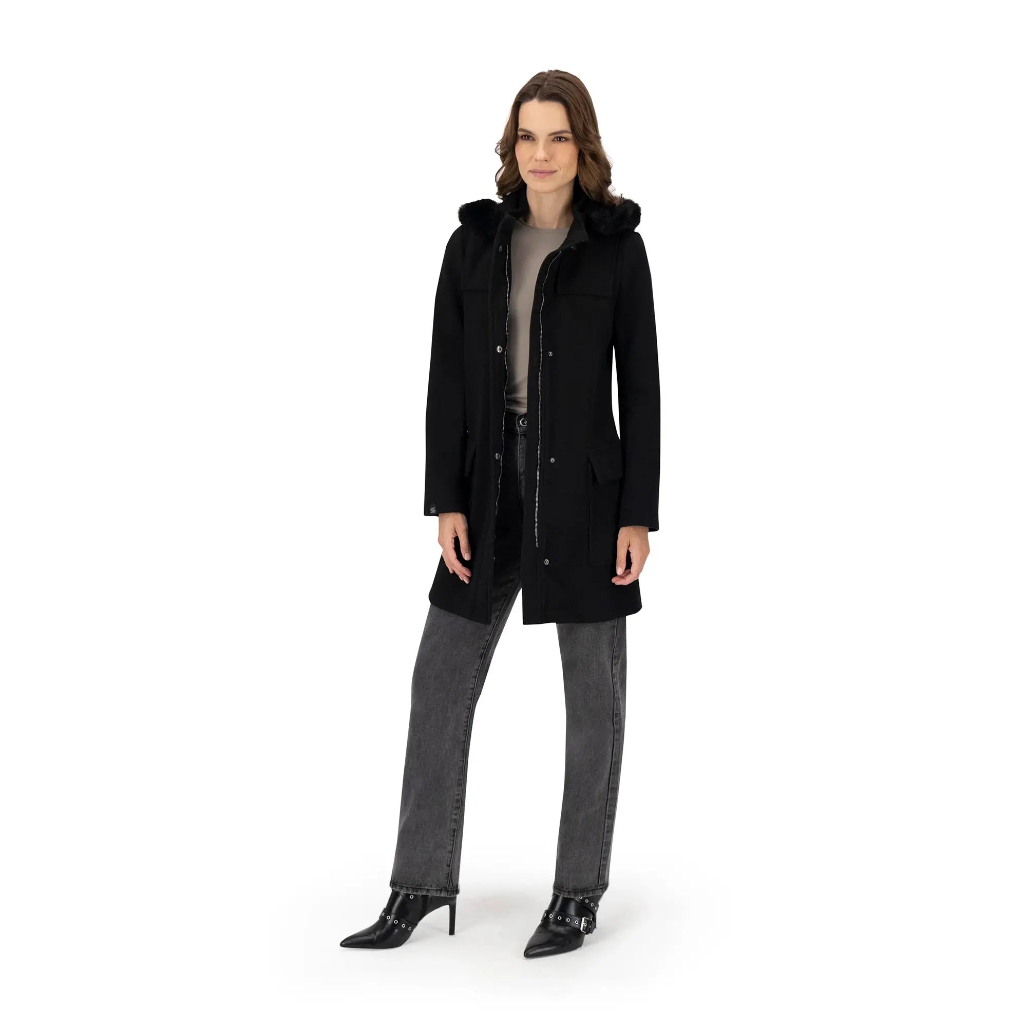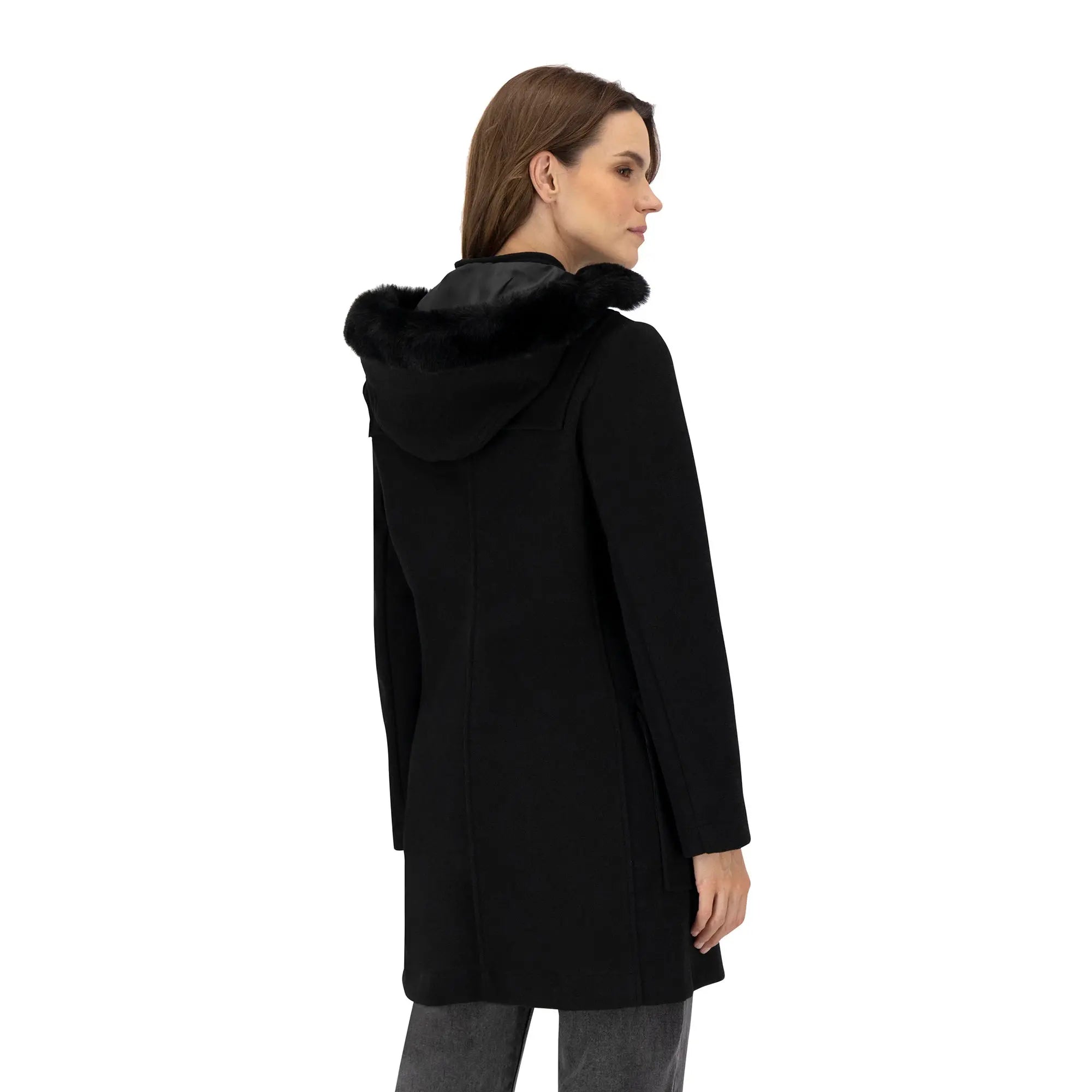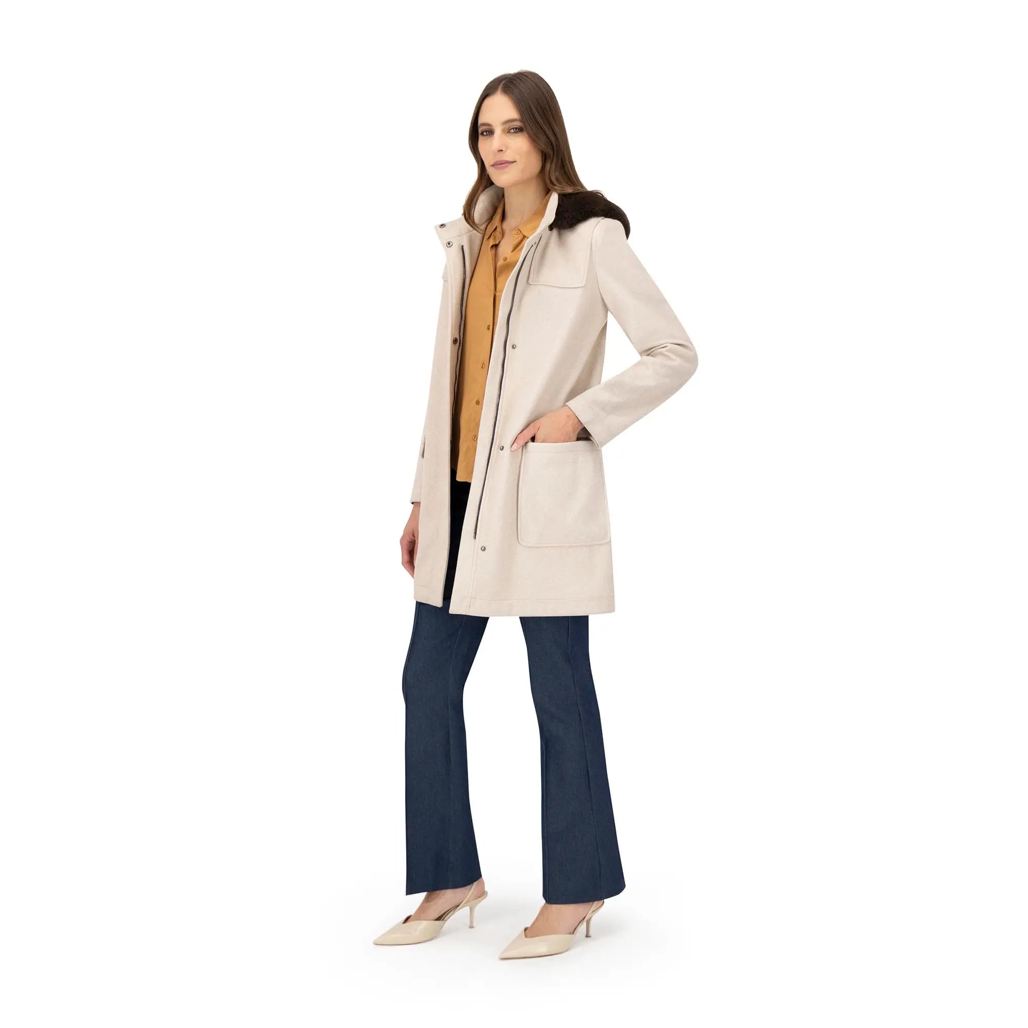 Abrigo para mujer largo que incluye una capucha revestida con peluche sintético para mayor calidez. Cuenta con varios bolsillos frontales y cierre de cremallera, combinando un estilo sofisticado y práctico. Una prenda ideal para mantener el confort en climas fríos, perfecta para el día a día, la oficina o eventos informales.