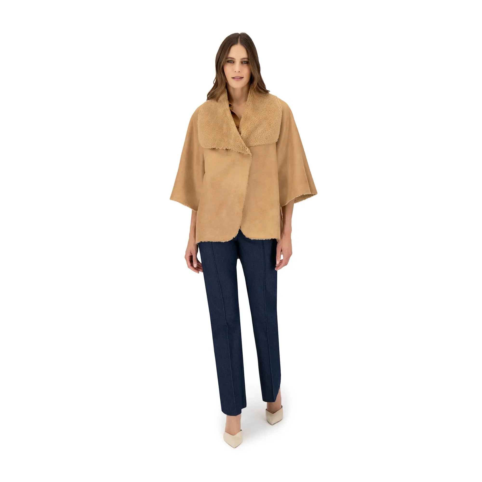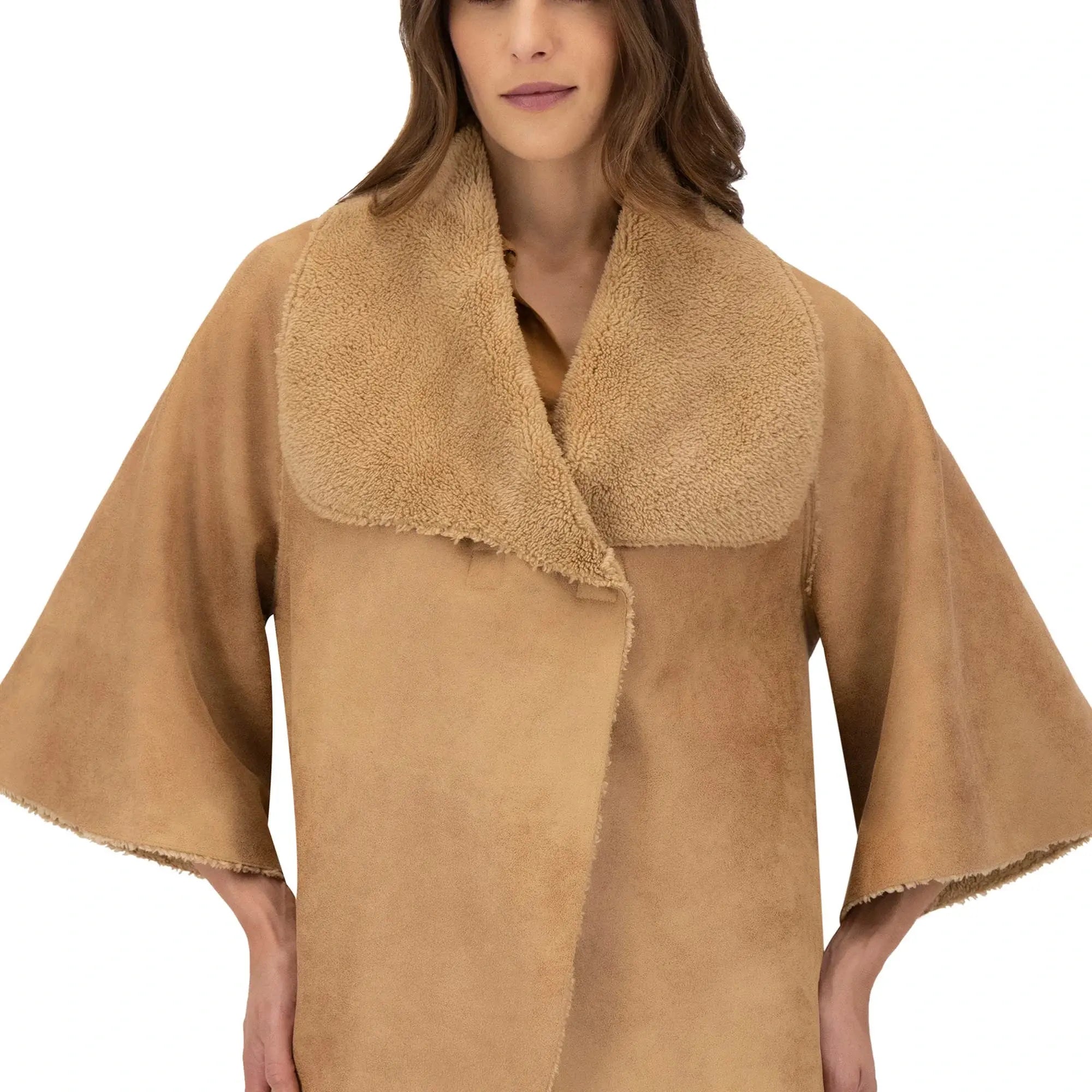 Esta capa presenta un diseño clásico y sofisticado, complementado con un cuello amplio estilo borrego que aporta calidez y confort. Su corte abierto y su caída ligera garantizan libertad de movimiento y comodidad, mientras que su textura suave mantiene un estilo elegante. Perfecta para combinar en outfit casuales o más formales durante los días frescos.