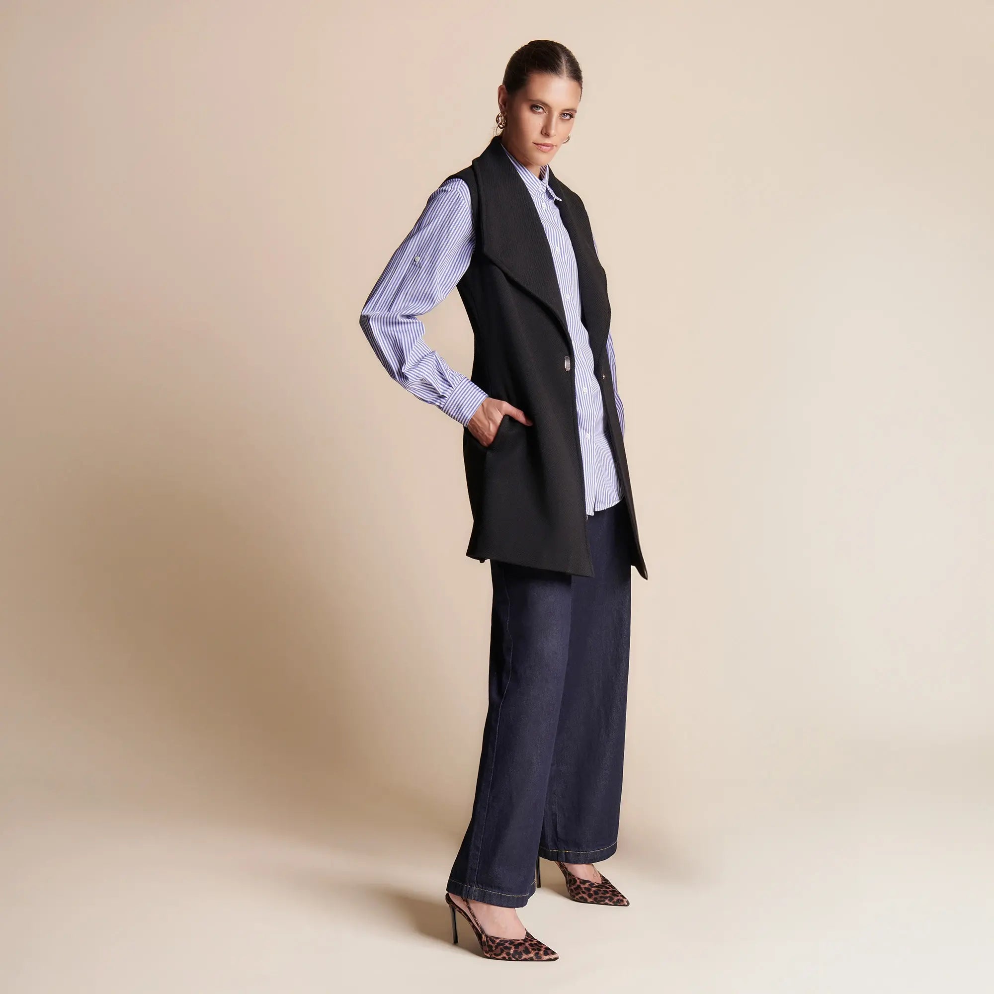 Este chaleco largo se presenta como una pieza esencial en la construcción de un guardarropa contemporáneo. Su silueta recta y la solapa amplia aportan una estructura impecable que eleva cualquier conjunto con naturalidad. Diseñado para integrarse sin esfuerzo en diferentes estilos, combina la sobriedad de una prenda atemporal con la versatilidad que exige la vida moderna. Un básico de carácter único que transforma lo cotidiano en sofisticado.