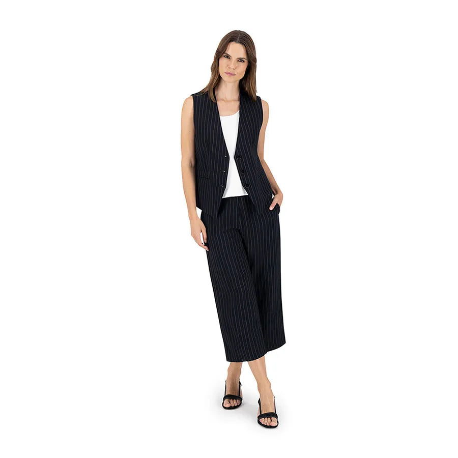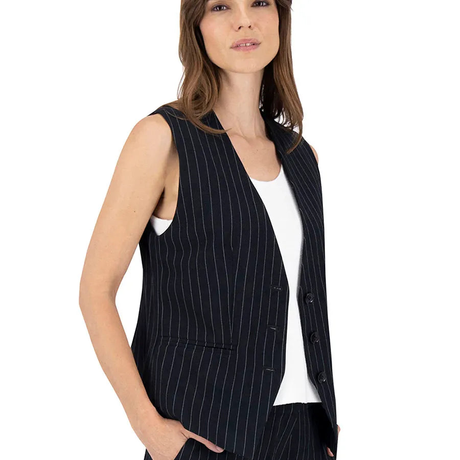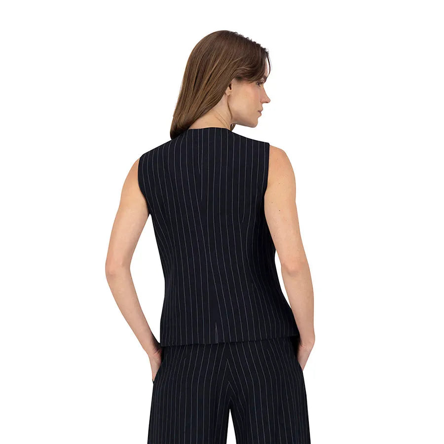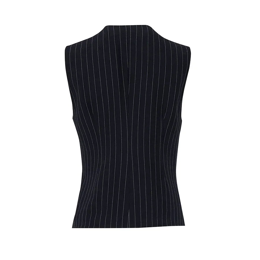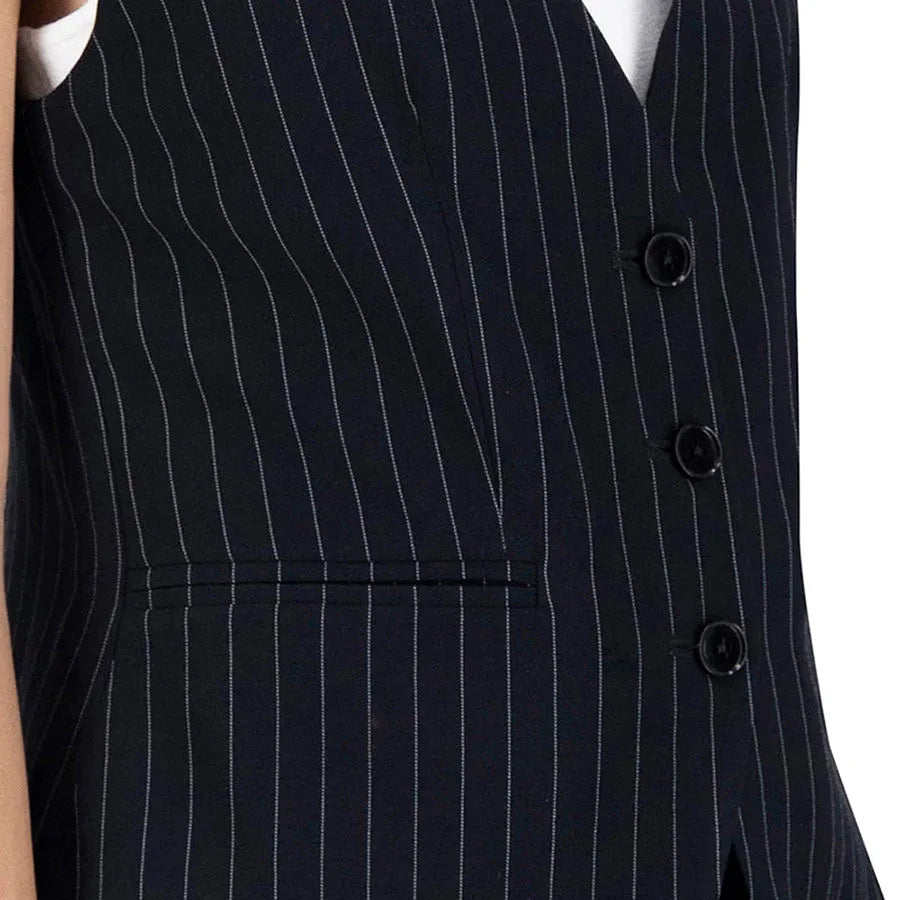 Este chaleco presenta un corte entallado que realza la figura, escote en pico y botonadura frontal de tres piezas. Las finas líneas verticales estilizan visualmente el torso y aportan un aire refinado. Incorpora bolsillos decorativos con solapa que refuerzan su diseño de inspiración formal.
