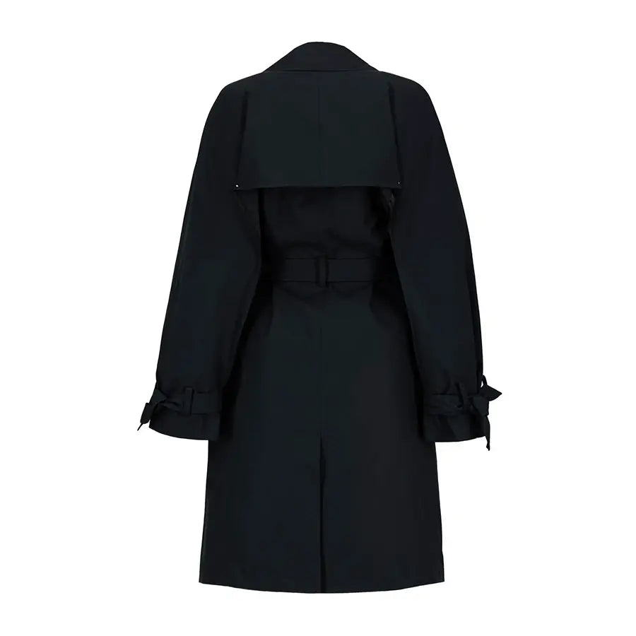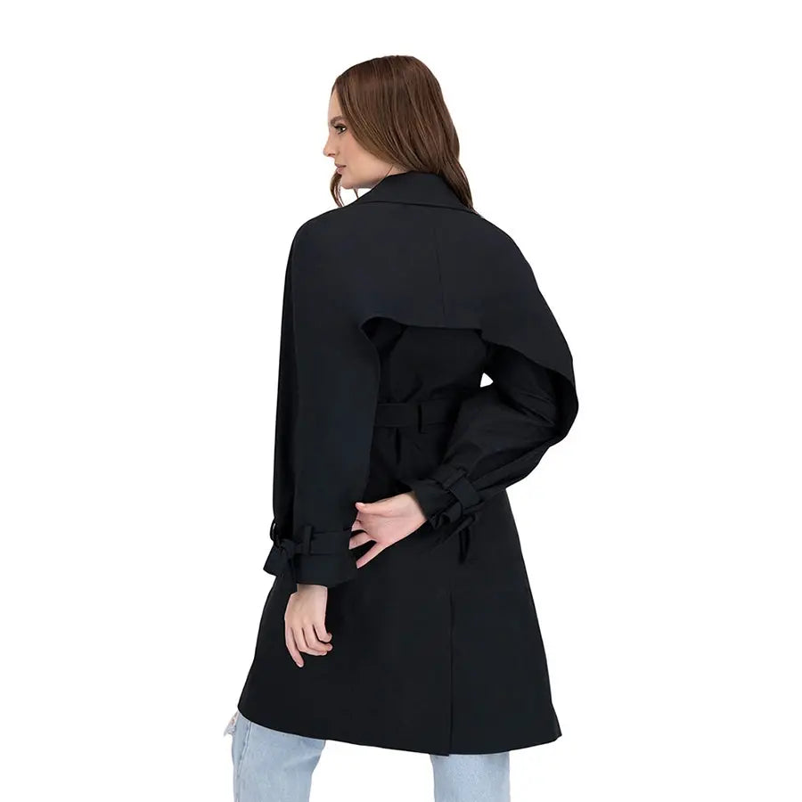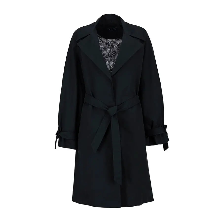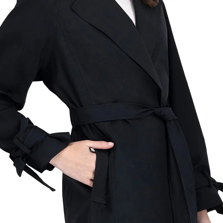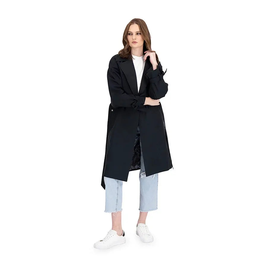 Gabardina con cuello en V y solapa tipo muesca. Tiene una solapa que se extiende hasta la manga. Cuenta con cinturón tipo lazo en la cintura y puños con cinturones lazados.