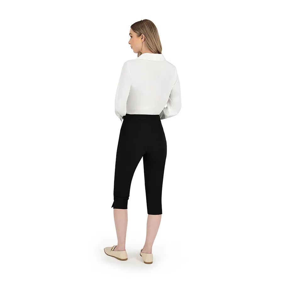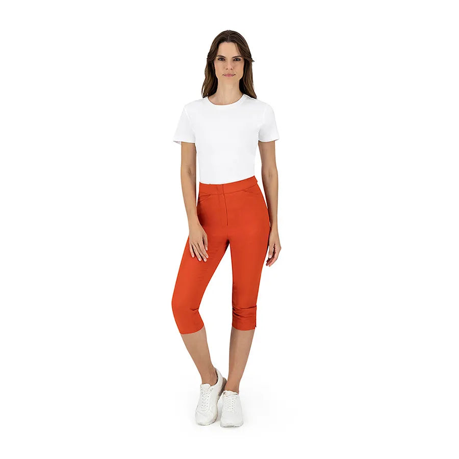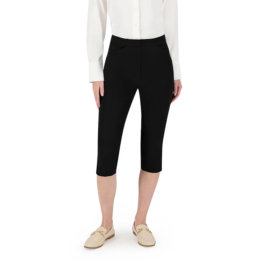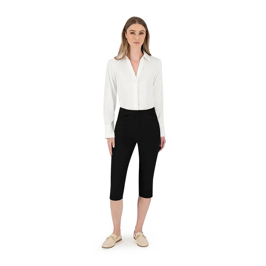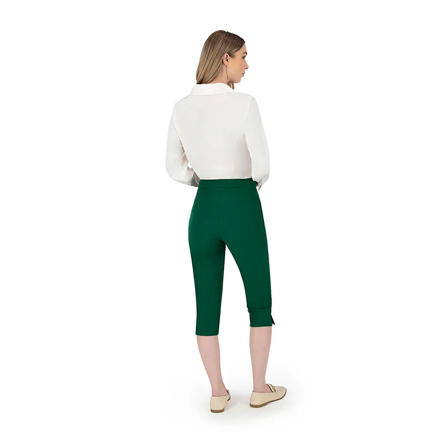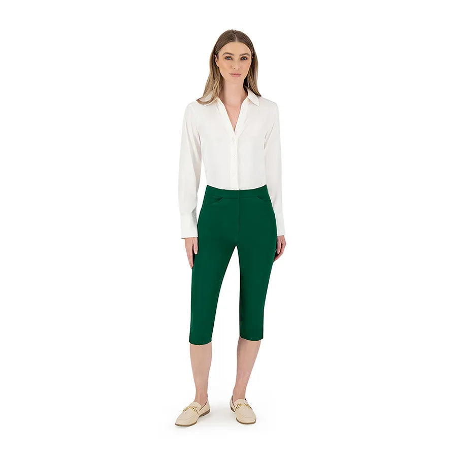 Este pantalón capri entallado redefine la versatilidad con una silueta ajustada que estiliza la figura y un largo ideal para climas cálidos o estilismos intermedios.