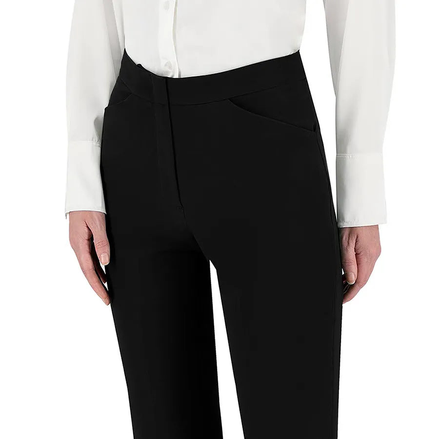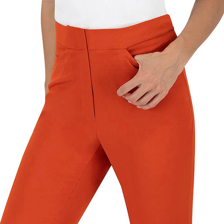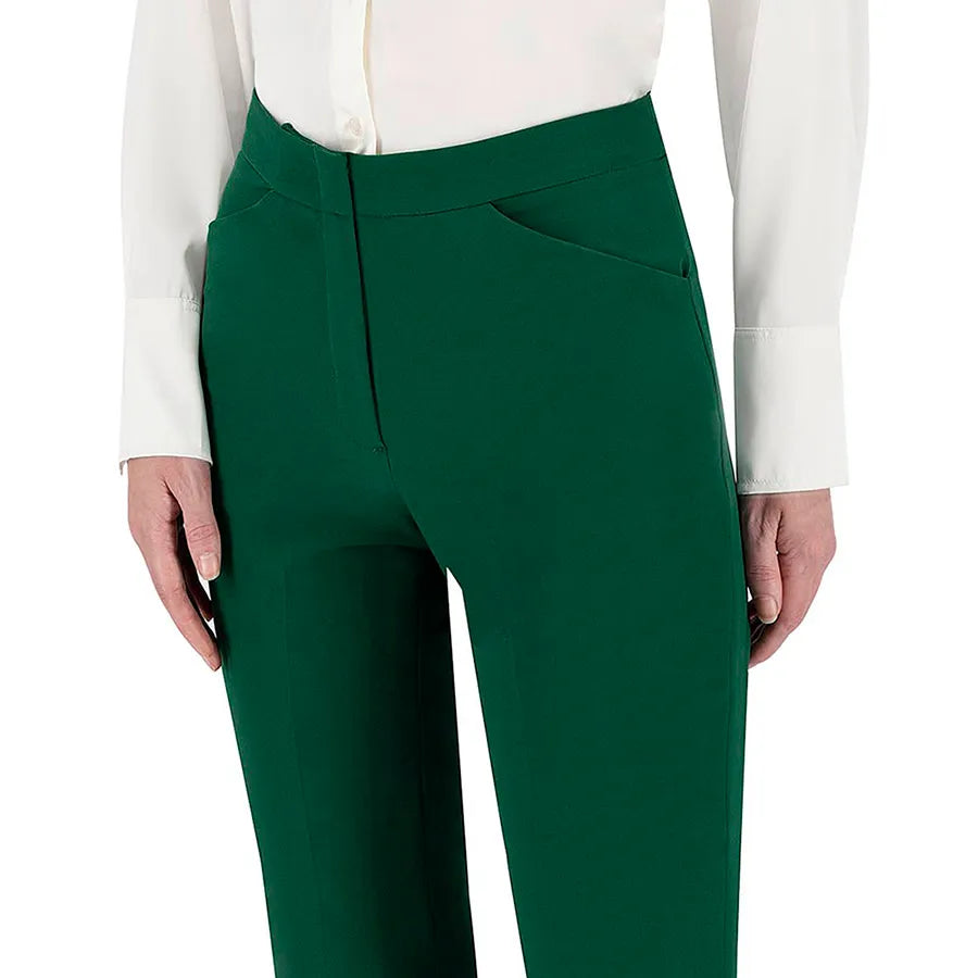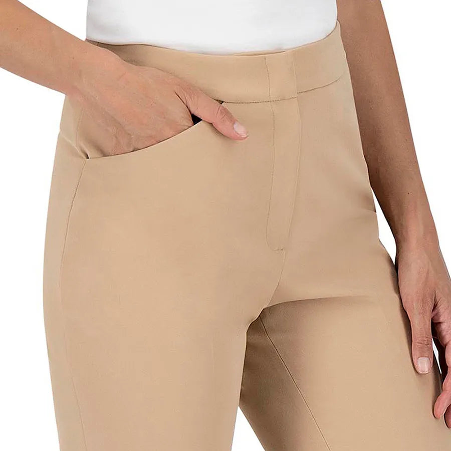 El diseño cuenta con una pretina lisa de construcción limpia, cierre frontal oculto y bolsillos laterales diagonales que suman funcionalidad sin alterar la estética pulida de la prenda. Su tejido elástico de textura suave garantiza una movilidad cómoda sin sacrificar estructura.
