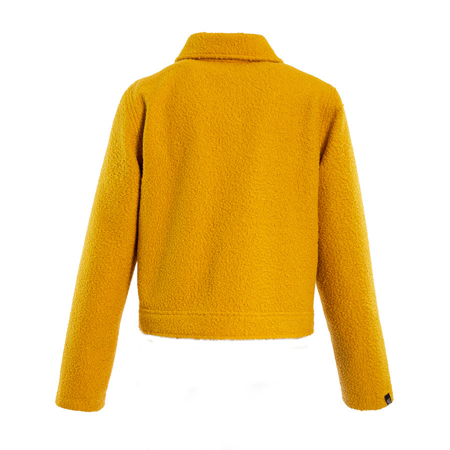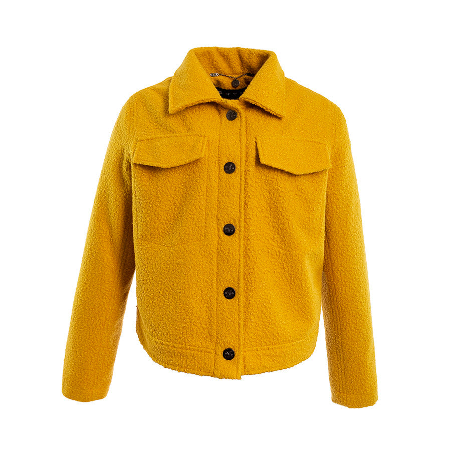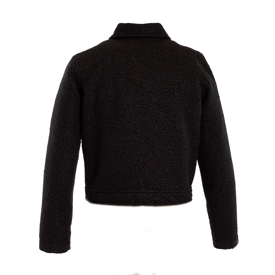 Este abrigo corto es perfecto para añadir un toque de sofisticación a tus outfits. La tela boucle ofrece una textura única y acogedora.