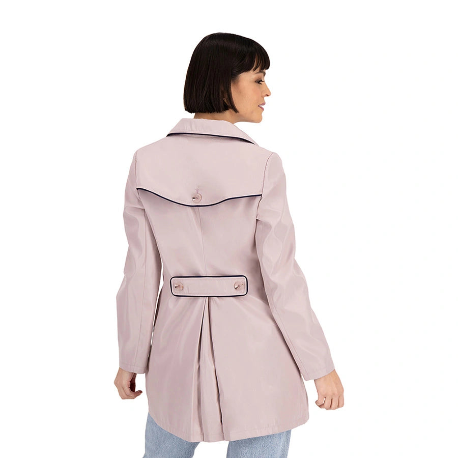 Gabardina con forro estampado y mangas con diseño en corte A. Tiene botones frontales y solapa protectora contra lluvia en la espalda. Cuenta con detalle de cinta decorativa en la parte posterior.