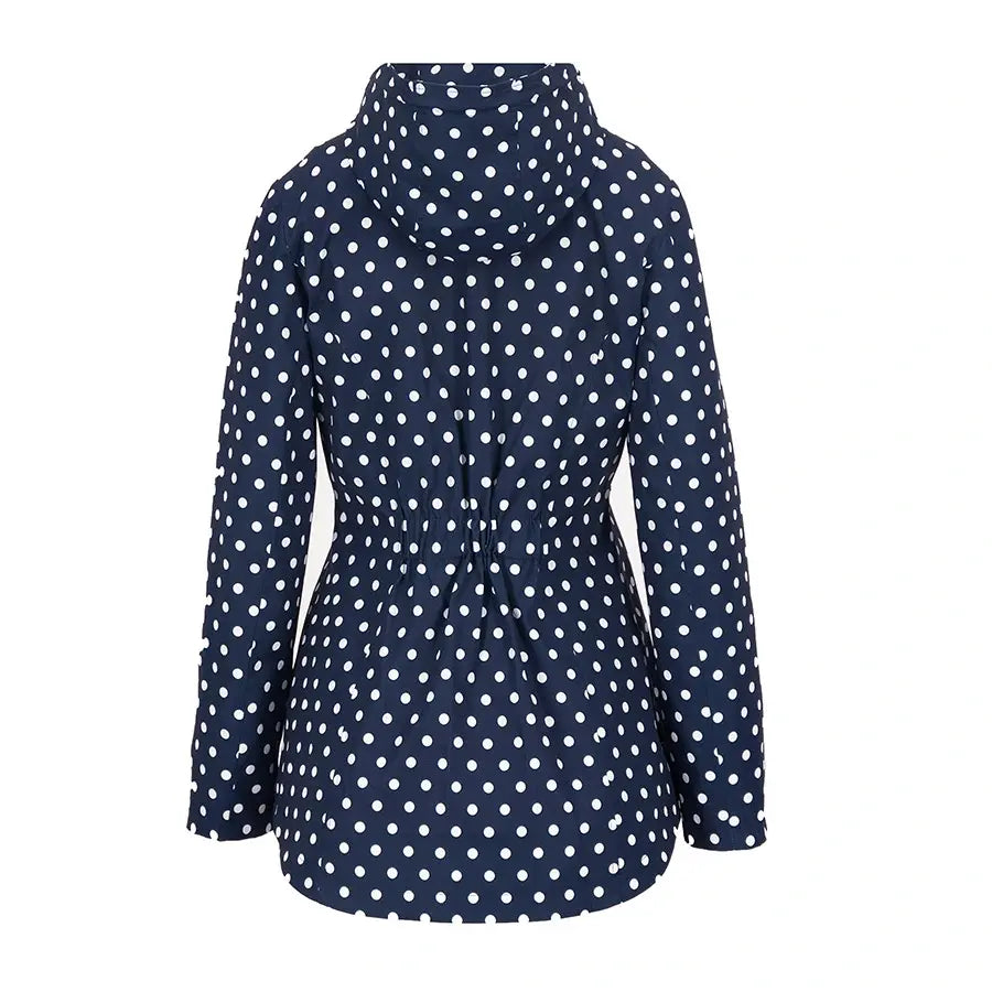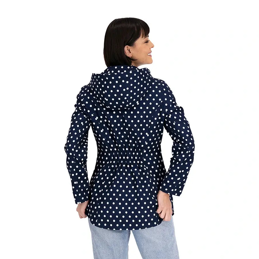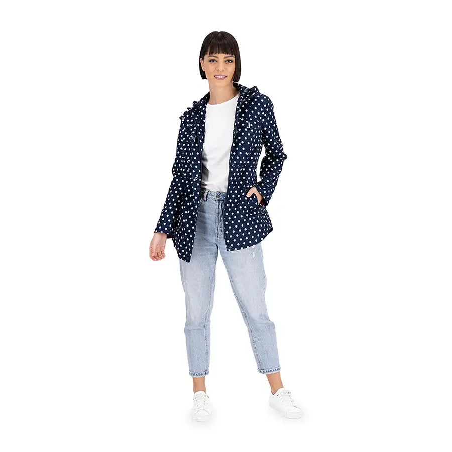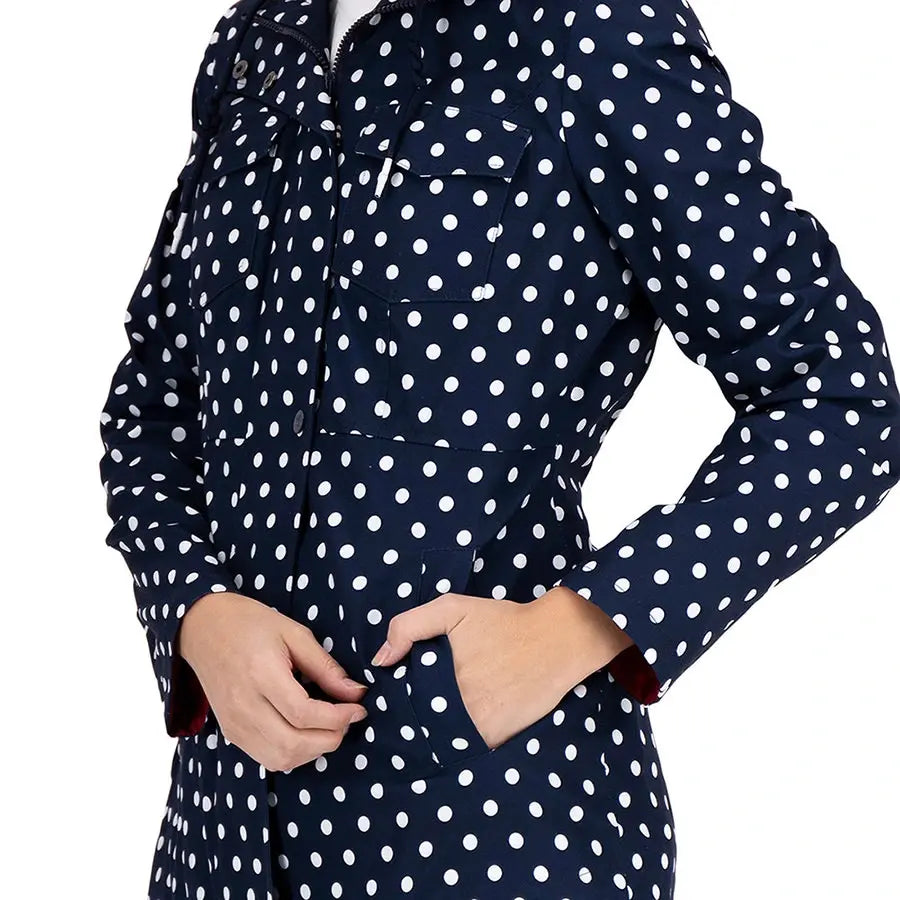 Gabardina con estampado de lunares y forro liso en contraste rojo. Tiene gorro removible con cordones ajustables y bolsillos tipo sobre en el pecho. Cuenta con un panel elástico en la espalda para mayor comodidad.