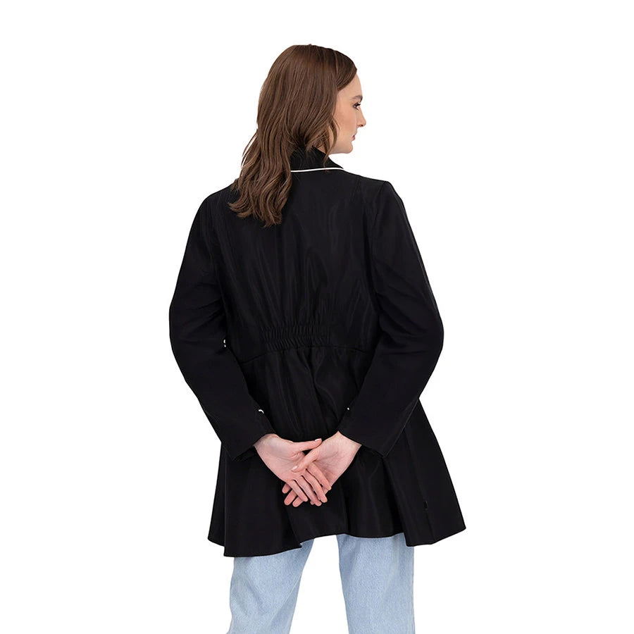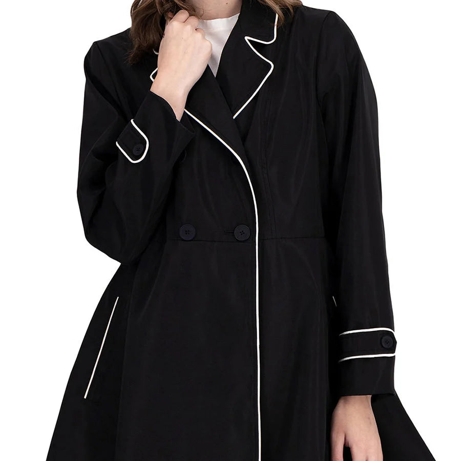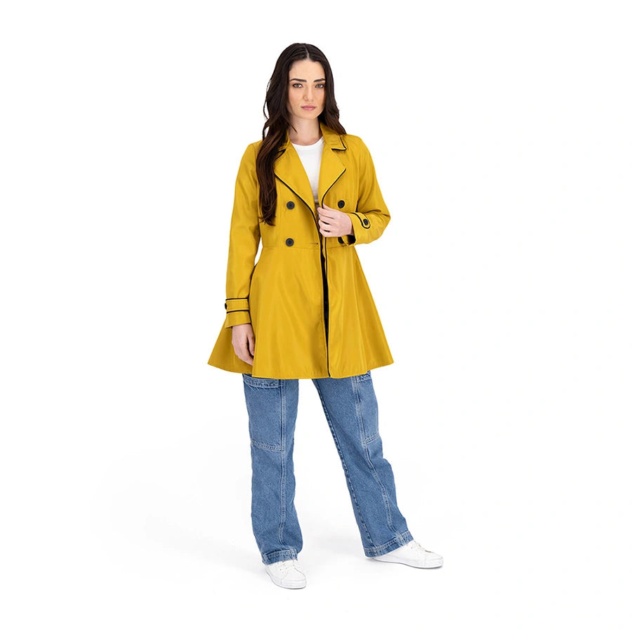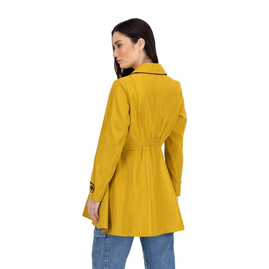 Gabardina con elegante cuello en V y solapa tipo muesca. Incorpora forro estampado y panel elástico en la espalda para mayor comodidad. Cuenta con puños ajustables con correa y botonadura doble. Caracterizada por su corte en falda tipo A.