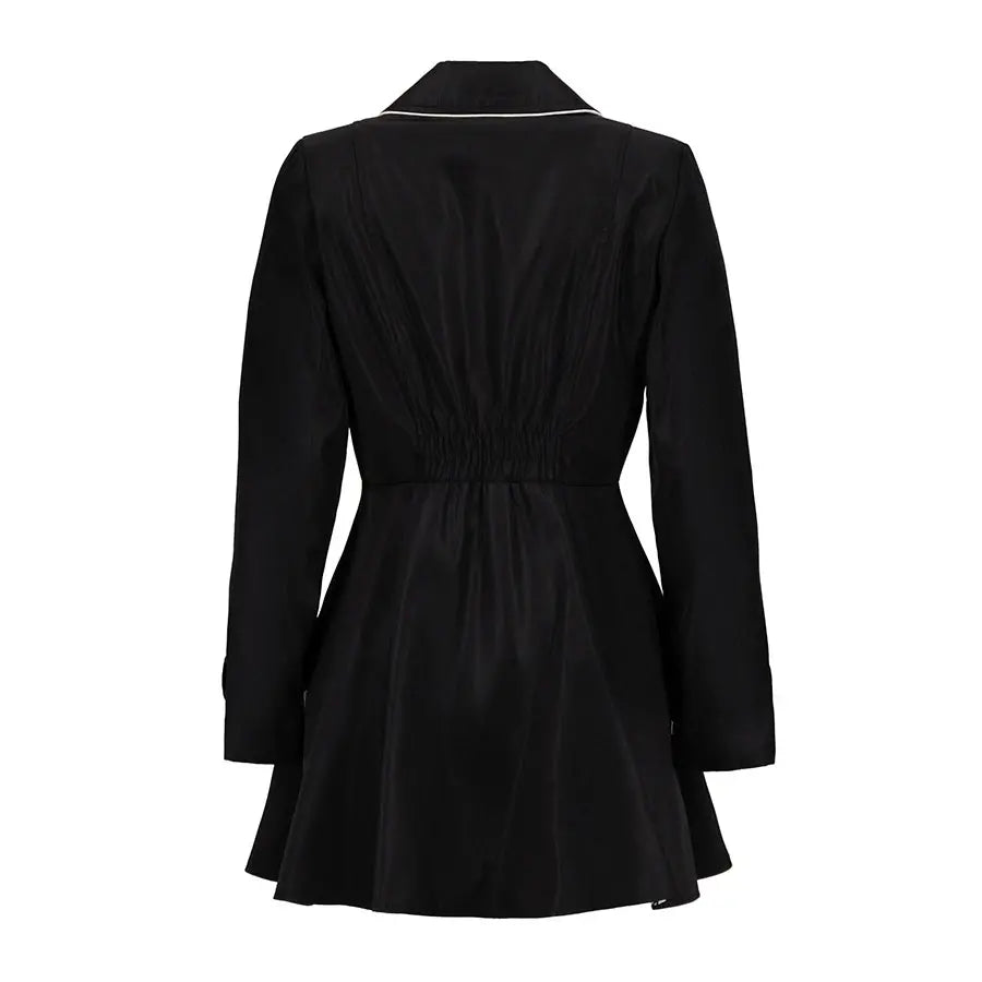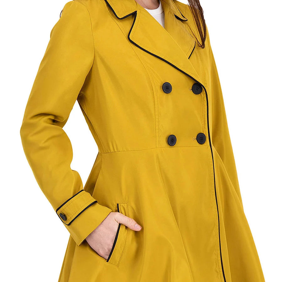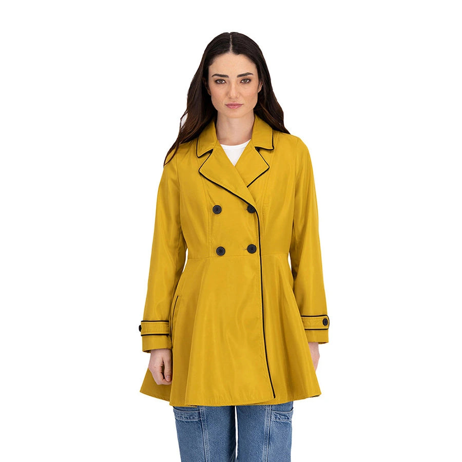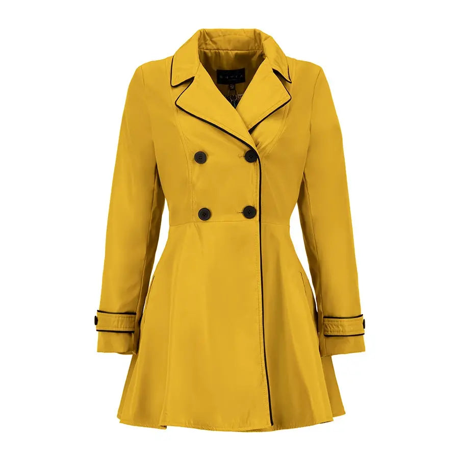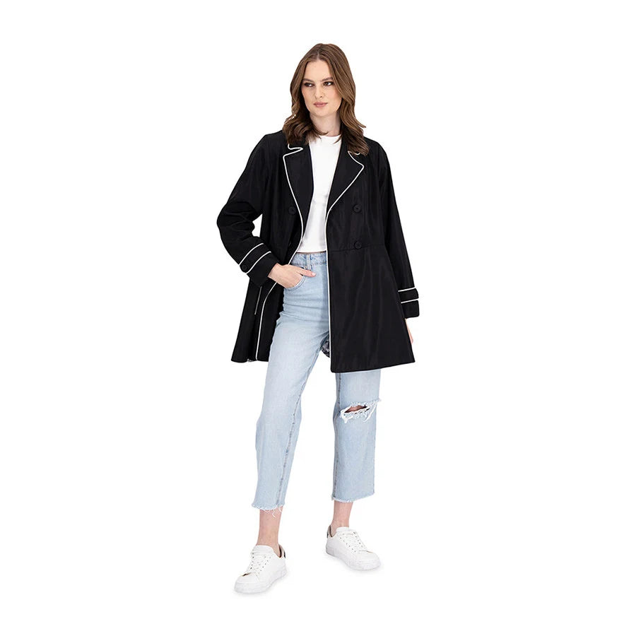 Gabardina con elegante cuello en V y solapa tipo muesca. Incorpora forro estampado y panel elástico en la espalda para mayor comodidad. Cuenta con puños ajustables con correa y botonadura doble. Caracterizada por su corte en falda tipo A.