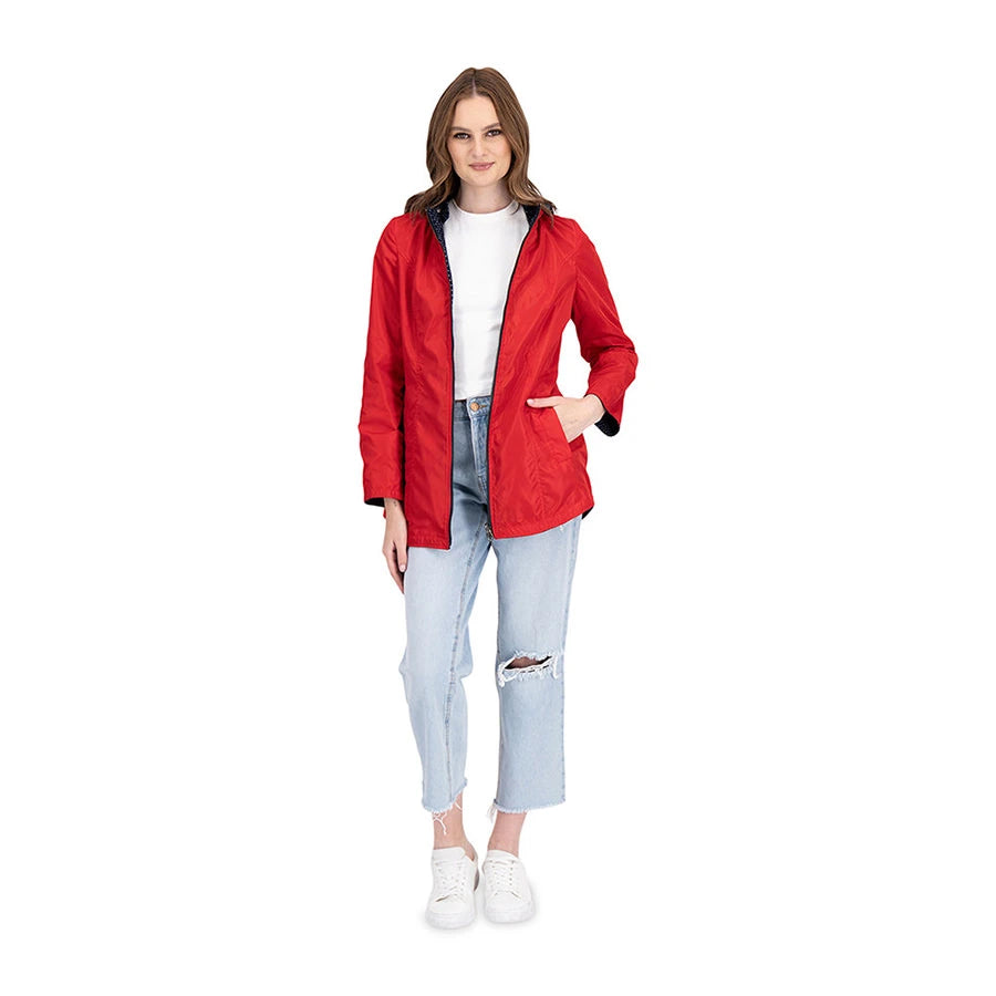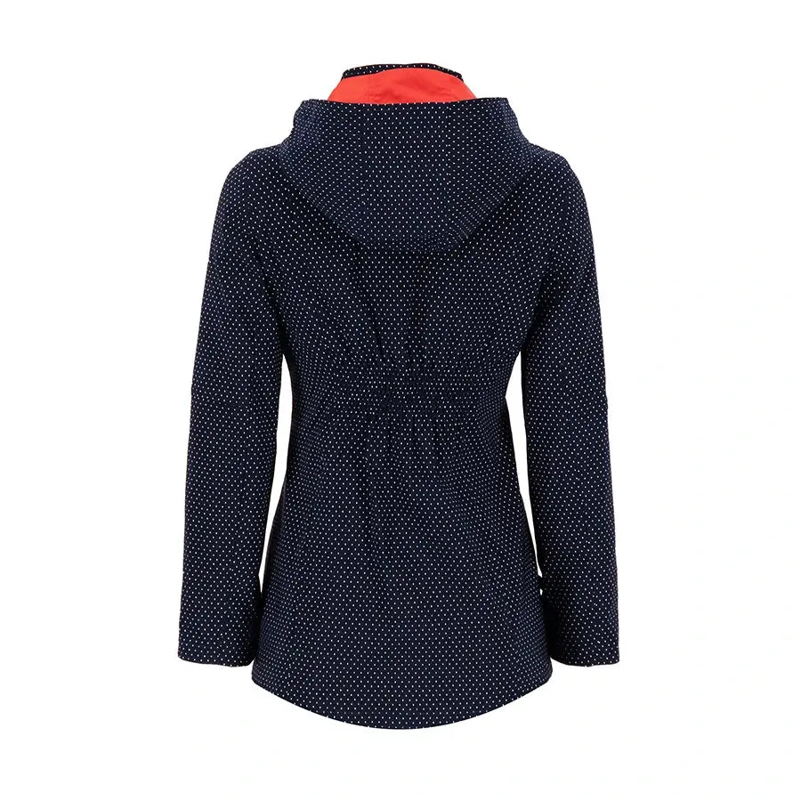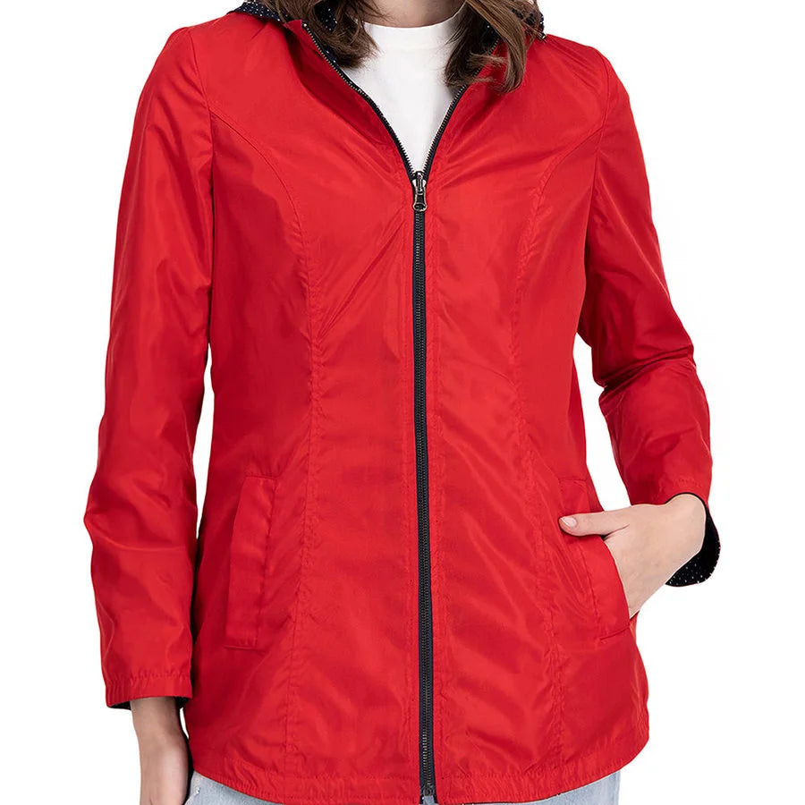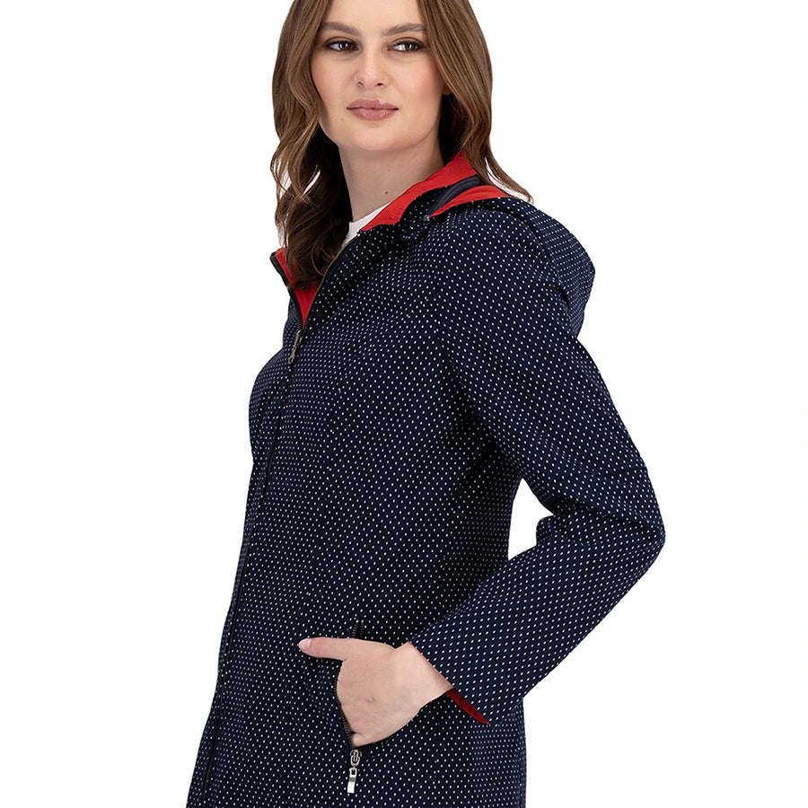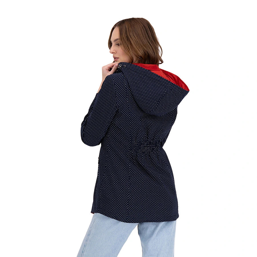 Gabardina reversible con estampado de lunares pequeños. Tiene gorro desmontable con cordón ajustable. Cuenta con bolsillos diagonales en un lado y bolsillos con cierre en el otro.