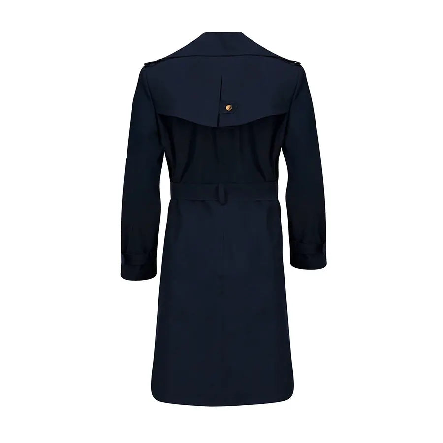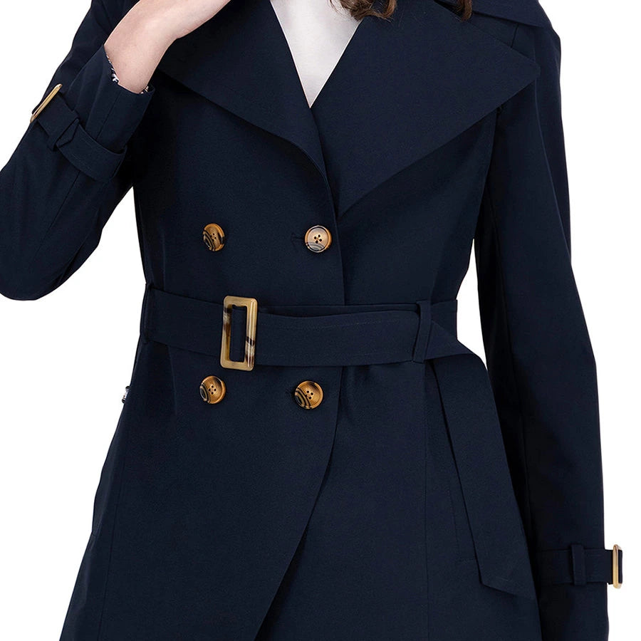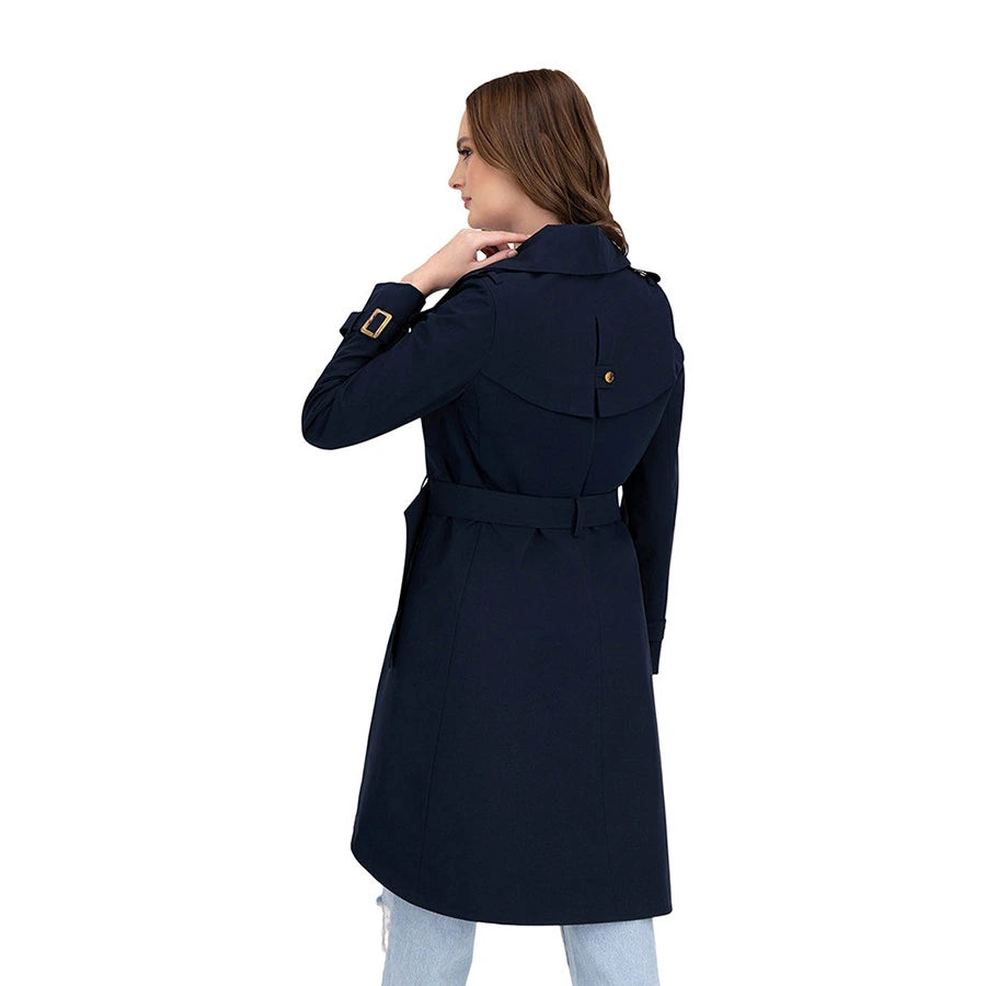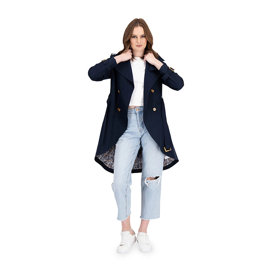 Gabardina con corte asimétrico y forro estampado. Tiene una solapa cortavientos lateral y charreteras en los hombros. Cuenta con cuello en V, solapa tipo muesca y doble botonadura. Presenta puños ajustables con correa y cinturón deslizable.