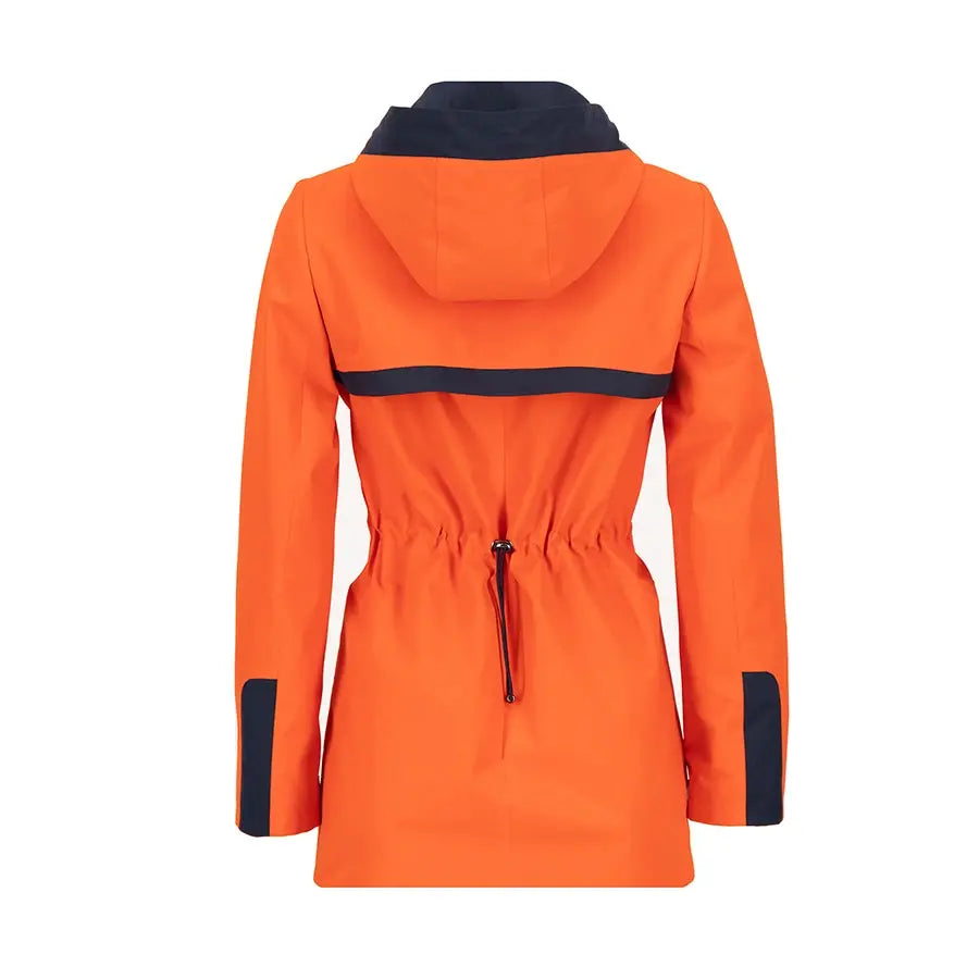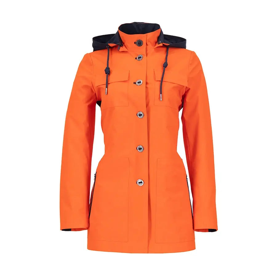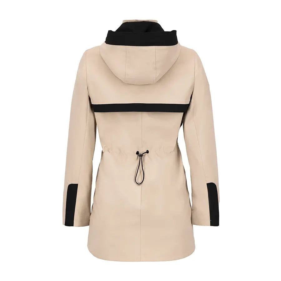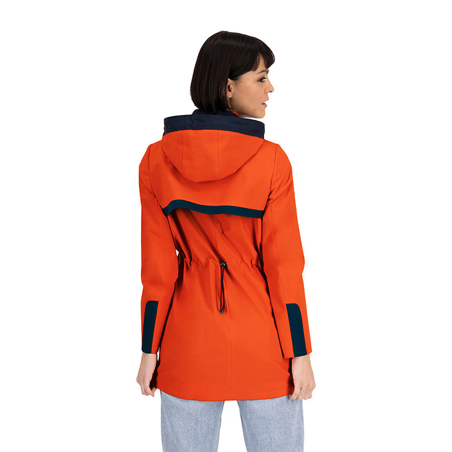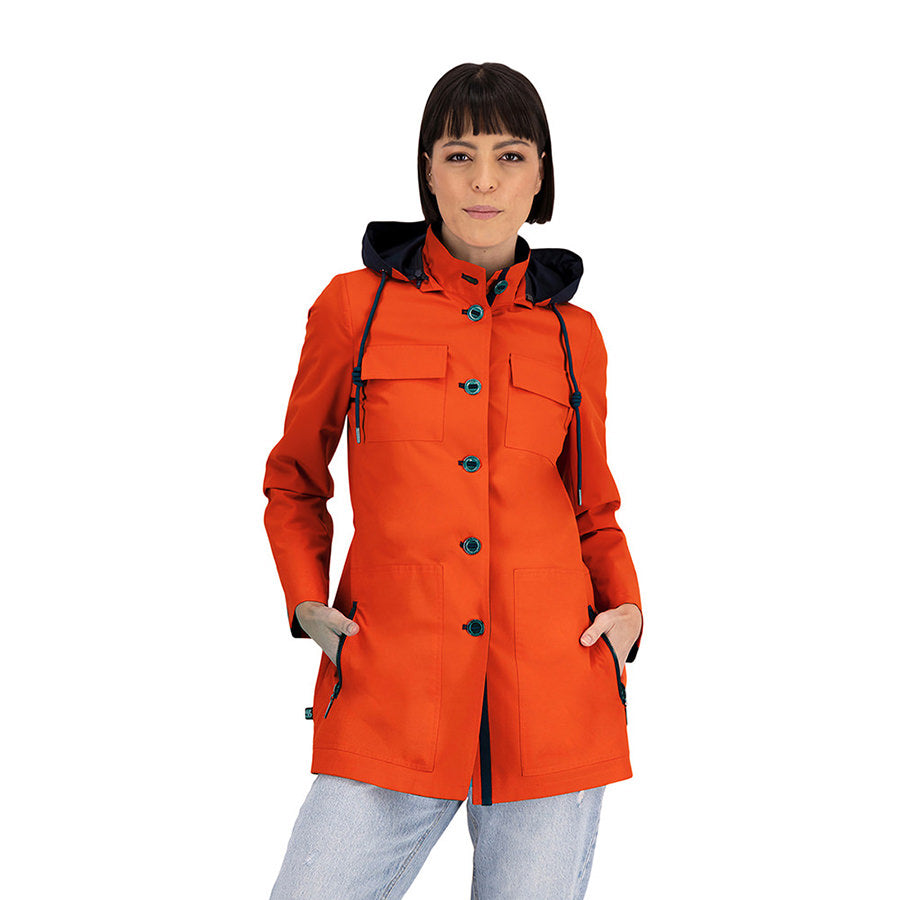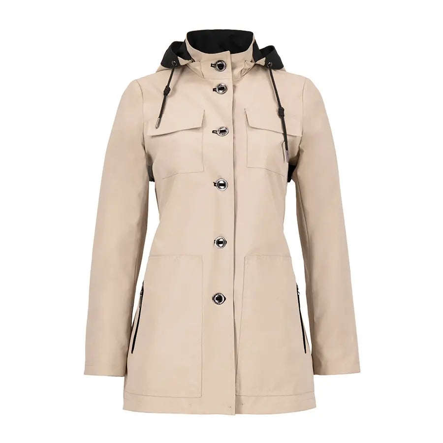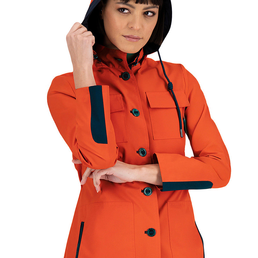 Gabardina con solapa en pecho y espalda, complementada con botón posterior. Destaca su cuello en V con solapa tipo muesca y cinturón ajustable tipo slip. Diseñada con doble botonadura y charreteras en los hombros. Su interior presenta un forro estampado.
