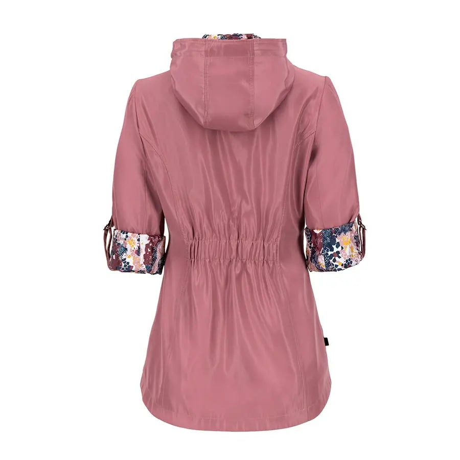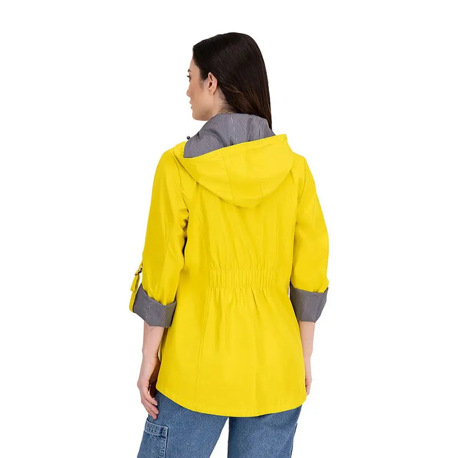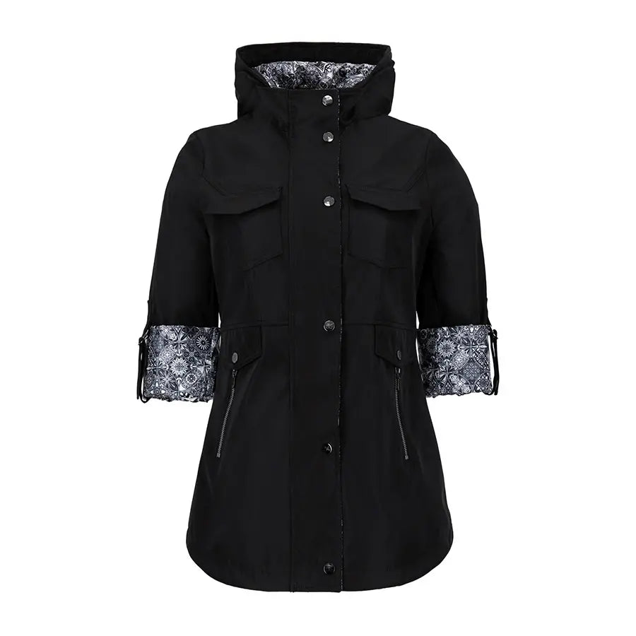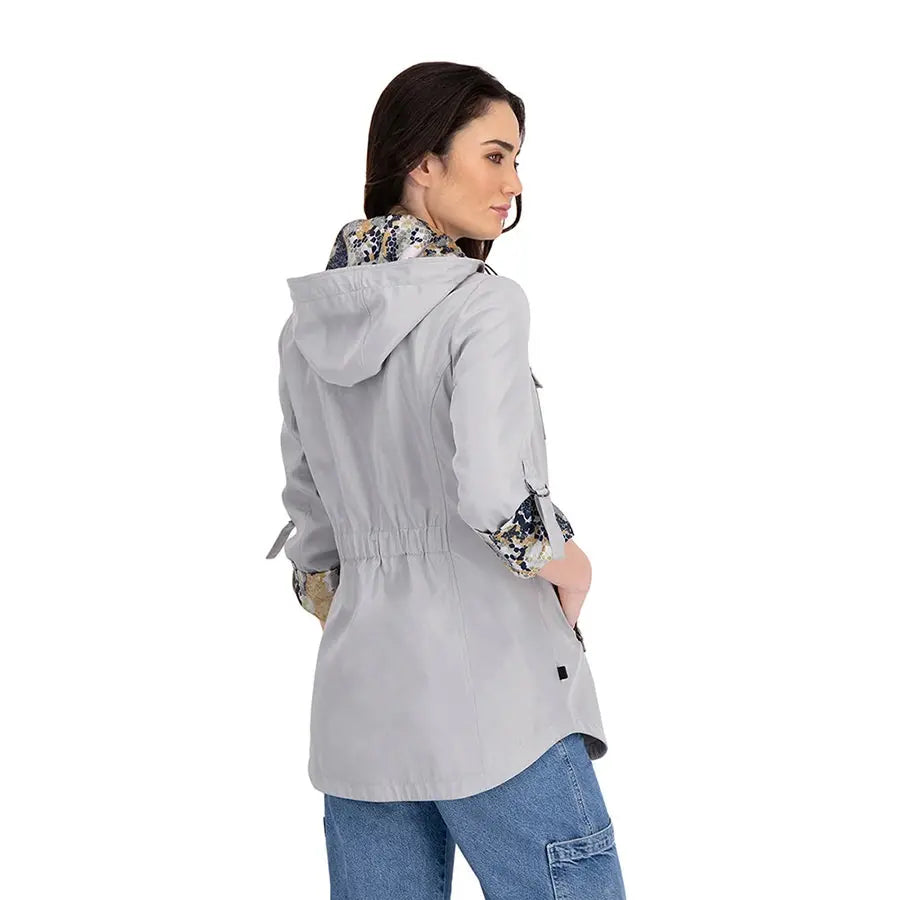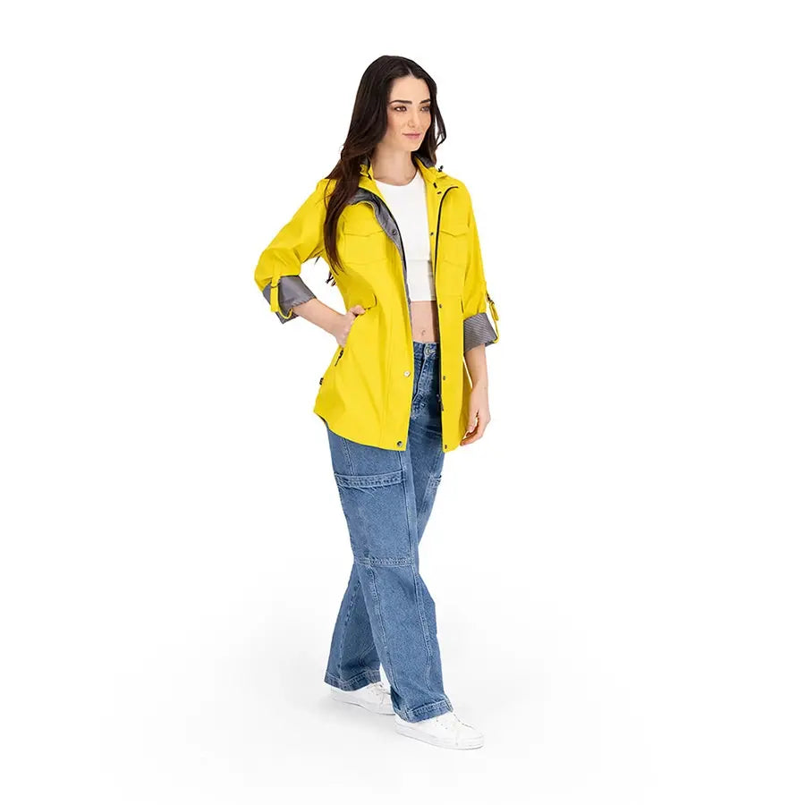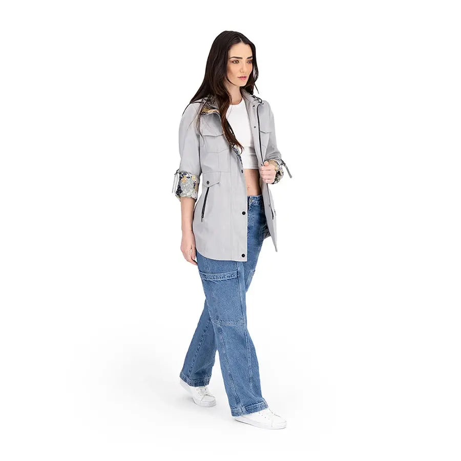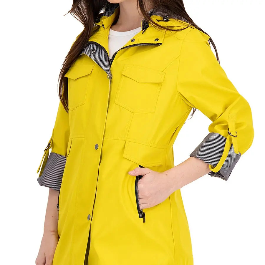 Gabardina con gorro desmontable y jaretas ajustables en la capucha. Tiene forro estilo marinero y mangas con sistema de doblez ajustable. Cuenta con cierre y botones al frente, bolsillos inferiores con solapa estilo sobre y cremallera, bolsillo tipo sobre en el pecho y panel elástico en la espalda para mayor comodidad.