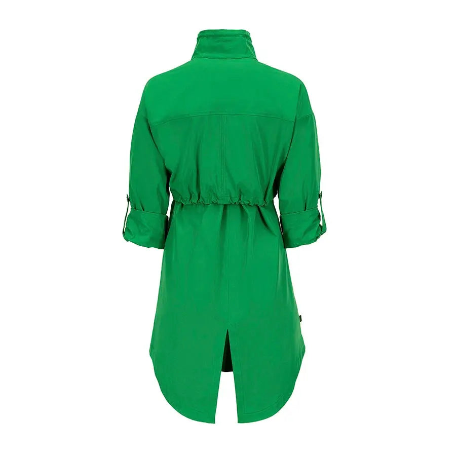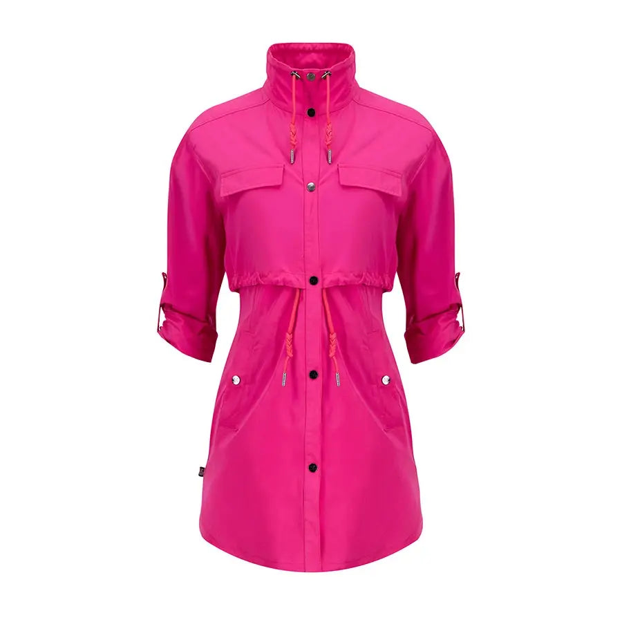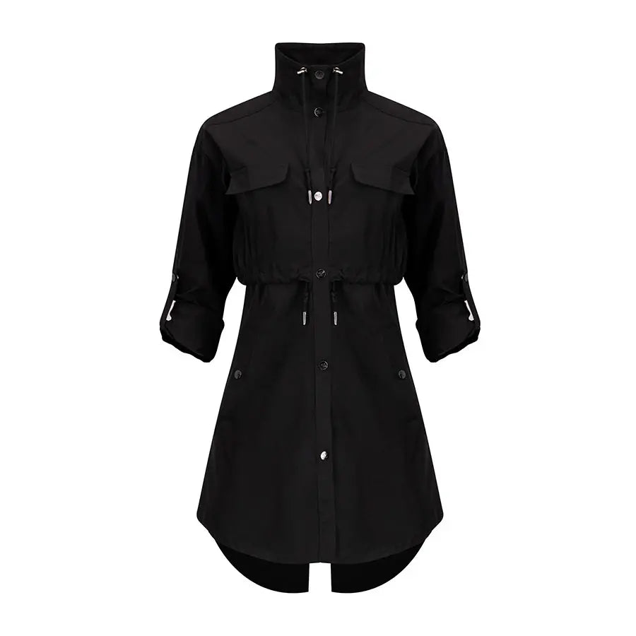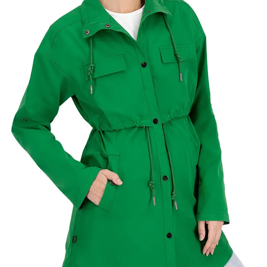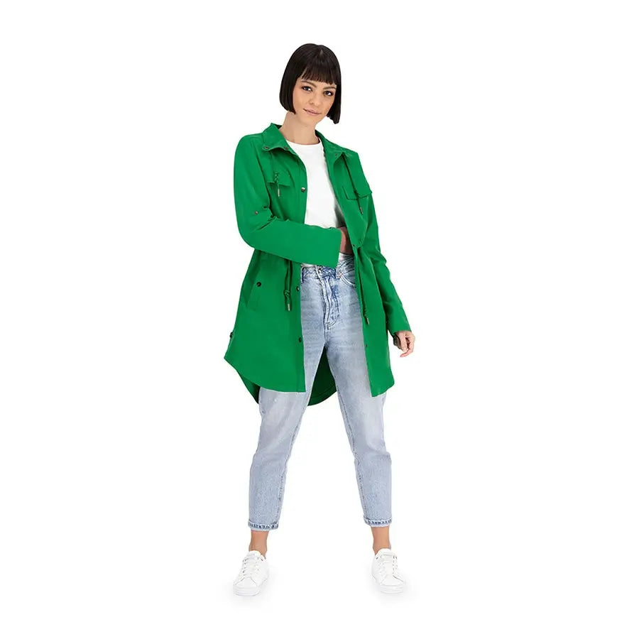 Gabardina con paneles divididos, presenta mangas con doblez ajustable y botones frontales. Cuenta con jaretas ajustables en cuello y cintura, bolsas con botón y forro de malla.