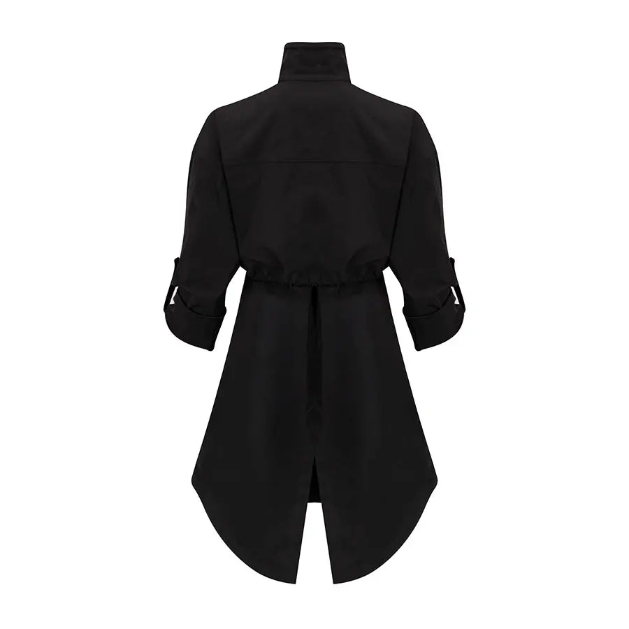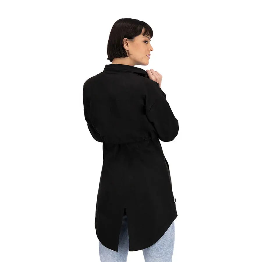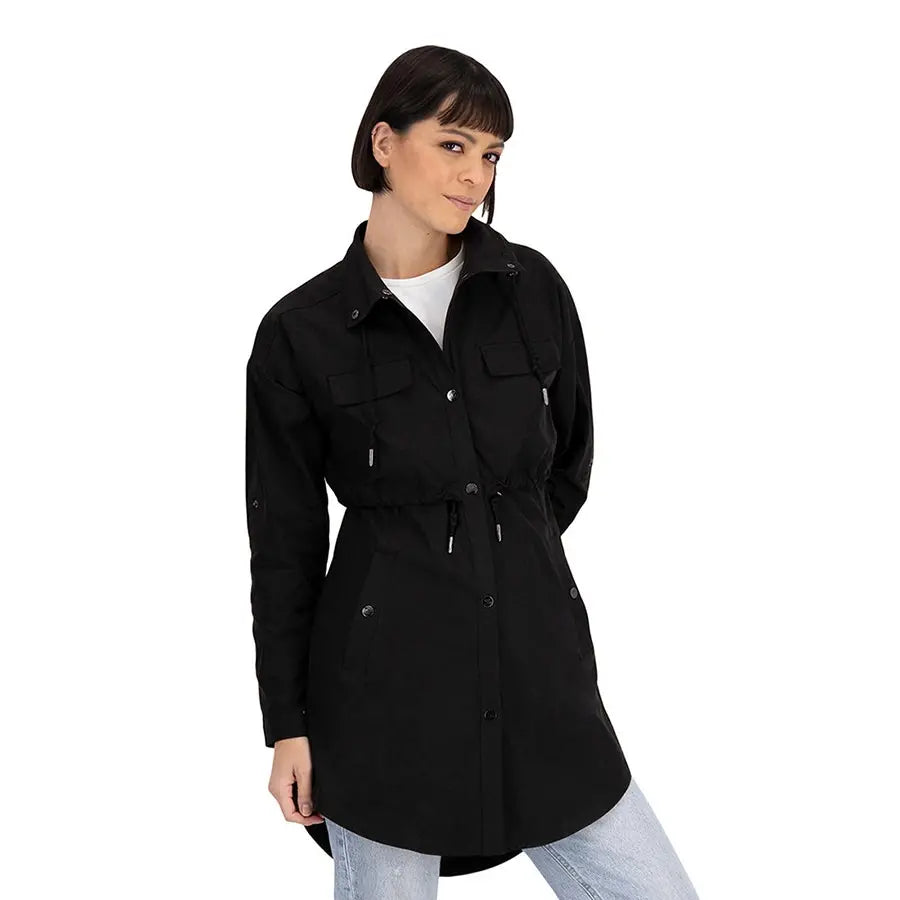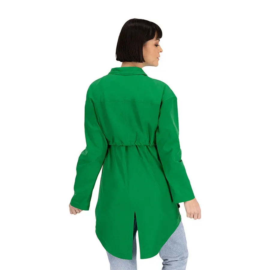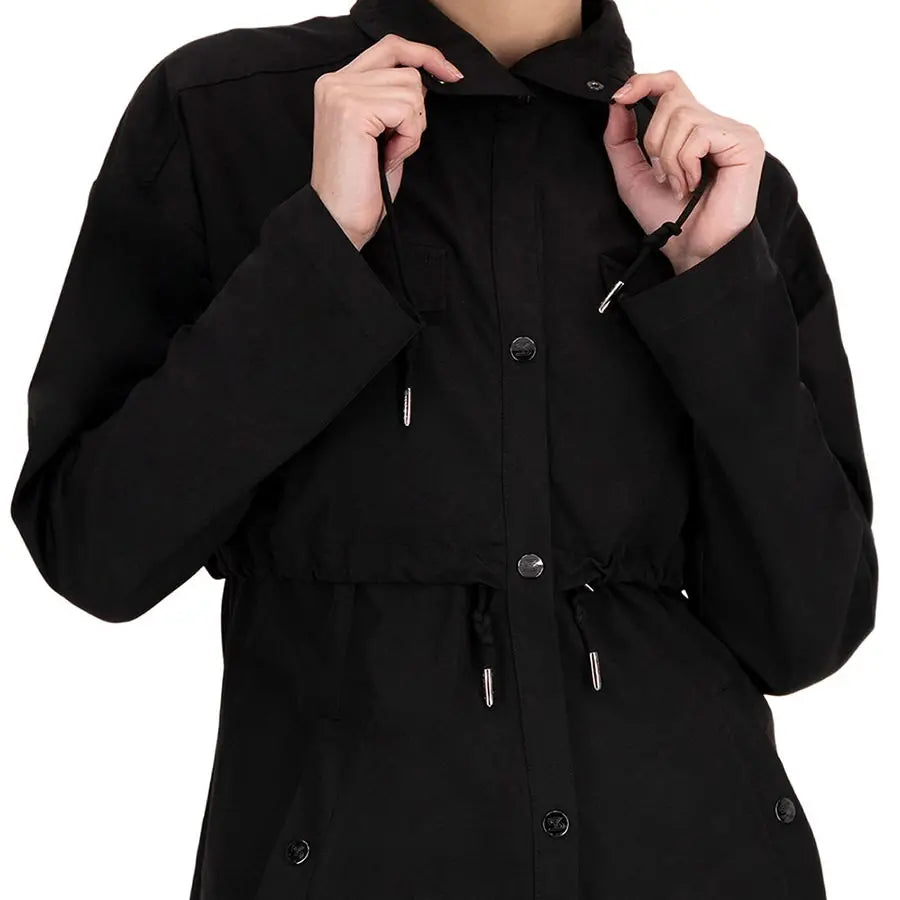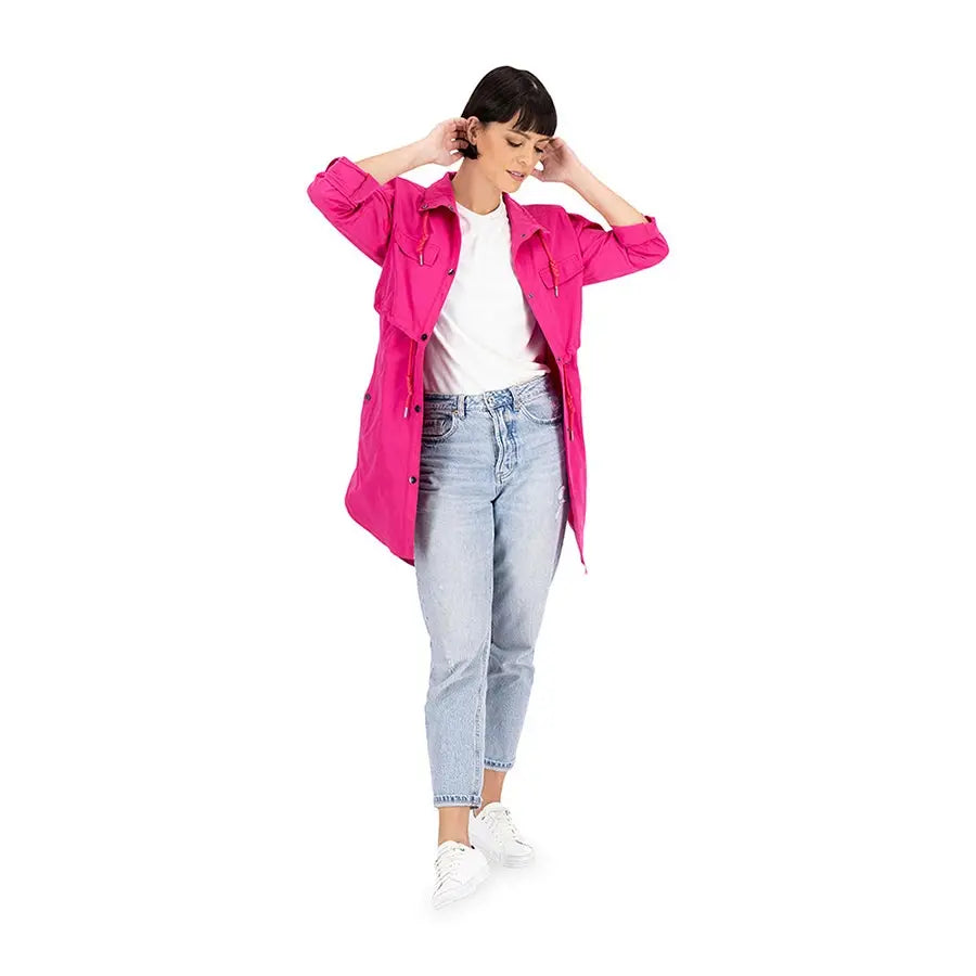 Gabardina con paneles divididos, presenta mangas con doblez ajustable y botones frontales. Cuenta con jaretas ajustables en cuello y cintura, bolsas con botón y forro de malla.